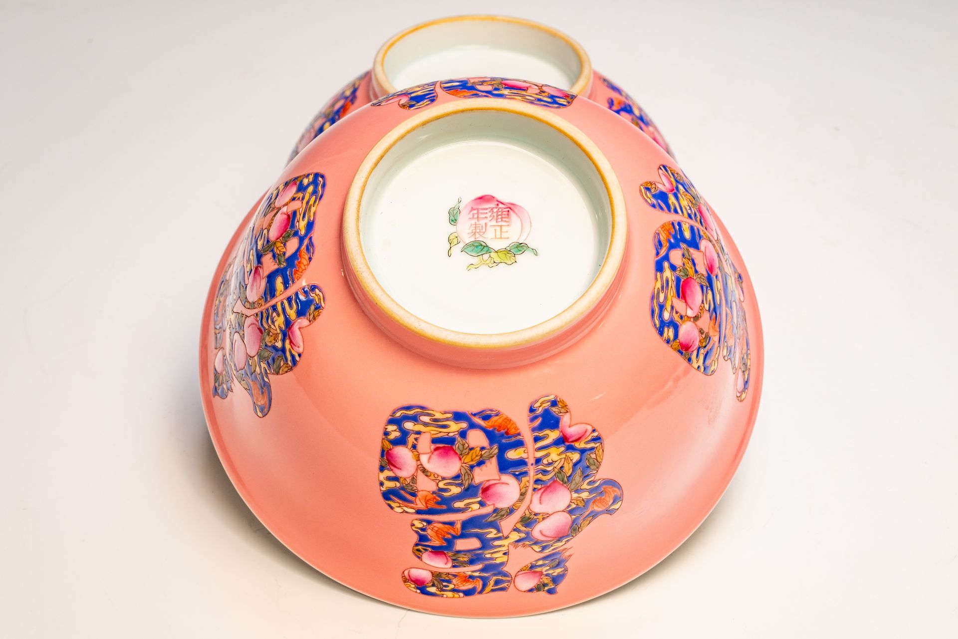 Sepasang mangkuk Yongzheng bertanda dan antik dari Dinasti Qing ini menampilkan keahlian yang luar biasa, menggunakan palet falangcai dari enamel yang cerah. Mangkuk-mangkuk ini menampilkan dasar merah muda mencolok yang dihiasi dengan empat panel biru, masing-masing berbentuk seperti aksara Tionghoa, dan menggambarkan motif kelelawar dan buah persik di dalam panel-panel tersebut. Khususnya, setiap mangkuk memiliki desain buah persik di bagian dalam dan dasarnya, ditandai dengan prasasti emas Yongzheng empat karakter yang memiliki motif buah persik tersebut. Perhatian terhadap detail terlihat jelas dalam penerapan warna, keseimbangan, dan bayangan yang cermat di seluruh bagian mangkuk ini. Mangkuk-mangkuk ini menunjukkan tanda-tanda pengelupasan pada biskuit, yang membuktikan keantikannya. Selain itu, enamel falangcai dicirikan oleh adanya crazing halus, sebuah fitur khas mangkuk ini, yang meningkatkan daya tarik estetikanya. Palet warna keseluruhan dari enamel falangcai menambah keindahan keahlian yang luar biasa ini. Setiap mangkuk Yongzheng berdiameter sekitar 6 1/4 inci. ppjrs