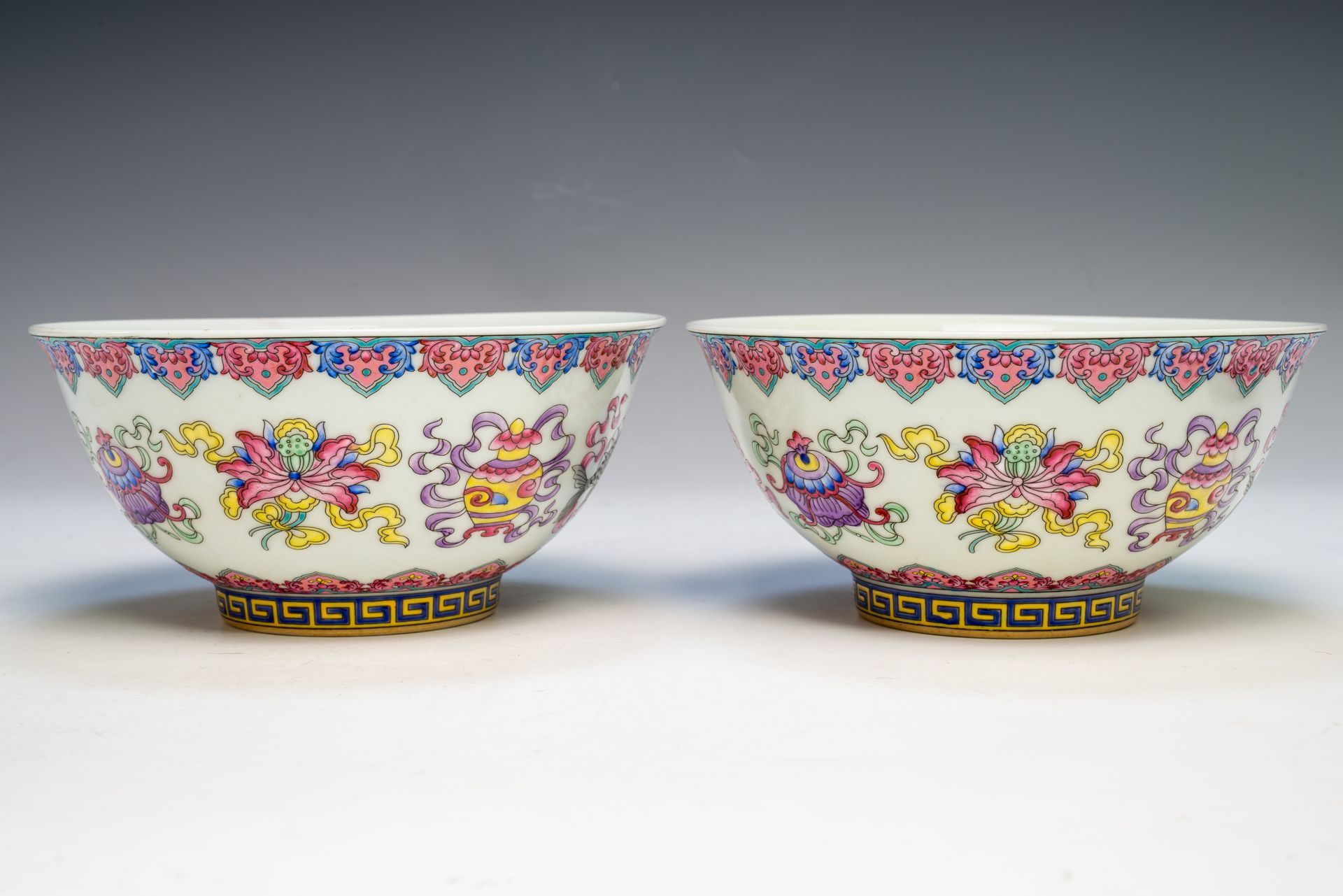 Sepasang Mangkuk Periode Yongzheng Kekaisaran Dinasti Qing Dihiasi dengan Delapan Simbol Buddha, Menampilkan Karakter Empat Biru, Tanda Yuzhi, dan Periode dalam Desain Persegi Ganda