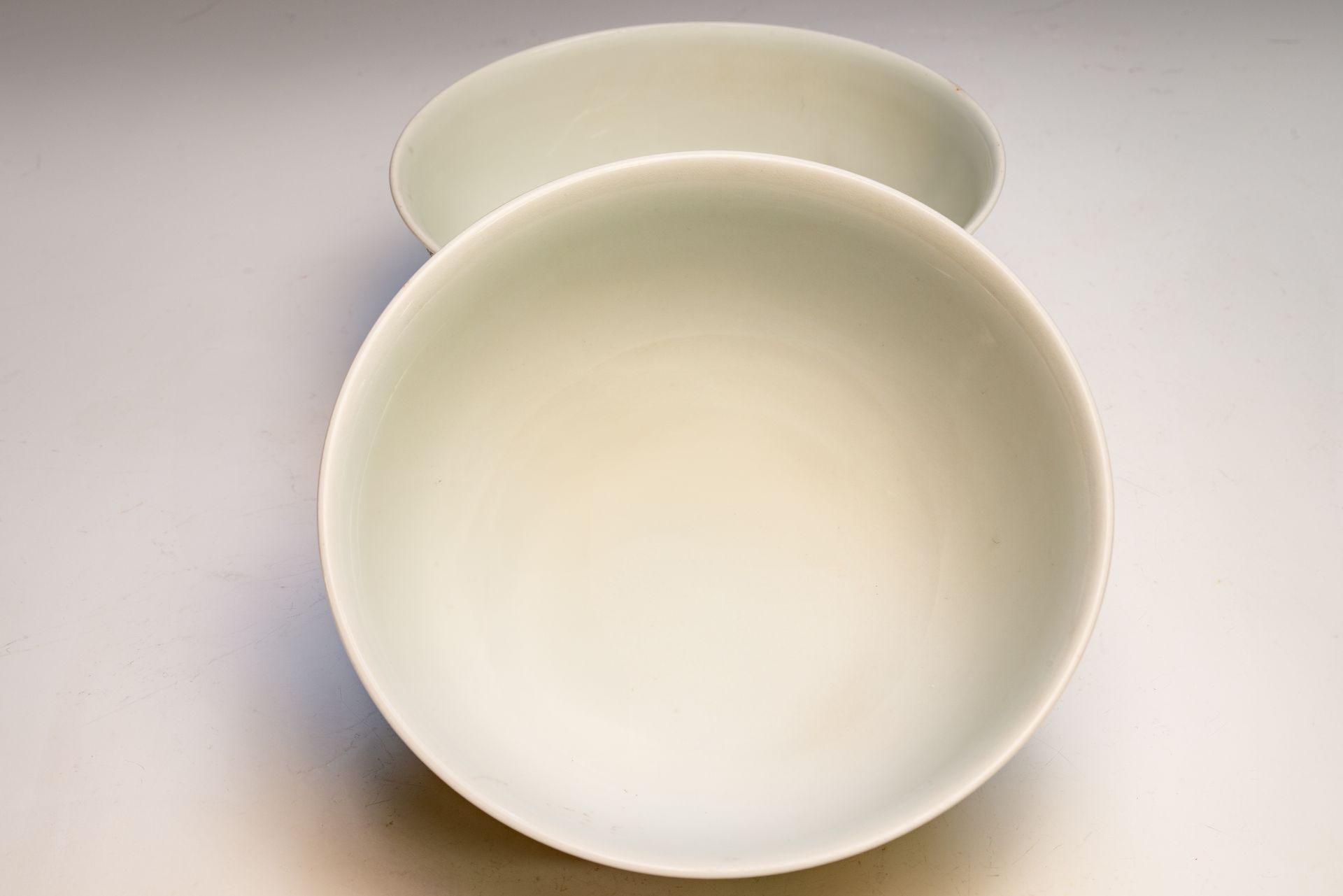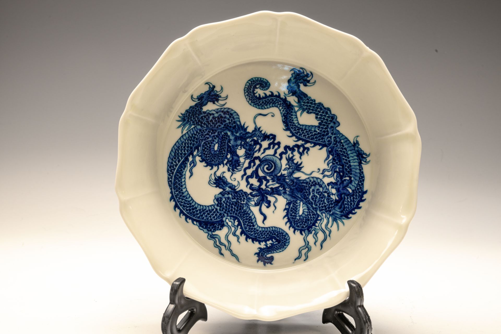 Hidangan ini, yang ditandai dan diproduksi selama periode Yongzheng di Dinasti Qing, menampilkan penggambaran naga dan burung phoenix yang halus di tengah awan yang berputar-putar. Istilah "doucai" mengacu pada teknik warna kontras, yang ditandai dengan penggunaan palet enamel khas yang lazim selama era Yongzheng. Potongan ini menunjukkan adanya serpihan pada biskuit, yang menjadi bukti keantikannya; diameternya sekitar 17 7/8 inci. ppjrs