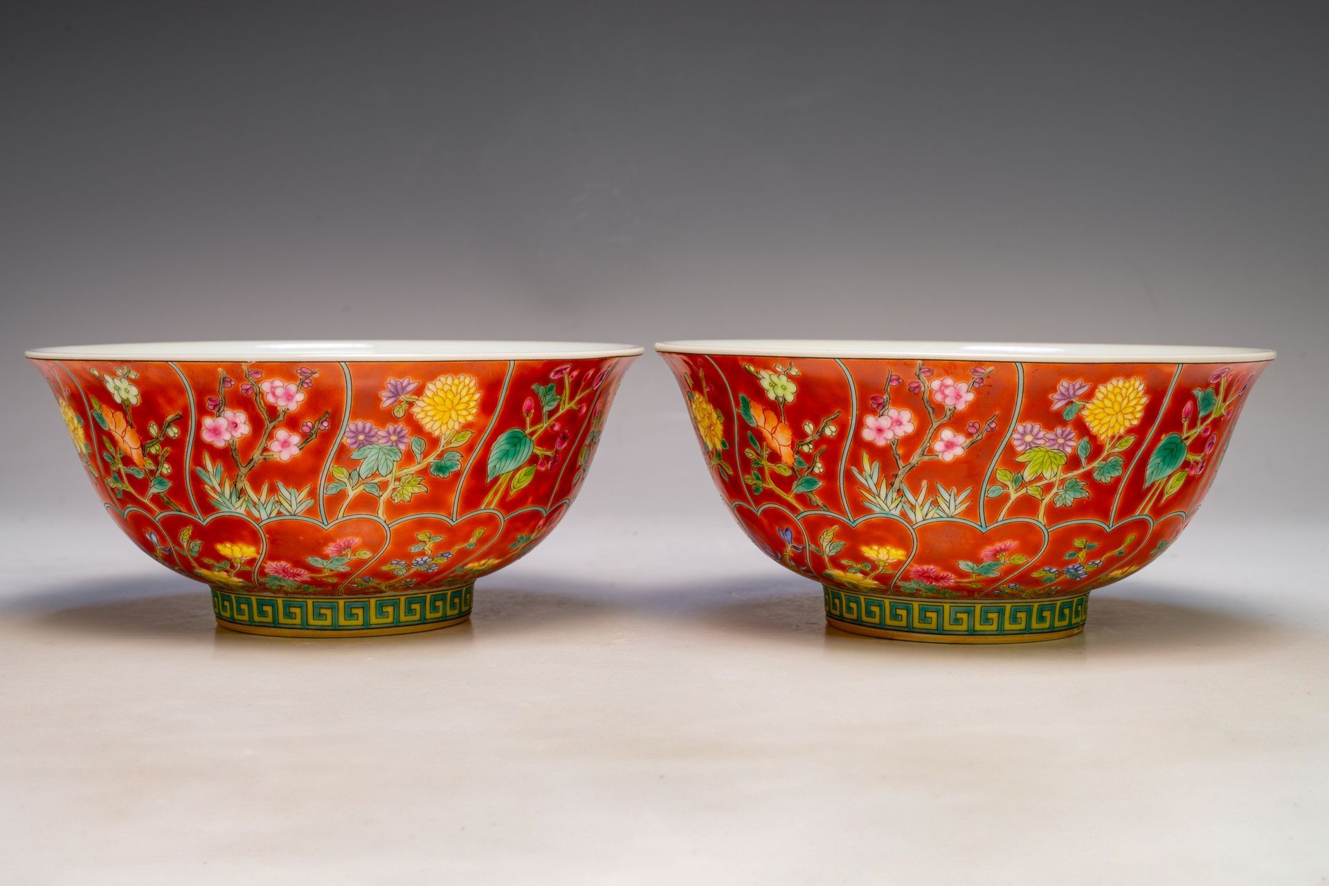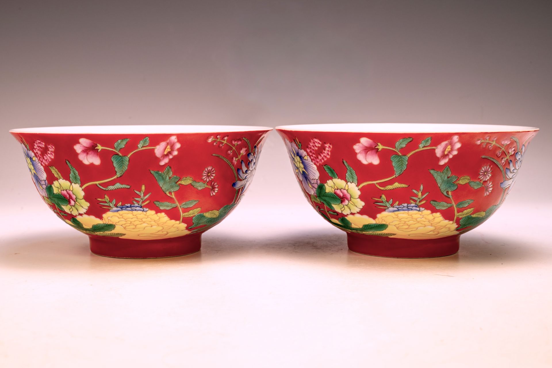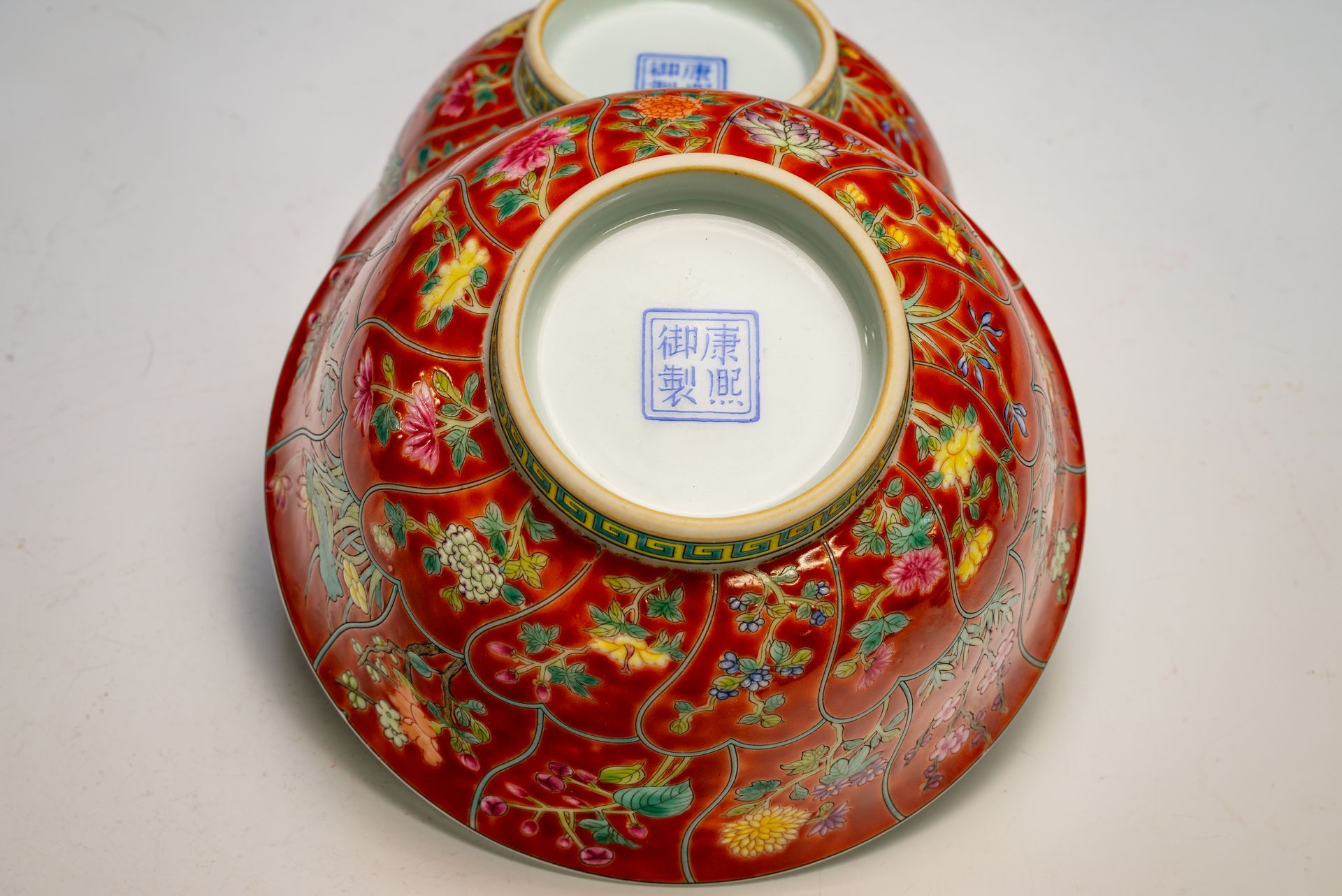 Sepasang Mangkuk Dinasti Qing dari Era Kangxi yang Dihiasi Motif Bunga, Menampilkan Enamel Falangcai dan Tanda Yuzhi Merah Tua dengan Prasasti Persegi Ganda dari Periode tersebut