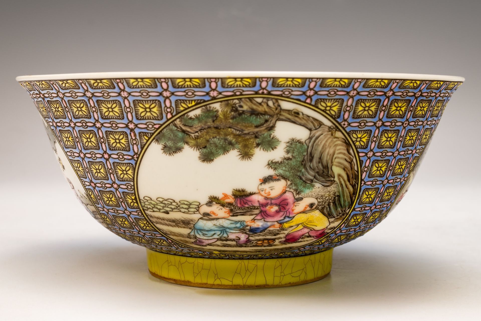 Anak-anak Zaman Kangxi Bermain dengan Mangkuk Berhias Falangcai Bergambar Empat Karakter Yuzhi Biru di Kotak Ganda