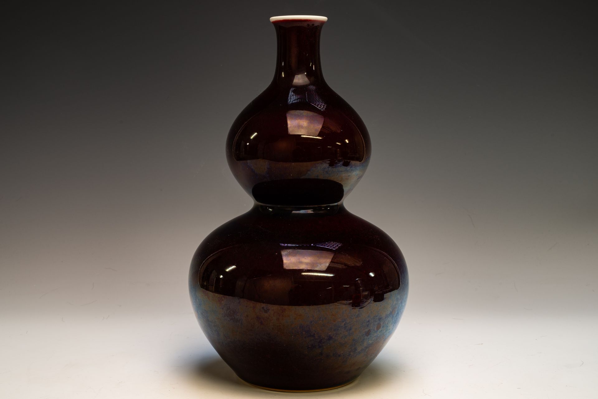 Vas berbentuk labu ganda dari periode Yongzheng Dinasti Qing ini dibuat dengan sangat istimewa, menampilkan rona ceri hitam yang sangat indah. Vas ini memiliki proporsi yang baik dan menunjukkan teknik tembikar berkualitas tinggi. Vas ini memiliki tanda Yongzheng empat karakter di bagian dasarnya, yang menunjukkan periode tersebut, dan terdapat tanda pembakaran besi di cincin kakinya. Selain itu, adanya serpihan pada biskuit menunjukkan usianya yang tua. Vas ini berukuran sekitar 11 1/8 inci (30,5 cm). ppjrs