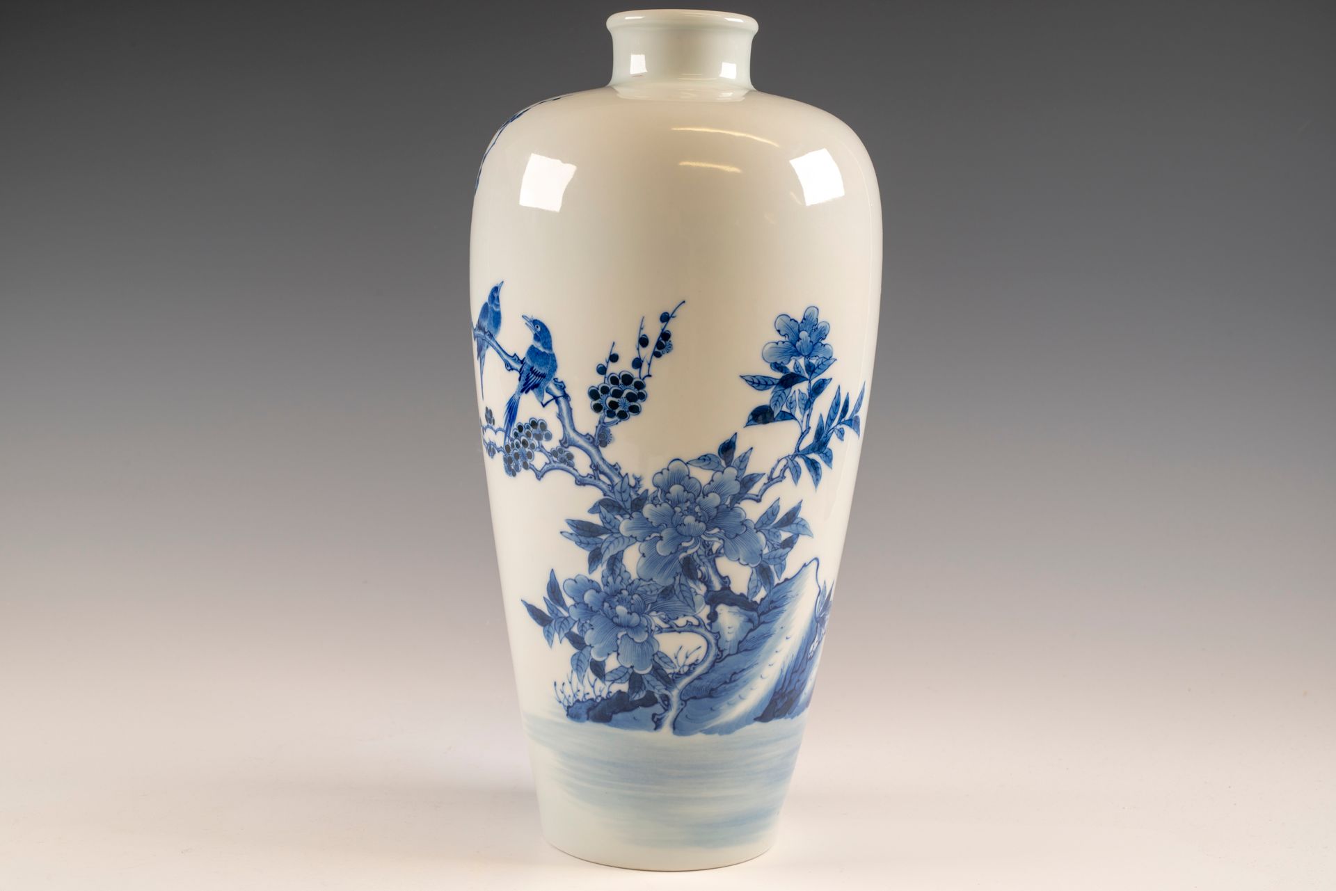Vas Kangxi dari Dinasti Qing ini, yang dikenal karena keasliannya yang khas, menampilkan bentuk yang halus dan representatif pada masanya. Vas biru-putih ini dihiasi secara elegan dengan motif batu, bunga peony, dan dua burung murai yang bertengger di dahan, dilengkapi dengan tulisan puisi di sisi sebaliknya. Ketelitian terhadap detail, keseimbangan tonal, dan bayangan sangat penting untuk memahami karakteristik yang mendefinisikan contoh porselen biru-putih Kangxi yang unggul. Vas ini menampilkan enam karakter bertanda Kangxi di bawah glasir yang terlampir dalam lingkaran ganda di dasarnya. Karya teladan ini telah dibuat dengan sangat ahli dan berukuran tinggi sekitar 12 5/8 inci. ppjrs
