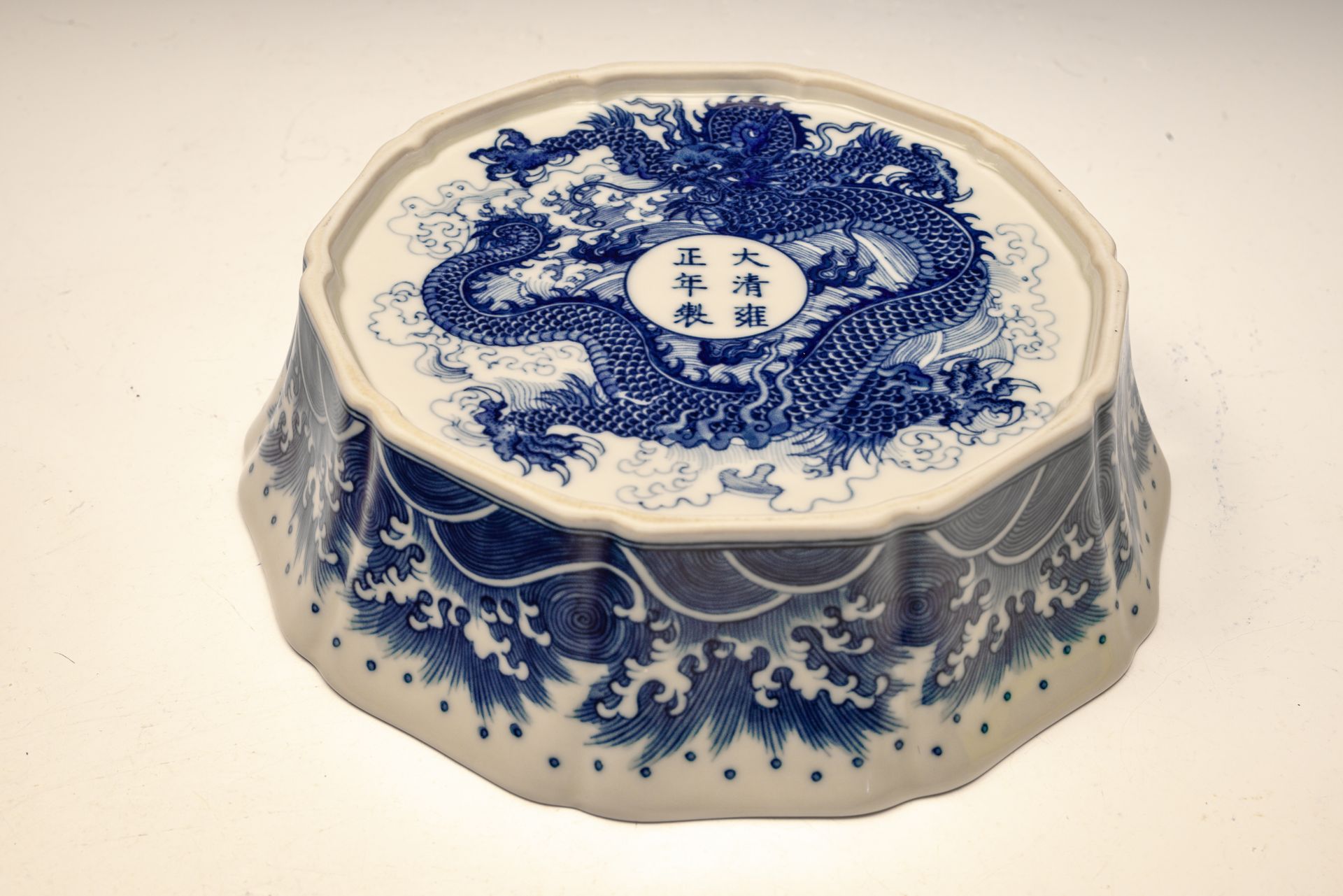 Cincin sikat berlobus biru dan putih yang istimewa ini, ditandai dan diproduksi selama periode Yongzheng di Dinasti Qing, merupakan contoh seni dan keahlian yang luar biasa. Karya ini menampilkan detail yang rumit, dengan bagian dalamnya menampilkan dua naga yang saling berhadapan melingkari mutiara yang menyala. Bagian luarnya dihiasi dengan pola gelombang yang dibuat dengan sangat teliti, sementara bagian dasarnya dihiasi dengan seekor naga tunggal di tengah gelombang, melingkari enam karakter Yongzheng dalam sebuah lingkaran yang terpisah. Perhatian seniman yang luar biasa terhadap detail terlihat jelas dalam pengaplikasian kobalt yang presisi, serta komposisi dan bayangan yang seimbang yang diterapkan di seluruh karya. Cincin sikat Yongzheng ini berdiameter sekitar 7 3/4 inci. ppjrs