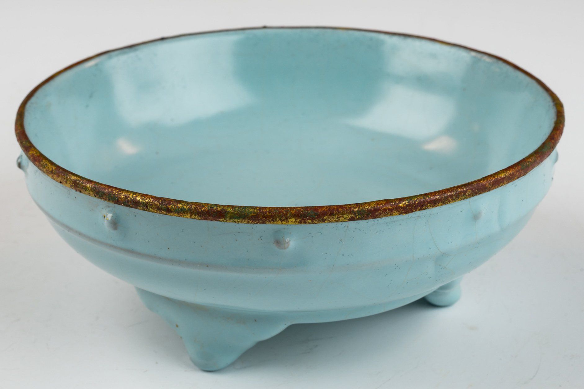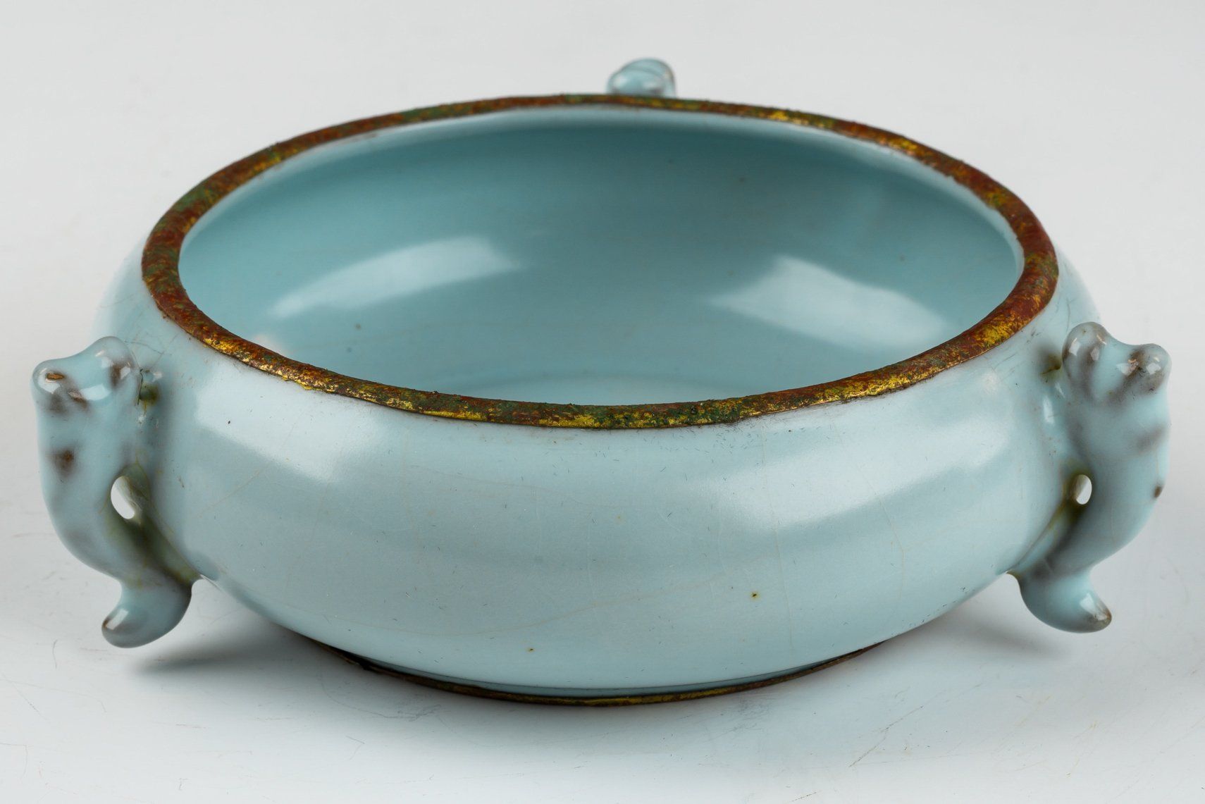 Mesin cuci sikat tribute Ru-ware berlapis glasir biru langit yang sangat halus ini memiliki tiga gagang yang dirancang elegan. Glasirnya menunjukkan tekstur yang luar biasa lembut dan halus, tanpa adanya batu akik dalam campuran glasirnya. Baik tepi maupun dasarnya dikelilingi oleh pita berlapis emas api yang terbuat dari tembaga. Perlu dicatat bahwa barang-barang Ru-ware yang dihiasi pita berlapis emas api ini secara khusus diproduksi sebagai upeti untuk Kaisar dan istananya. Pita tembaga berlapis emas ini telah mengalami sedikit pembersihan, menunjukkan korosi berlapis-lapis berupa kuprit kemerahan dan malakit hijau. Pemeriksaan mikroskopis yang menyertainya membuktikan tidak adanya batu akik dalam glasir, sementara pita tembaga berlapis emas menunjukkan tanda-tanda korosi kuprit dan malakit yang terlihat jelas. Bukti tersebut menunjukkan usia benda yang signifikan dan berfungsi sebagai ukuran yang lebih andal daripada uji termoluminesensi (TL), sebagaimana diakui oleh para ahli di bidangnya untuk menentukan keaslian artefak—karakteristik ini tak ada bandingannya. Pencuci sikat dihiasi tiga gagang naga dan memiliki lima tanda taji, masing-masing seukuran biji wijen. Dengan diameter sekitar 5 3/8 inci, karya luar biasa ini berasal dari koleksi Peralatan Dinasti Song Utara milik Kaisar Huizong yang masih ada.