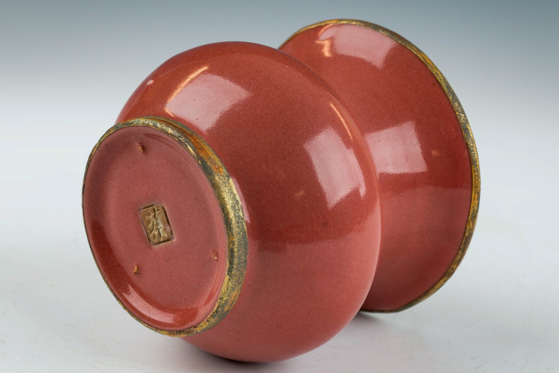 Sebuah tempolong berlapis glasir merah dari Dinasti Song Utara yang dibuat dengan sangat baik dan estetis, merupakan contoh seni dari periode ini. Bejana ini, yang dibuat sebagai penghormatan kepada Kaisar dan istananya, menampilkan pita tembaga berlapis emas api yang diukir dengan rumit, melingkari tepi dan dasarnya. Pita-pita ini menunjukkan korosi berlapis kuprit kemerahan dan malakhit botrioidal hijau, yang menunjukkan usia yang sangat tua. Pemeriksaan mikroskopis memastikan tidak adanya akik di dalam glasir, memperkuat keaslian karya yang sangat indah ini. Pita tembaga berlapis emas yang dipegang dengan jelas menunjukkan pola korosi kuprit dan malakhit, yang berfungsi sebagai indikator usia yang lebih andal daripada uji termoluminesensi (TL); bukti semacam itu diakui secara universal oleh para ahli sebagai ukuran definitif keaslian sebuah artefak, yang tahan terhadap pemalsuan. Bejana ini dihiasi dengan glasir merah tua yang menunjukkan pola retakan halus yang dapat diamati dengan pembesaran, di samping tekstur yang sangat halus. Bagian dasarnya ditandai dengan tiga tanda taji kecil, seukuran biji wijen, dan disertai ukiran tanda penghormatan. Artefak luar biasa ini berdiameter sekitar 4 1/8 inci dan merupakan bagian dari koleksi artefak Ru Ware kekaisaran yang masih ada dari masa pemerintahan Kaisar Huizong.