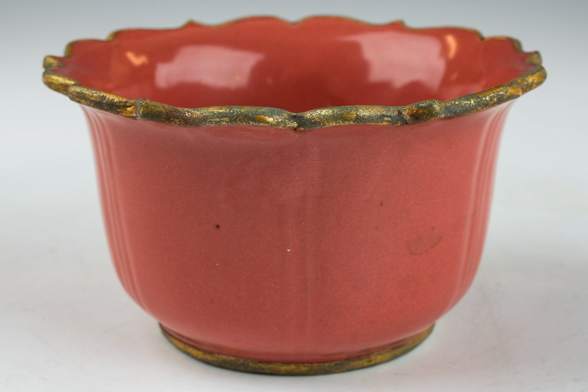 Mangkuk glasir merah dari Dinasti Song Utara yang dibuat dengan sangat baik ini menampilkan desain daun teratai yang mengesankan. Ditujukan sebagai mangkuk penghormatan bagi Kaisar dan istananya, mangkuk ini dihiasi dengan pita tembaga berlapis emas yang mengelilingi tepi dan dasarnya. Pita-pita ini menunjukkan korosi kuprit berlapis dan malachite botryoidal hijau, yang menunjukkan usia dan keasliannya yang signifikan. Foto-foto mikroskopis yang menyertainya memperkuat tidak adanya batu akik di dalam glasir, faktor penting dalam mengautentikasi benda tersebut. Korosi yang terlihat pada pita tembaga berlapis emas semakin memvalidasi asal usulnya, menawarkan keandalan yang melampaui pengujian termoluminesensi (TL) konvensional, sebuah metode yang digunakan oleh para ahli untuk menetapkan keaslian artefak. Mangkuk ini juga menampilkan pola retakan halus yang dapat diamati di bawah pembesaran, sementara glasirnya memiliki tekstur halus tanpa batu akik. Bagian bawahnya memiliki tiga tanda taji kecil, kira-kira seukuran biji wijen. Karya luar biasa ini berukuran sekitar 5 inci diameternya dan merupakan bagian dari koleksi yang masih ada dari Peralatan Ru Kekaisaran Song Utara. ppjrs
