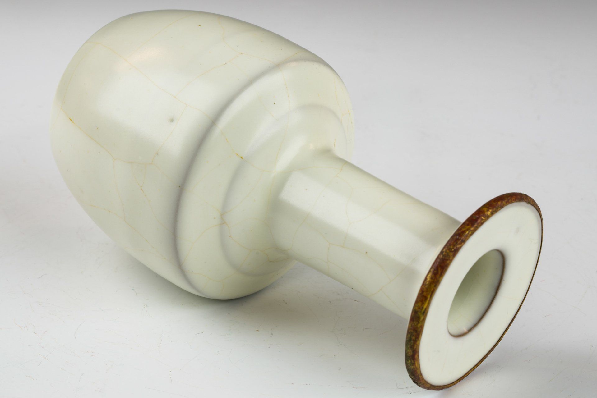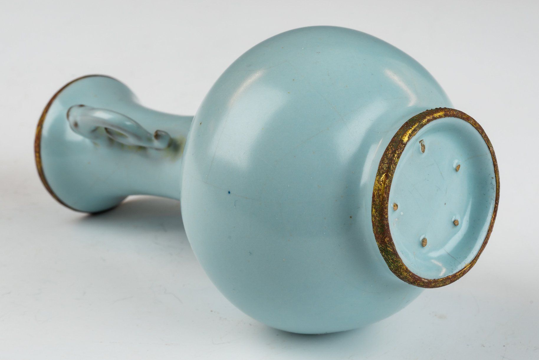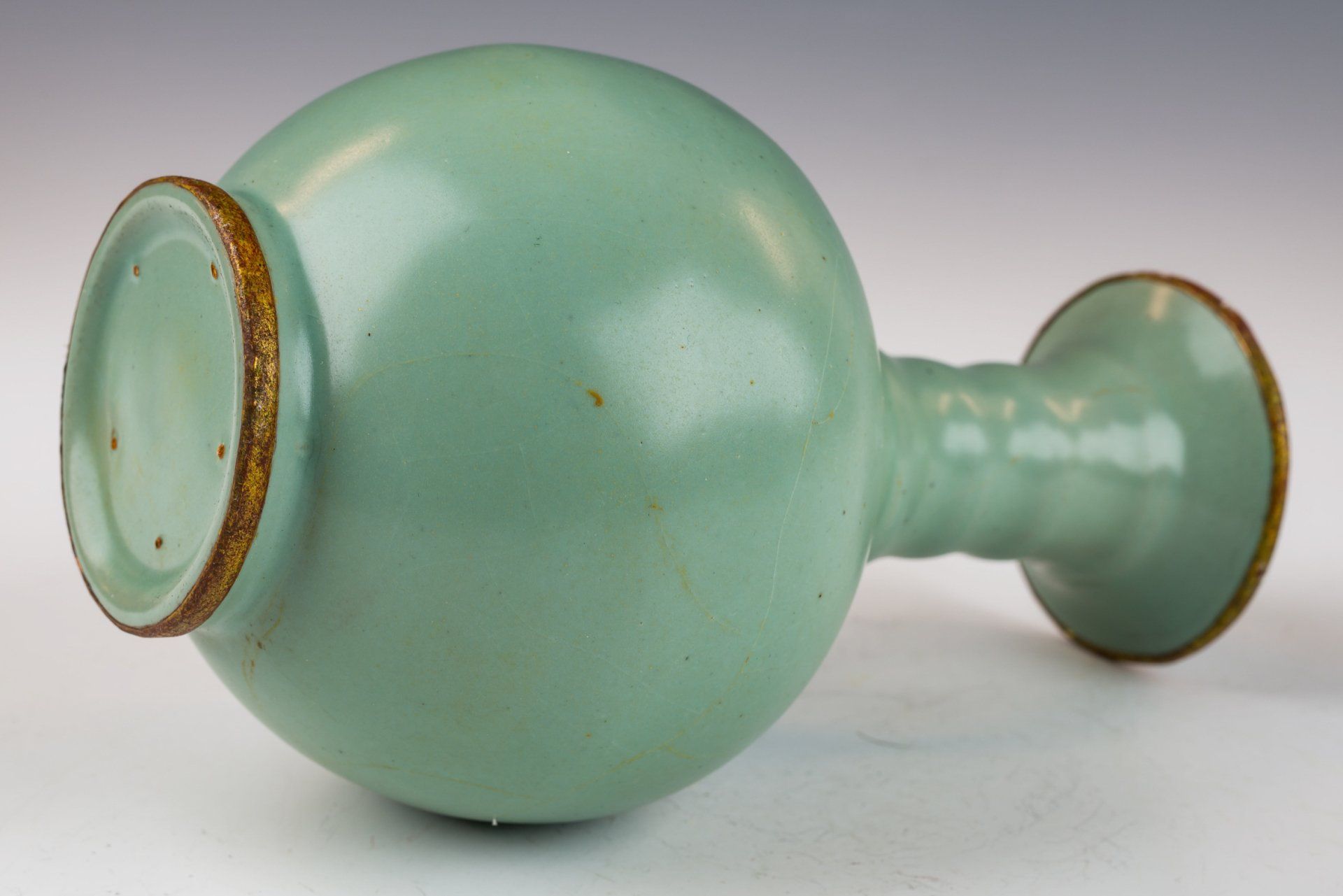 Vas glasir seladon pucat Dinasti Song Utara yang dibuat dengan sangat baik ini merupakan contoh seni pada masanya. Dianggap sebagai sebuah penghormatan bagi Kaisar dan Istananya, vas ini dihiasi dengan pita tembaga berlapis emas api di tepi dan dasarnya, memperlihatkan korosi berlapis dari kuprit kemerahan dan malachite botryoidal kehijauan. Analisis mikroskopis yang menyertainya menegaskan tidak adanya batu akik di dalam glasir, dan adanya korosi yang terlihat pada pita tembaga berlapis emas semakin memperkuat usianya yang cukup tua, memberikan otentikasi yang lebih andal daripada pengujian termoluminesensi. Kriteria tersebut diakui sebagai definitif oleh para ahli di bidangnya, karena tidak dapat diproduksi secara replikasi. Vas ini memiliki glasir seladon pucat yang menampilkan pola retakan halus dan tekstur yang sangat halus, menegaskan kembali tidak adanya batu akik. Dasar vas menampilkan tiga tanda taji kecil, seukuran biji wijen. Dengan tinggi sekitar 4,5 inci, artefak luar biasa ini merupakan bagian dari koleksi yang masih ada terkait dengan Peralatan Makan Kekaisaran Song Utara milik Kaisar Huizong. ppjrs