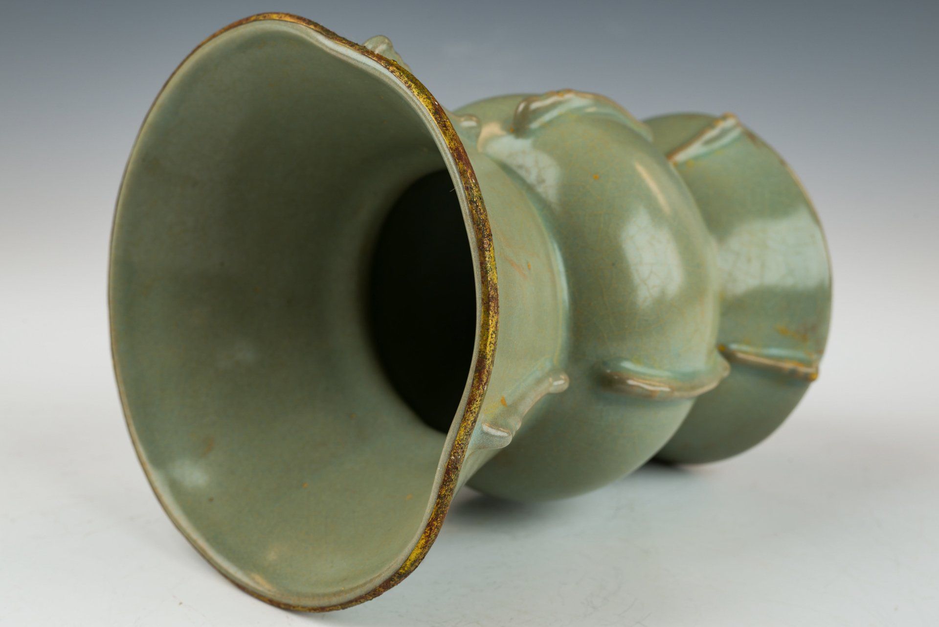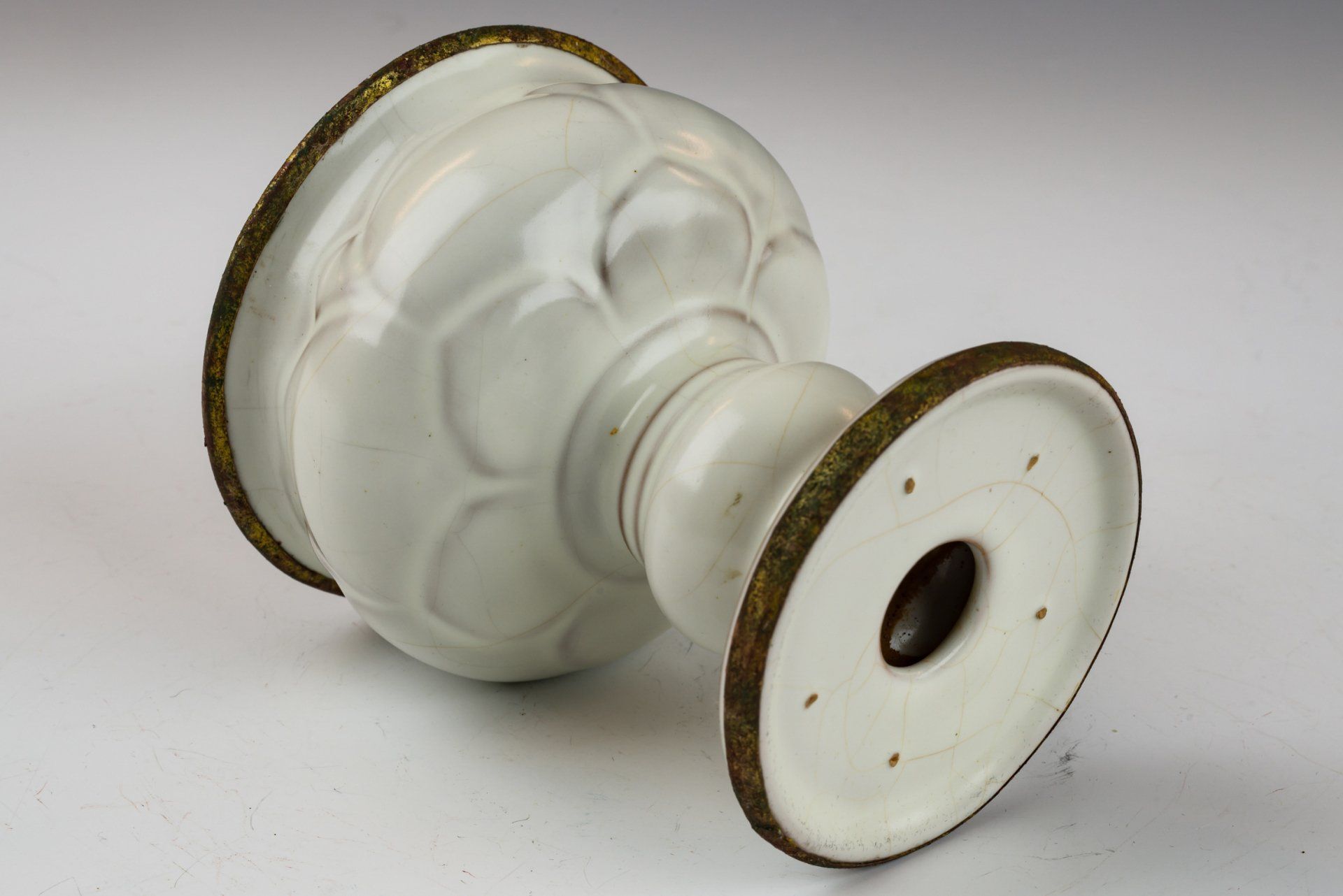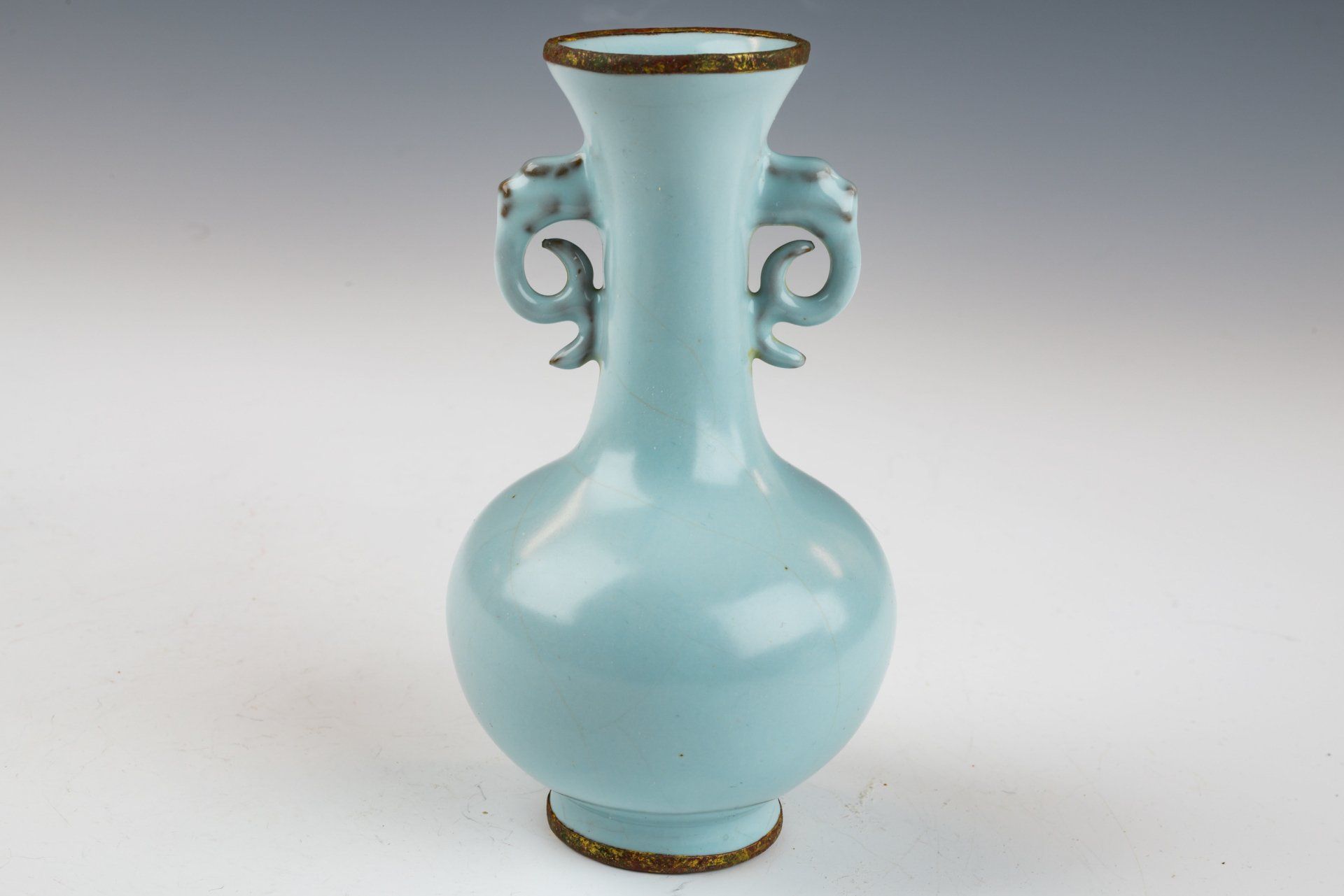 Vas glasir seladon pucat Dinasti Song Utara yang dibuat dengan sangat baik ini merupakan contoh seni pada masanya. Dianggap sebagai sebuah penghormatan bagi Kaisar dan Istananya, vas ini dihiasi dengan pita tembaga berlapis emas api di tepi dan dasarnya, memperlihatkan korosi berlapis dari kuprit kemerahan dan malachite botryoidal kehijauan. Analisis mikroskopis yang menyertainya menegaskan tidak adanya batu akik di dalam glasir, dan adanya korosi yang terlihat pada pita tembaga berlapis emas semakin memperkuat usianya yang cukup tua, memberikan otentikasi yang lebih andal daripada pengujian termoluminesensi. Kriteria tersebut diakui sebagai definitif oleh para ahli di bidangnya, karena tidak dapat diproduksi secara replikasi. Vas ini memiliki glasir seladon pucat yang menampilkan pola retakan halus dan tekstur yang sangat halus, menegaskan kembali tidak adanya batu akik. Dasar vas menampilkan tiga tanda taji kecil, seukuran biji wijen. Dengan tinggi sekitar 4,5 inci, artefak luar biasa ini merupakan bagian dari koleksi yang masih ada terkait dengan Peralatan Makan Kekaisaran Song Utara milik Kaisar Huizong. ppjrs