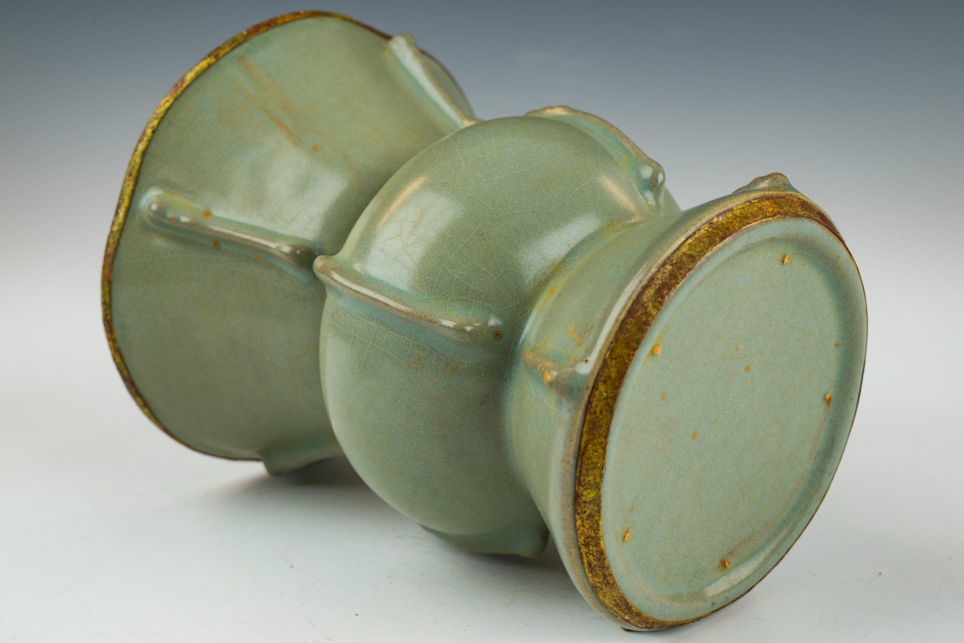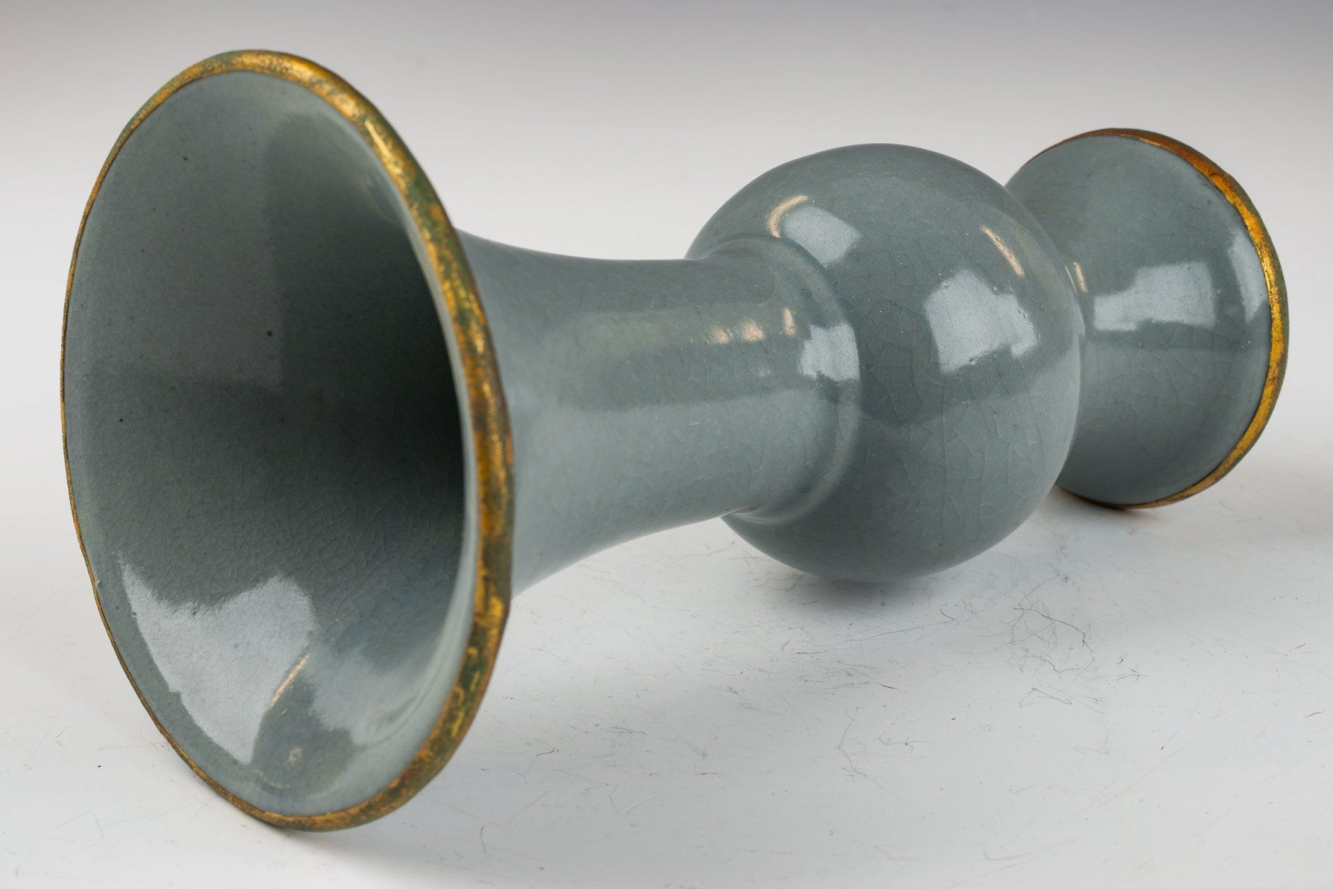 Vas glasir seladon dari Dinasti Song Utara yang dibuat dengan sangat indah ini merupakan penghormatan yang luar biasa bagi Kaisar dan istananya. Vas ini menampilkan pita tembaga berlapis emas api yang diaplikasikan dengan sangat teliti di sekitar tepi dan dasarnya, yang menunjukkan bukti sedikit pembersihan, di samping korosi berlapis yang terdiri dari kuprit kemerahan dan malachite kehijauan. Foto-foto mikroskopis yang menyertainya membuktikan bahwa glasir tersebut bebas dari batu akik, sementara juga mengungkapkan korosi yang terlihat pada pita tembaga berlapis emas. Bukti empiris ini menawarkan indikasi yang lebih andal tentang keaslian vas daripada uji TL, sebuah metodologi yang diakui oleh para ahli di bidangnya. Vas ini ditandai dengan glasir abu-abu kebiruan yang halus dengan rona kehijauan yang khas dan hasil akhir retakan halus yang indah. Tekstur glasir yang halus semakin menegaskan tidak adanya batu akik. Selain itu, bagian bawah vas menunjukkan tanda-tanda taji lima menit yang mirip dengan ukuran biji wijen. Dengan tinggi sekitar 6 1/4 inci, karya ini adalah sisa indah dari koleksi terkenal Kaisar Huizong berupa Peralatan Kekaisaran Song Utara. ppjrs