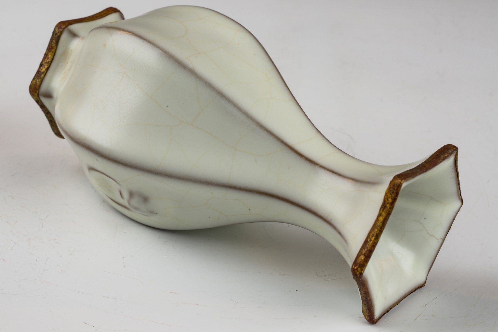 Vas penghormatan yang indah ini mewujudkan ciri khas Ru-ware, menampilkan bentuk heksagonal yang dibuat dengan sangat halus dan glasir putih rembulan yang sangat halus. Khususnya, formulasi glasirnya tidak mengandung batu akik, memastikan keasliannya dan kepatuhannya pada teknik produksi tradisional. Menghiasi bagian atas dan bawah vas terdapat dua pita tembaga berlapis emas api yang elegan, ciri khas yang biasanya digunakan untuk barang-barang penghormatan yang dipersembahkan kepada Kaisar dan istananya. Pita-pita ini menunjukkan beberapa tanda pembersihan, memperlihatkan lapisan korosi yang mengindikasikan kuprit kemerahan dan malachite hijau, yang semakin memperkuat signifikansi historisnya. Analisis mikroskopis yang menyertainya telah mengonfirmasi tidak adanya batu akik di dalam glasir, dan korosi yang terlihat pada pita tembaga berlapis emas semakin memperkuat usia vas. Bukti tersebut dianggap lebih andal daripada uji termoluminesensi dan banyak digunakan oleh para ahli untuk menentukan keaslian artefak, sehingga replikasi menjadi tidak mungkin dilakukan. Vas ini juga memiliki ciri khas gagang berbentuk cincin dan lima tanda taji kecil, yang menyerupai biji wijen baik dalam bentuk maupun ukuran. Dengan tinggi sekitar 15 cm, karya luar biasa ini berasal dari koleksi Ru-ware yang masih ada yang dikaitkan dengan Kaisar Huizong dari Dinasti Song Utara. ppjrs