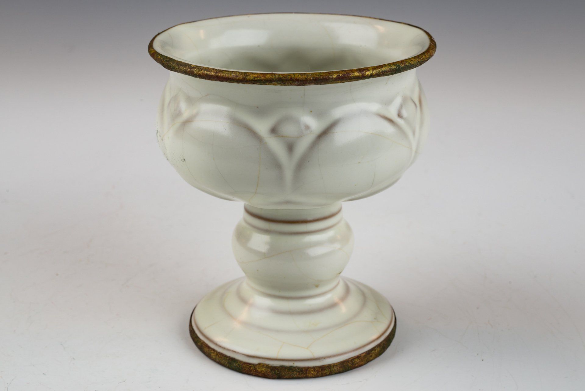 Cangkir tangkai penghormatan yang terhormat ini, dibuat dengan glasir putih terang bulan yang luar biasa halus, ciri khas Ru-ware, menghadirkan sentuhan akhir yang indah dan halus tanpa akik dalam komposisi glasirnya. Cangkir ini memiliki pita tembaga berlapis emas api yang melingkari tepi dan dasarnya, yang menunjukkan statusnya sebagai benda penghormatan kepada Kaisar dan istananya. Khususnya, pita berlapis emas api tersebut menunjukkan sisa-sisa pembersihan yang cermat dan menunjukkan korosi berlapis-lapis, termasuk kuprit kemerahan dan malachit hijau, yang menjadi bukti nyata usia cangkir yang cukup tua. Citra mikroskopis yang menyertainya memperkuat ketiadaan akik di dalam glasir, sekaligus menunjukkan korosi yang nyata pada pita tembaga berlapis emas. Metode analisis ini dianggap lebih andal daripada uji termoluminesensi (TL) dan diterima secara luas oleh para ahli untuk mengautentikasi artefak, karena tidak dapat direplikasi secara artifisial. Cangkir tangkai dihiasi dengan lima tanda taji kecil, yang bentuk dan ukurannya menyerupai biji wijen. Dengan tinggi sekitar 4 1/4 inci, karya ini berasal dari timbunan Peralatan Kekaisaran Song Utara yang masih ada yang dipesan oleh Kaisar Huizong. ppjrs