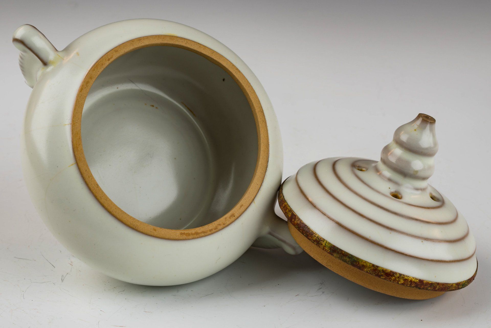 Pembakar tribute Ru-ware yang sangat halus ini menampilkan glasir putih Moonlight yang mencolok, ditandai dengan teksturnya yang lembut dan halus. Glasirnya bebas dari akik, dan tutupnya dihiasi dengan elegan dengan pita tembaga berlapis emas api. Pita berlapis emas api ini merupakan ciri khas barang-barang persembahan yang dipesan untuk Kaisar dan istananya. Pita tembaga berlapis emas api ini telah mengalami pembersihan minimal, memperlihatkan korosi berlapis pada kuprit kemerahan dan malachite hijau, yang semakin memperkuat signifikansi historisnya. Gambar mikroskopis yang menyertainya memverifikasi tidak adanya akik dalam glasir, sementara pita berlapis emas menunjukkan korosi yang terlihat—bukti usianya yang cukup tua. Metode pemeriksaan ini dianggap lebih andal daripada pengujian Termoluminesensi (TL) dan merupakan standar yang digunakan oleh para ahli untuk memastikan keaslian artefak, memastikan bahwa benda ini tidak dapat dipalsukan. Selain itu, pembakar ini menampilkan lima tanda taji kecil, masing-masing menyerupai bentuk dan ukuran biji wijen. Pembakar upeti yang luar biasa ini tingginya sekitar 4,5 inci dan merupakan bagian dari koleksi yang masih ada dari Kekaisaran Song Utara Kaisar Huizong, Ru-Ware.