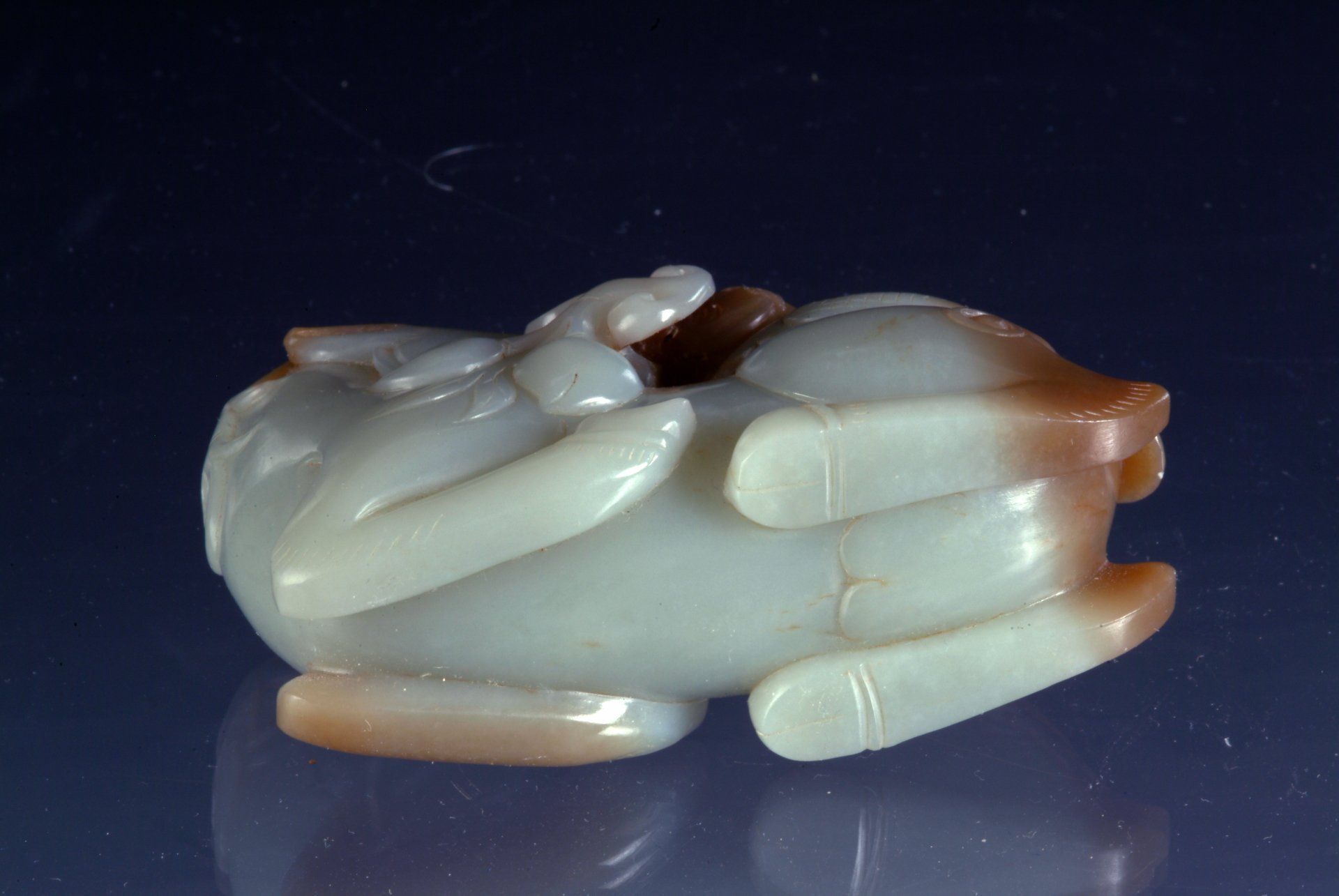 Patung rusa yang sedang beristirahat ditemani seekor burung yang indah ini terbuat dari batu giok hijau keabu-abuan, ciri khas periode Enam Dinasti. Area-area bercak cokelat yang mencolok, beserta gaya ukirannya yang khas, menjadi indikator keaslian historisnya. Patung ini berukuran sekitar 7,5 cm.
