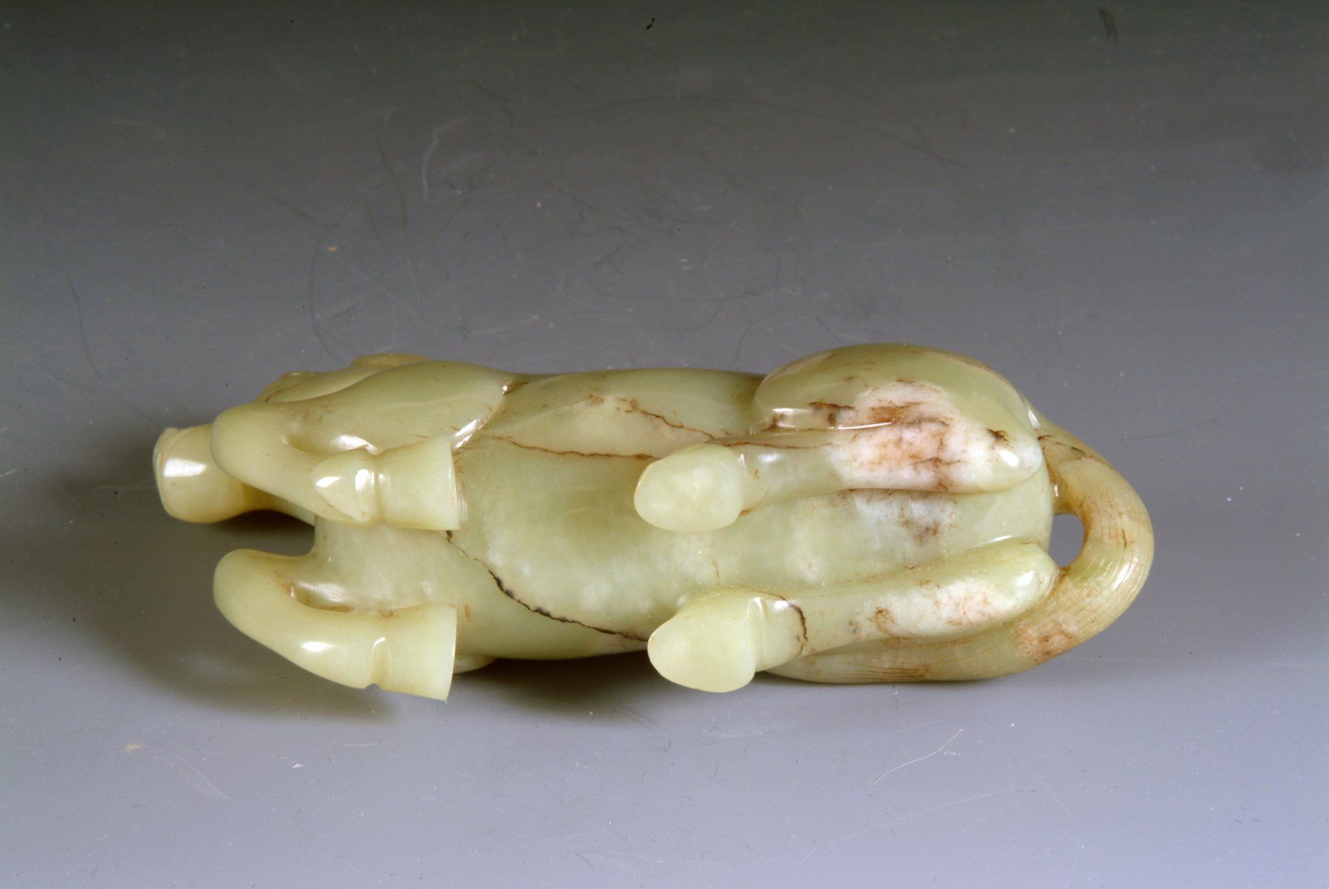 Patung kuda beristirahat dari periode Enam Dinasti yang terbuat dari batu giok seladon yang sangat indah ini menampilkan inklusi pola sungai dan awan berwarna cokelat yang mencolok, yang menjadi indikator asal dan usianya. Patung ini berukuran panjang sekitar 4,5 inci.