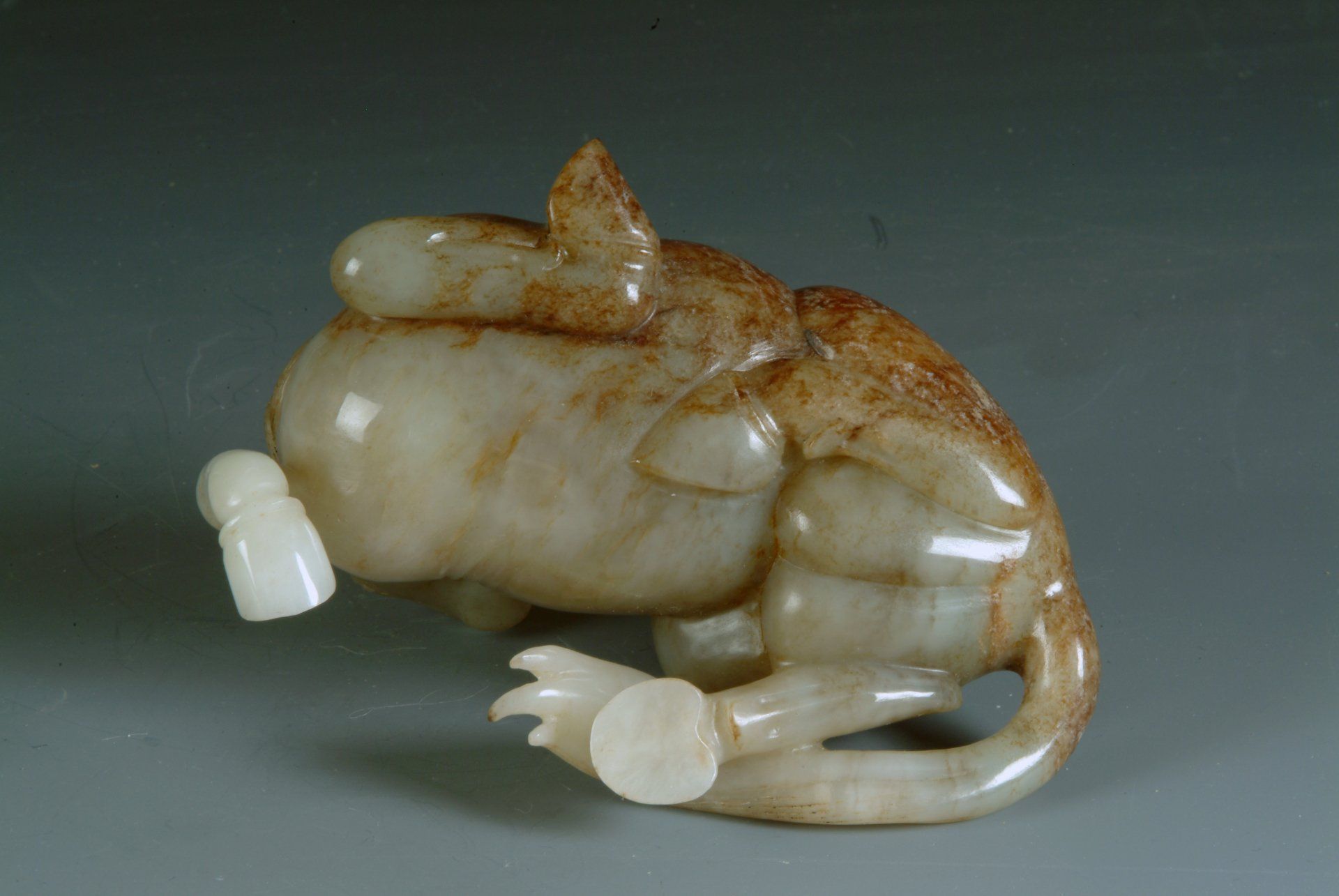 Patung Domba Jantan Beristirahat dengan Bayi dari Batu Giok Keabu-abuan Kehijauan Enam Dinasti, yang dibedakan dengan bercak-bercak coklat mencolok yang membuktikan keantikannya, berukuran panjang sekitar 3 1/4 inci.