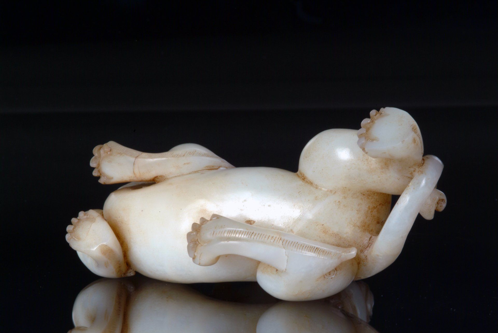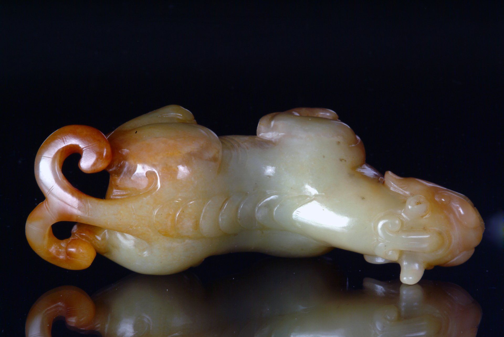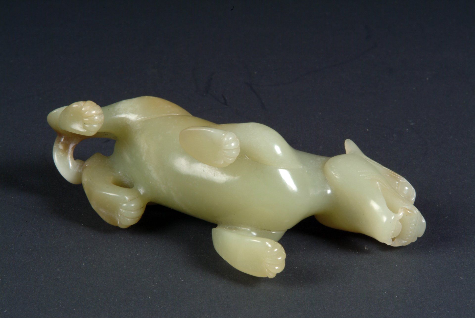 Patung giok seladon pucat berukir indah dari Dinasti Song ini menggambarkan makhluk mitos yang menyerupai anggota keluarga kucing, dalam posisi istirahat. Tiga kakinya sejajar, sementara satu kaki lainnya terselip di bawah tubuh. Patung ini merupakan contoh keahlian yang luar biasa, dengan material seladon pucatnya yang tembus cahaya, menampilkan sungai, urat, dan inklusi berwarna cokelat tua yang rumit, yang membuktikan usianya. Dimensi patung adalah