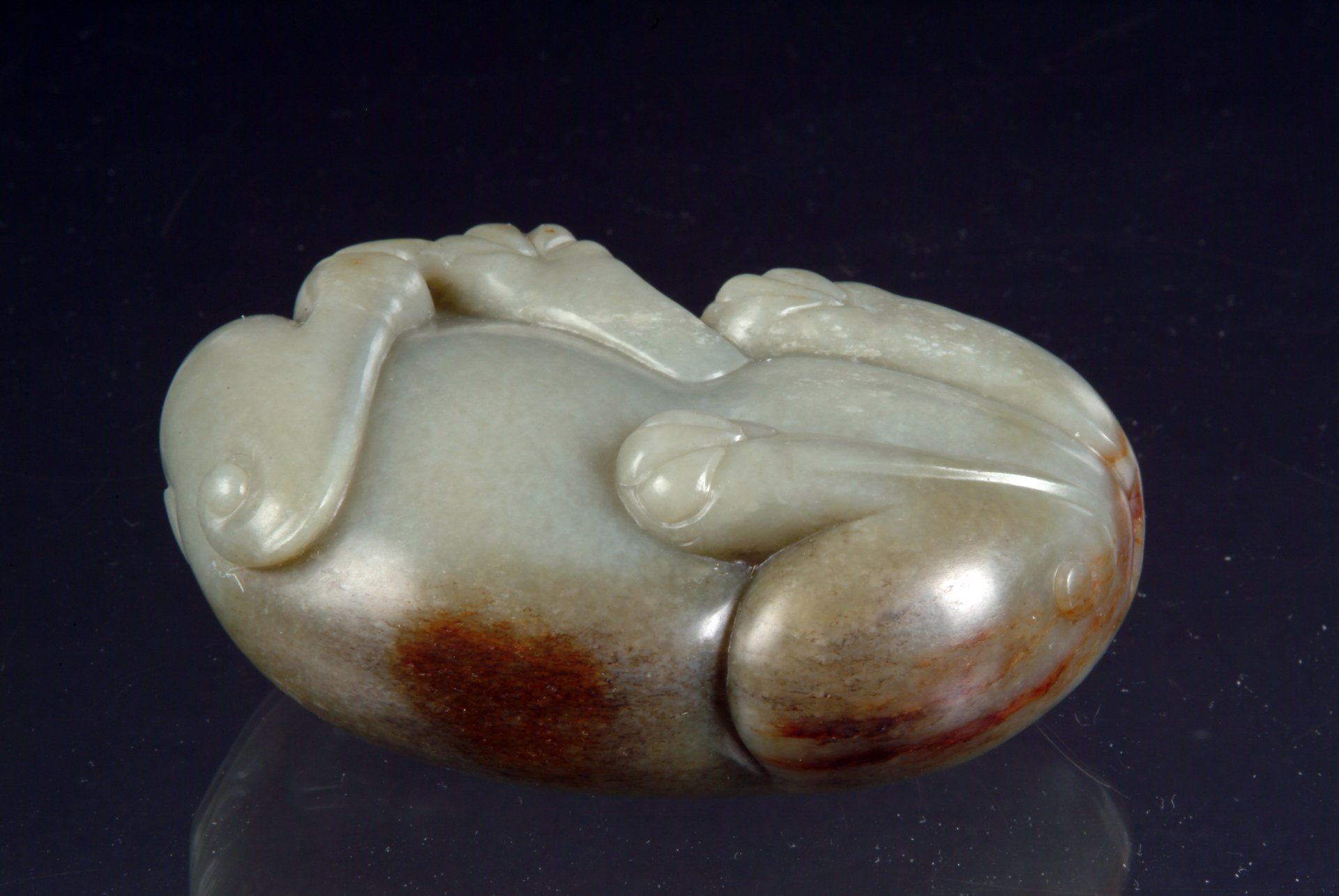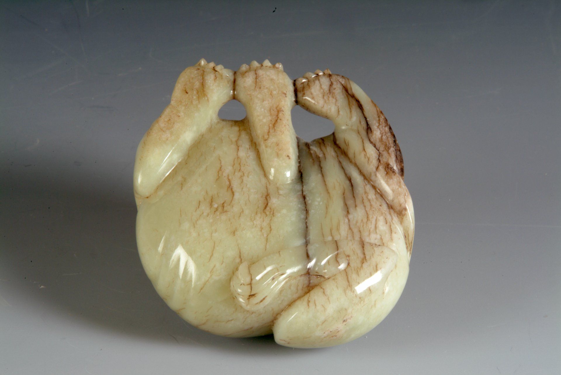 Patung giok abu-abu kehijauan dari Dinasti Song yang diukir dengan sangat teliti ini, menggambarkan seekor binatang mistis, dengan area bercak kecokelatan yang semakin menegaskan usia dan keasliannya. Gaya ukiran yang presisi, yang merupakan ciri khas periode tersebut, semakin memperkuat makna historisnya. Panjang patung ini sekitar 8,5 cm.