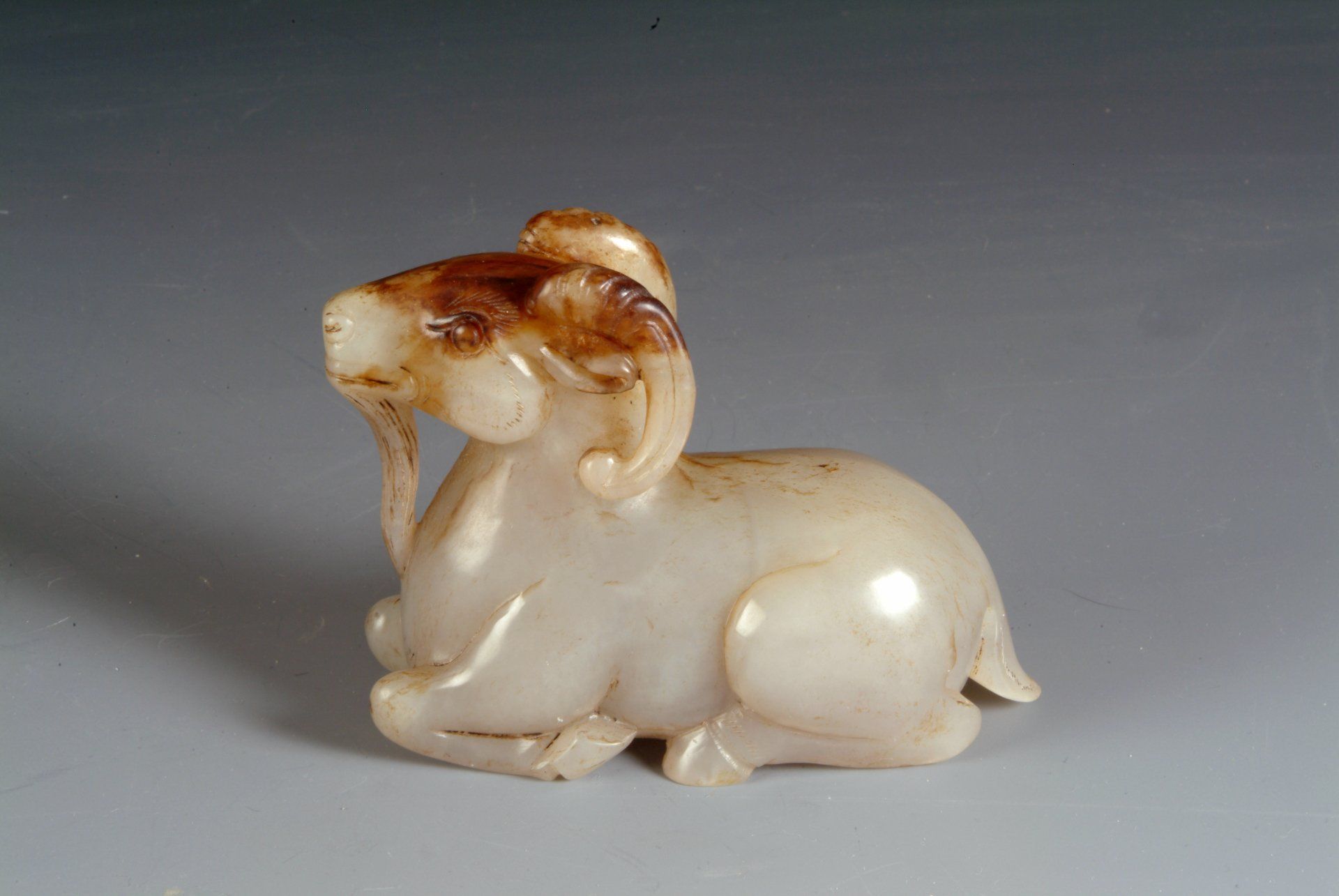 Patung domba jantan berbaring dari Dinasti Ming, terbuat dari batu giok putih keabu-abuan yang diukir halus ini memiliki inklusi cokelat yang luas dan gaya ukiran yang menunjukkan periode sejarahnya. Patung ini berukuran