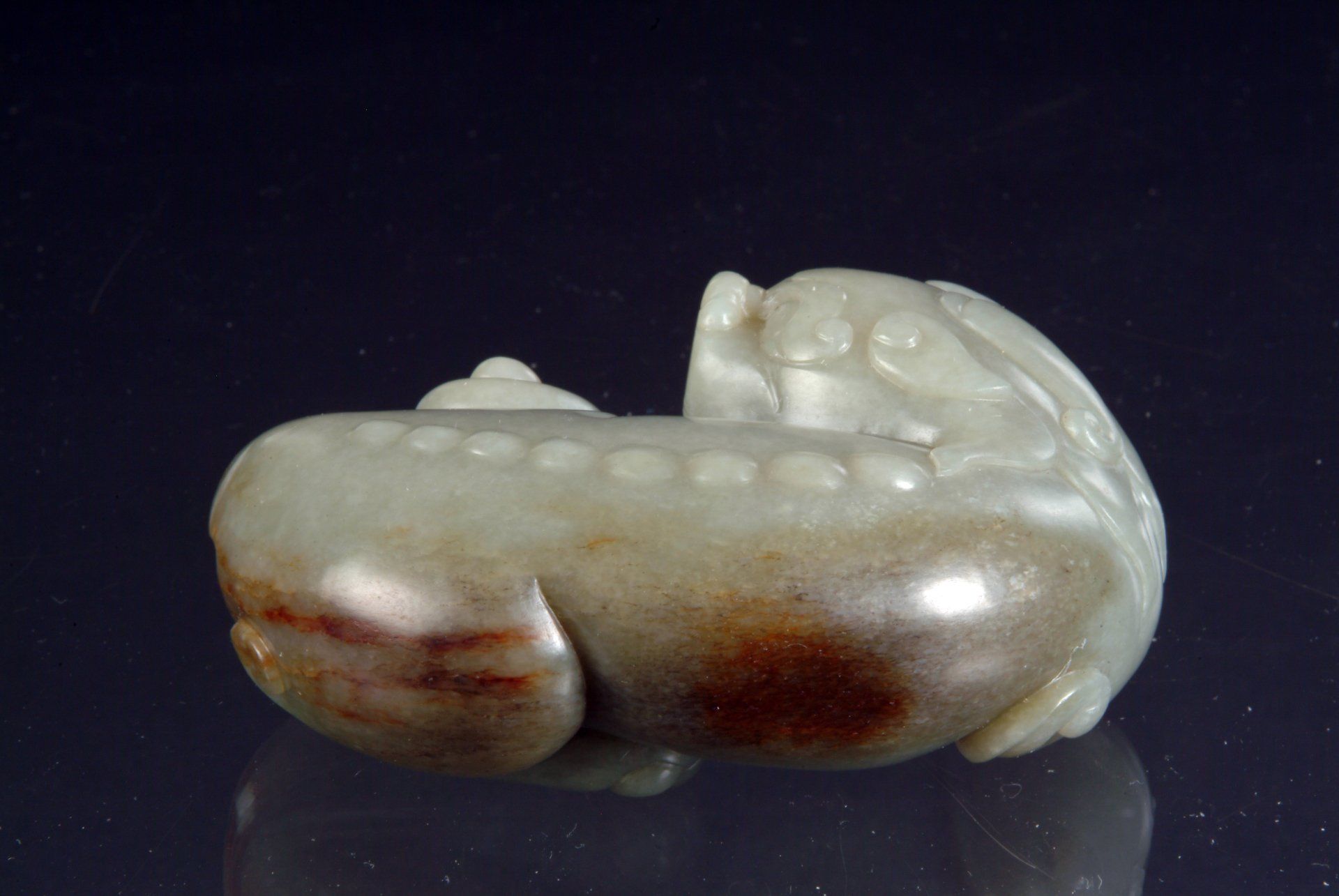 Ukiran indah ini menampilkan representasi giok seladon pucat dari makhluk mitos bertanduk menanjak, ditandai dengan ekor terbelah dan struktur tulang belakang yang sangat detail. Giok ini menunjukkan inklusi russet yang signifikan, dan pengerjaannya mencerminkan asal-usul historisnya, yang menegaskan usianya. Ukurannya