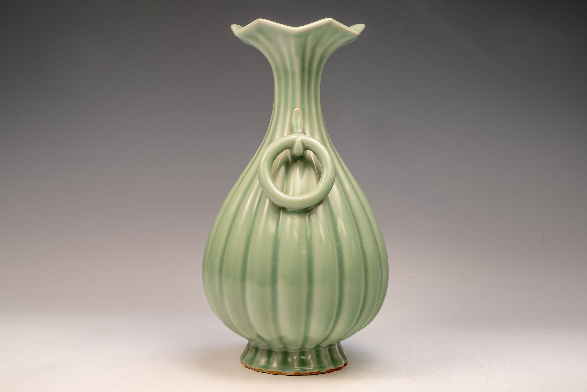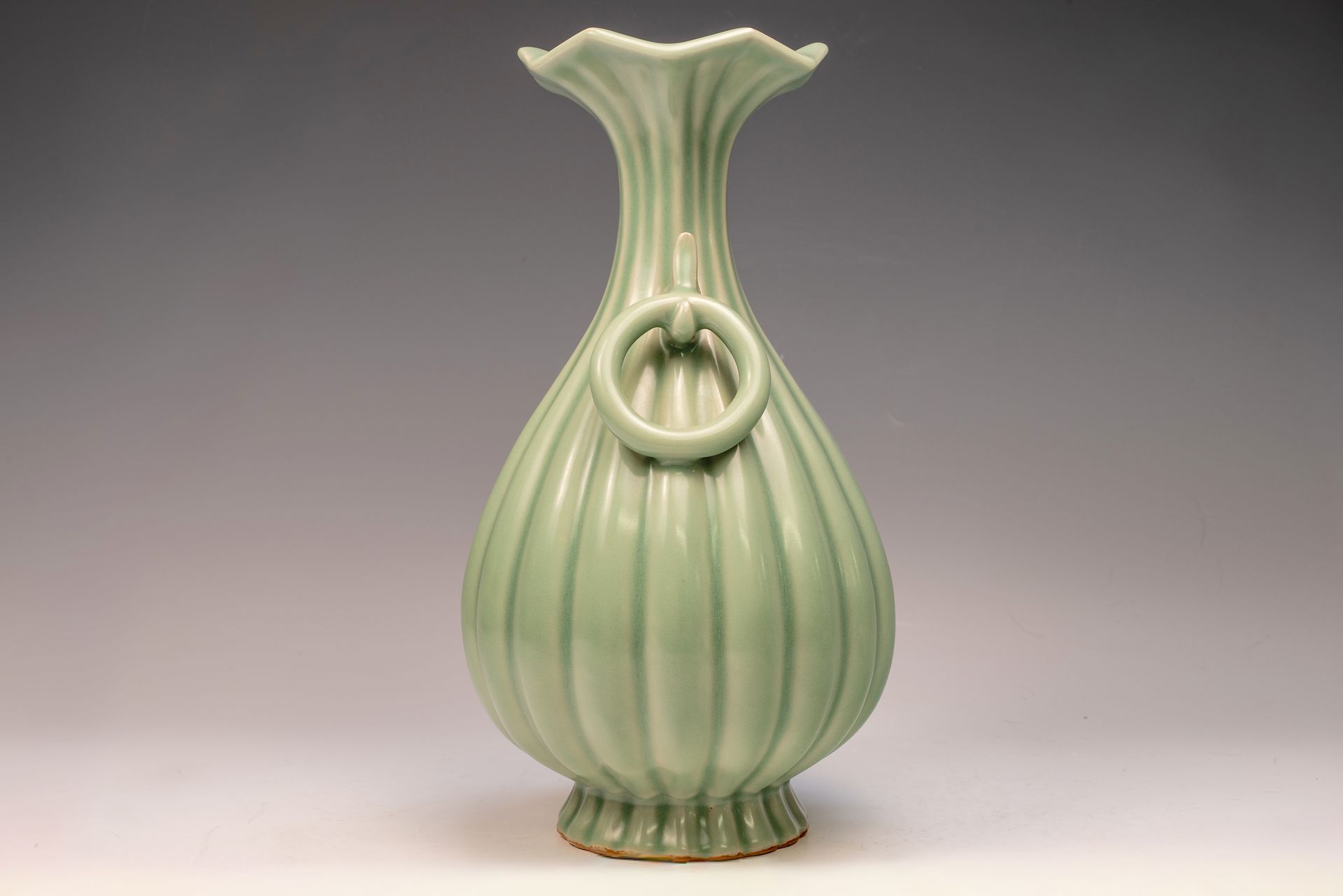 Second Commissioned Ribbed Flower Bud Vase Featuring Ring Handles from the Imperial Ru Kiln of the Northern Song Dynasty
