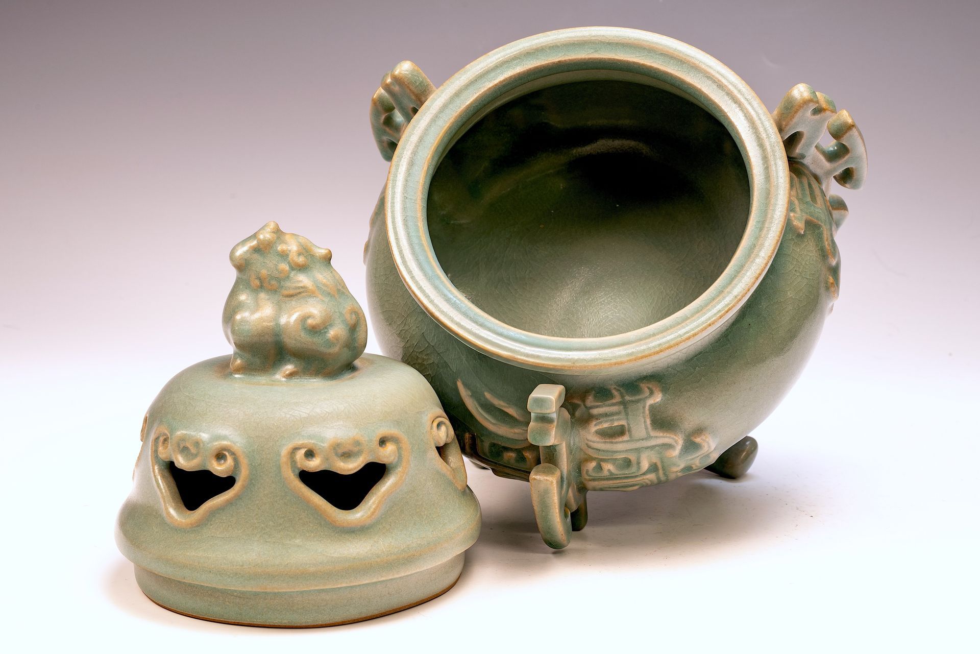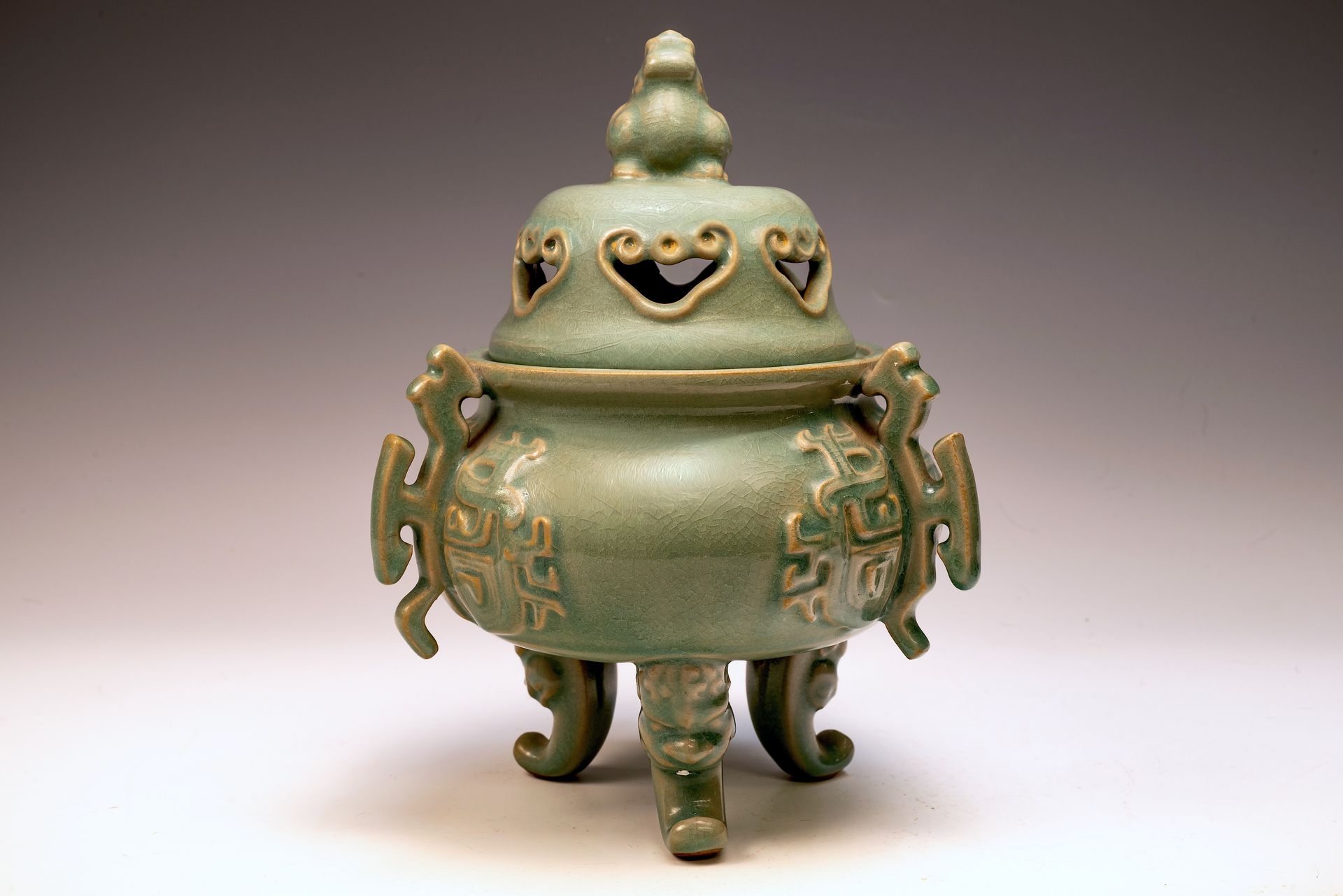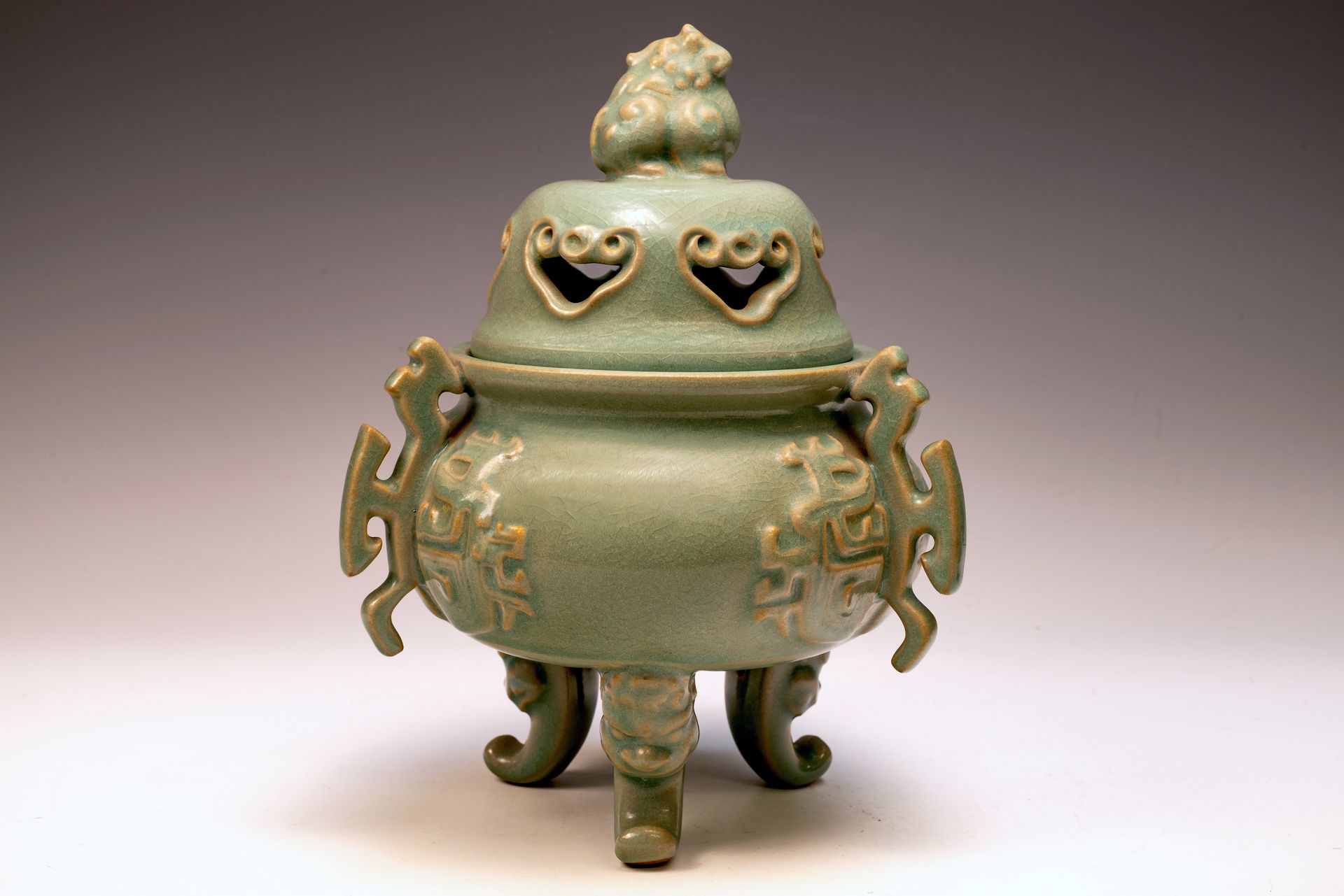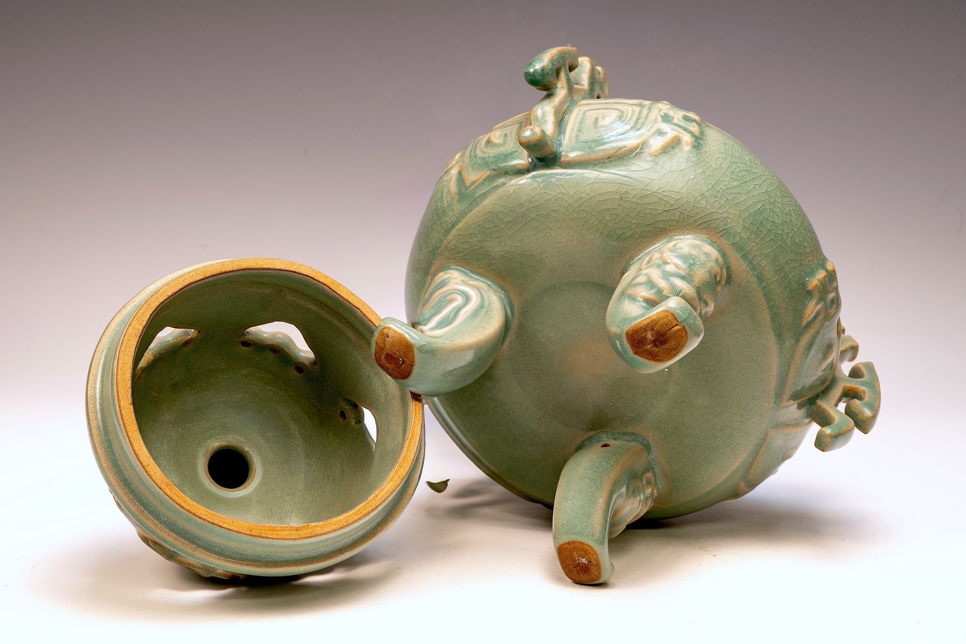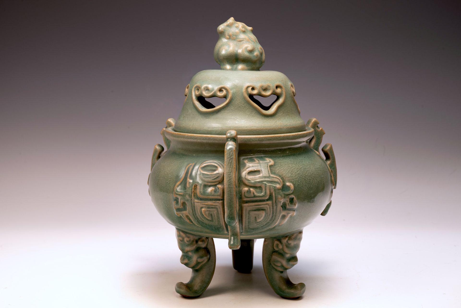 **An Exquisite First Commissioned Official Royal Imperial Ru-Kiln Three-Leg Burner with Handles and Lid, Adorned with a Mythical Animal Finial: A Masterwork for Emperor Huizong and His Court** This distinguished burner, measuring 9 1/4 inches in height, epitomizes the exceptional craftsmanship of Early Song Dynasty ceramics, specifically commissioned for Emperor Huizong and his esteemed court. Its elegantly proportioned form is complemented by intricately designed handles, exemplifying artistic precision. The celadon glaze reveals nuanced variations that enhance its aesthetic appeal. Noteworthy is the delicate cracked ice texture, combined with finely crushed rare blue agate—an exclusive characteristic of Official Royal Imperial Ru wares—evident upon closer inspection, as indicated in the provided microscopic imagery. The burner’s body exhibits a refined grayish palette, which appears brown as a result of the firing process. This remarkable artifact is part of the remaining collection of Northern Song Imperial Ru Ware, serving as a significant testament to the artistic heritage established under Emperor Huizong's reign. ppjrs