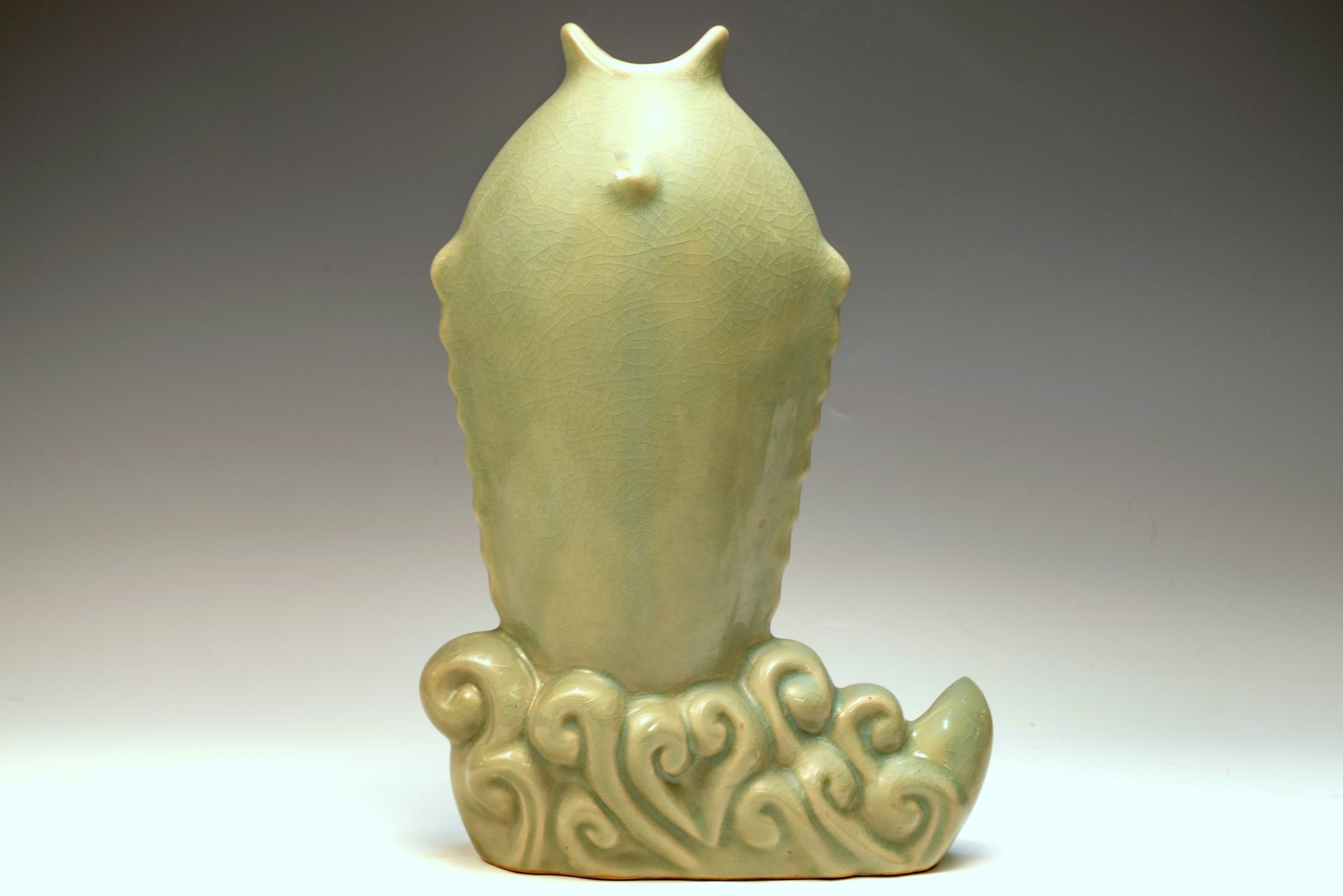 This esteemed First Commissioned Official Royal Imperial Ru-kiln Fish Leaping from water Vase is part of a select collection of wares crafted exclusively for Emperor Huizong and his royal court. With a height of 11 1/4 inches, the Vase exhibits an elegantly formed shape that exemplifies refined craftsmanship. The celadon glaze incorporates crushed blue agate, notable for its distinctive ice-crackle pattern, which can be appreciated under magnification using a 20x loupe. Additionally, microscopic imagery reveals the presence of agate specks adjacent to each piece's photographs. The rare crushed blue agate has been exclusively utilized in Official Royal Imperial Ru wares, a hallmark of the dynasty developed under the guidance of Emperor Huizong. Constructed with a fine gray body that transitions to a light brown upon firing, this unique vase is a remnant of Emperor Huizong's preserved collection of Northern Song Imperial Ru Ware. ppjrs