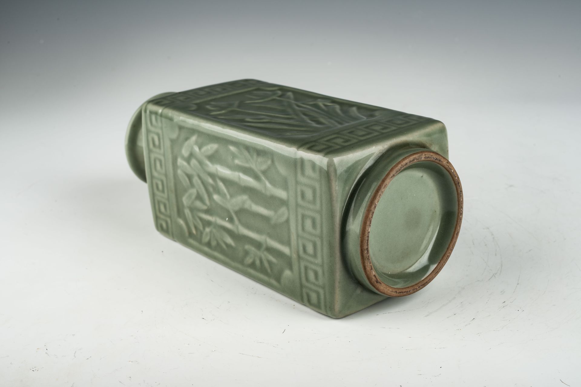 This esteemed second Commissioned Official Imperial Royal Ru-kiln Square Vase features exquisite adornments of blossoms, bamboo, flowers, and lotus. It is part of a distinguished collection representing the most luxurious celadon wares ever produced in China. These exceptional pieces were crafted exclusively for Emperor Huizong and his court. The celadon vase is notable for its remarkable glaze, characterized by a rich, smooth texture enhanced by the inclusion of rare blue crushed agate within the glaze composition. This unique feature can be readily observed with a 20x loupe or microscope, where the specks of agate become evident, as illustrated in the accompanying microscopic photographs of each piece. The use of rare crushed blue agate was a hallmark of all Official Imperial Royal Ru-kiln wares developed under the auspices of Emperor Huizong. The second Commissioned Royal Vase has an off-white body that transforms to a brownish hue upon firing. This remarkable vase stands approximately 9 1/8 inches tall and originates from the surviving collection of Northern Song Dynasty Official Imperial Royal Ru-kiln wares associated with Emperor Huizong. ppjrs