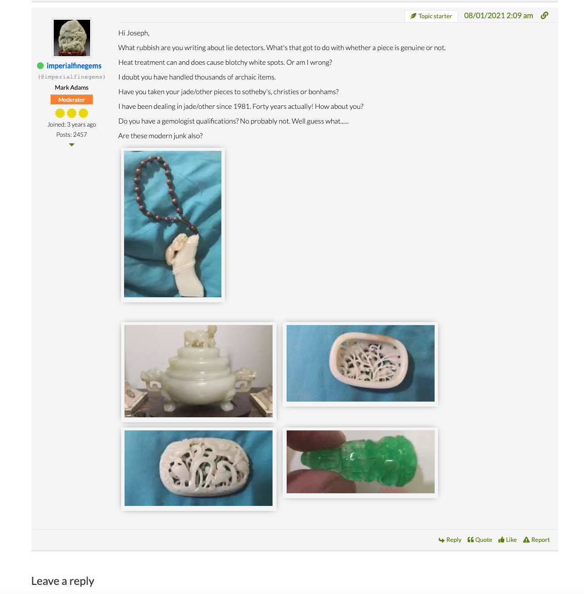 彼のサイトのフィードを見たら、ピーター・コムズが実際のフィードを変更し、私が投稿したものを削除していました。どうやら自分の見栄えを良くしようとしていたようです。彼らは私が3000個以上の翡翠を収集・管理していないと主張しようとしていたので、私が所有する翡翠の数がわかる写真を彼のサイトに投稿したところ、彼はそれらと私が書いたコメントを削除しました。彼は自分の見栄えを良くしようと、会話の一部を削除しました。翡翠の写真を投稿した時は、スクリーンショットを撮りました。彼がふざけて写真を撮ってしまうかもしれないと思ったからです。ジェイドの写真には番号が振ってあるので、全部載せて自分の主張を示そうとせずに、自分がその金額を所有していることを証明するために、いくつか切り取っておきました。