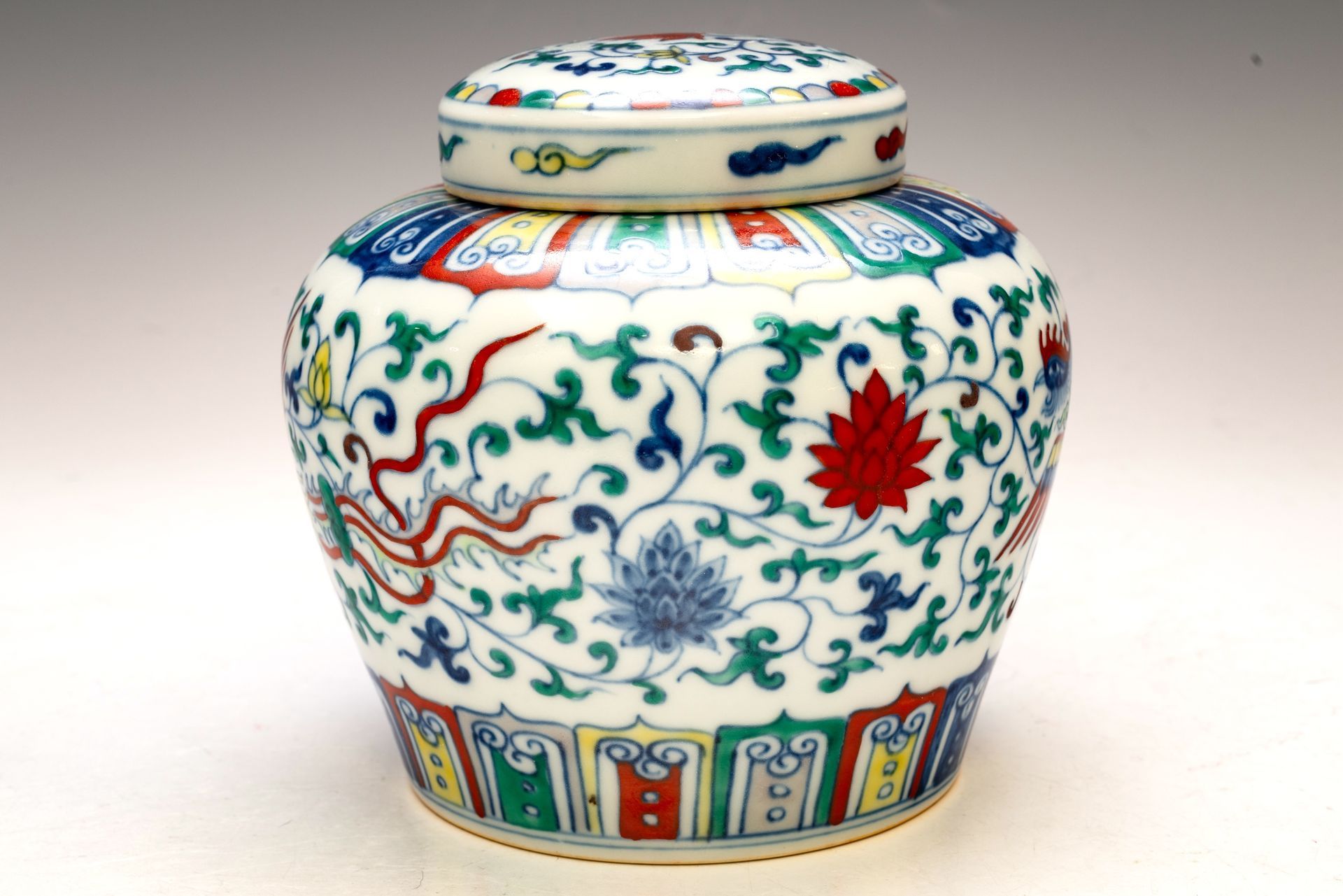 明代成化年間に制作され、刻印されたこの精巧な豆彩天壺は、牡丹と花の渦巻き模様の中に飛翔する鳳凰を描いた、注目すべき骨董品です。「豆彩」とは、対照的な色彩を用いる技法を指し、釉下青の輪郭線と調和のとれた色絵の釉を特徴とし、成化の職人たちの奇抜な作風を体現しています。この時代の職人たちは、革新的な色彩と技法を用いることで知られていました。特に、この作品に使用されている釉下青は、サマリ青と呼ばれる輸入コバルトと、地元産のピタンコバルトを混合したもので、この組み合わせにより、中国陶磁器で使用されている他のコバルトとは一目で区別できる、非常に洗練されたコバルトブルーが生まれました。サマリ青は5世紀以上輸入されておらず、ペルシャにおける正確な起源は未だ不明です。この壺は高温焼成で製造されたため、高台には茶色がかった色合いが見られることが多く、底部はわずかに波打っており、光の加減によってその表情が異なります。さらに、素地の剥がれが見られることで、この壺の真正性と年代を感じさせます。壺の底部には「天」を意味する「天」の刻印があります。成化時代は、中国陶磁史における豆彩技法の絶頂期と広く考えられています。この明代成化時代の天壺は、雄大な鳳凰を特徴としており、高さは約5 3/8インチです。ppjrs