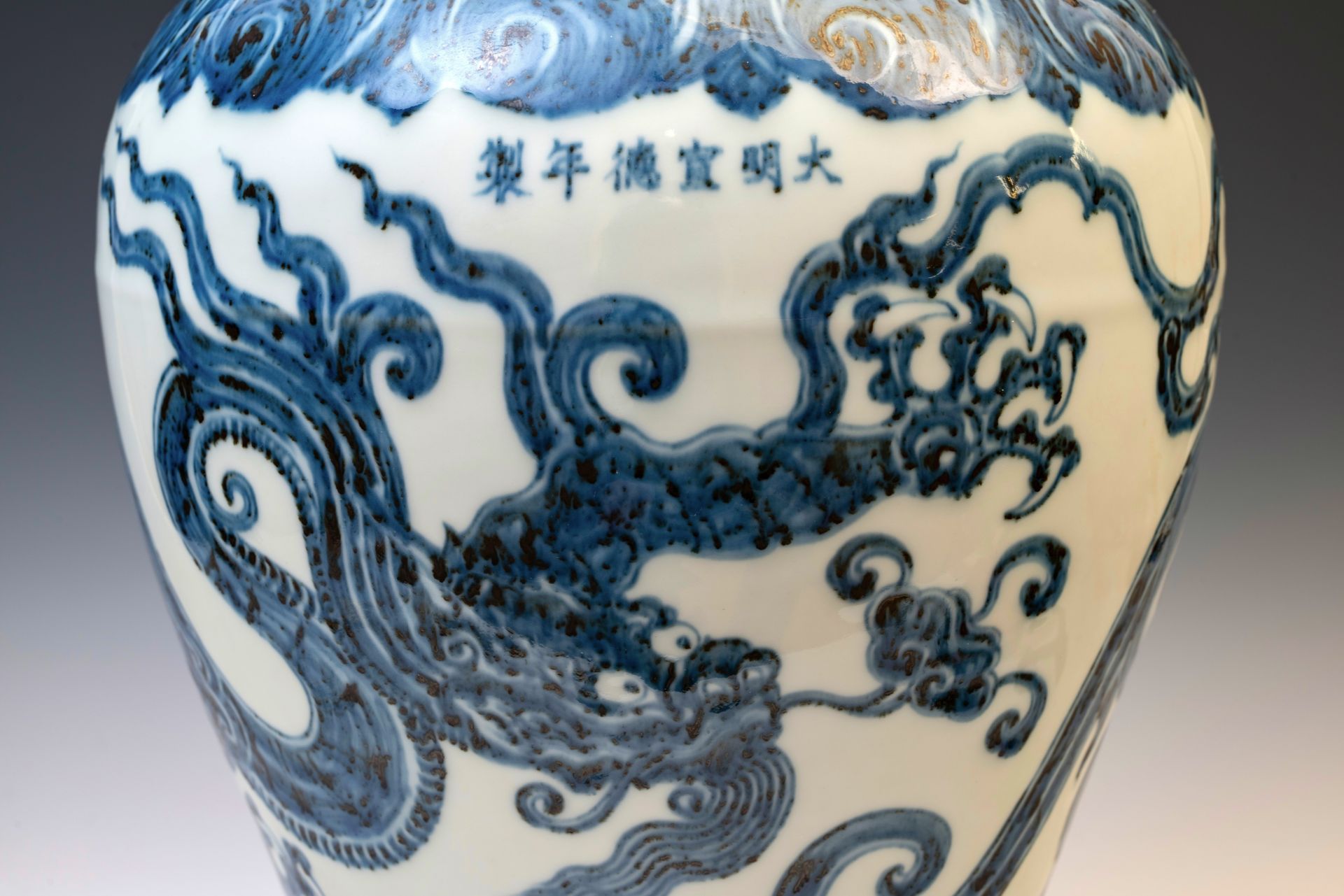 明代宣徳作、15世紀初頭、青白磁球形花瓶(龍と長大な銘文をあしらったもの)。この精巧な球形花瓶には、炎の真珠を追い求めて雲間を優雅に舞い上がる五本爪の龍が描かれています。花瓶は、独特の黒みがかった色合いで知られる輸入サマリ産の青コバルトで装飾されています。特に、釉薬の表面に見られる山積みや堆積効果により、黒い斑点や銀色の反射が見られることがあります。一方、茶色の色合いは、中国産のコバルトが使用されていることを示しています。輸入コバルトは500年以上入手不可能であったため、この特徴は、この花瓶の年代を示す証拠となります。さらに、素地の剥落が見られることも、この花瓶の歴史的重要性を裏付けています。この宣徳作球形花瓶の寸法は約