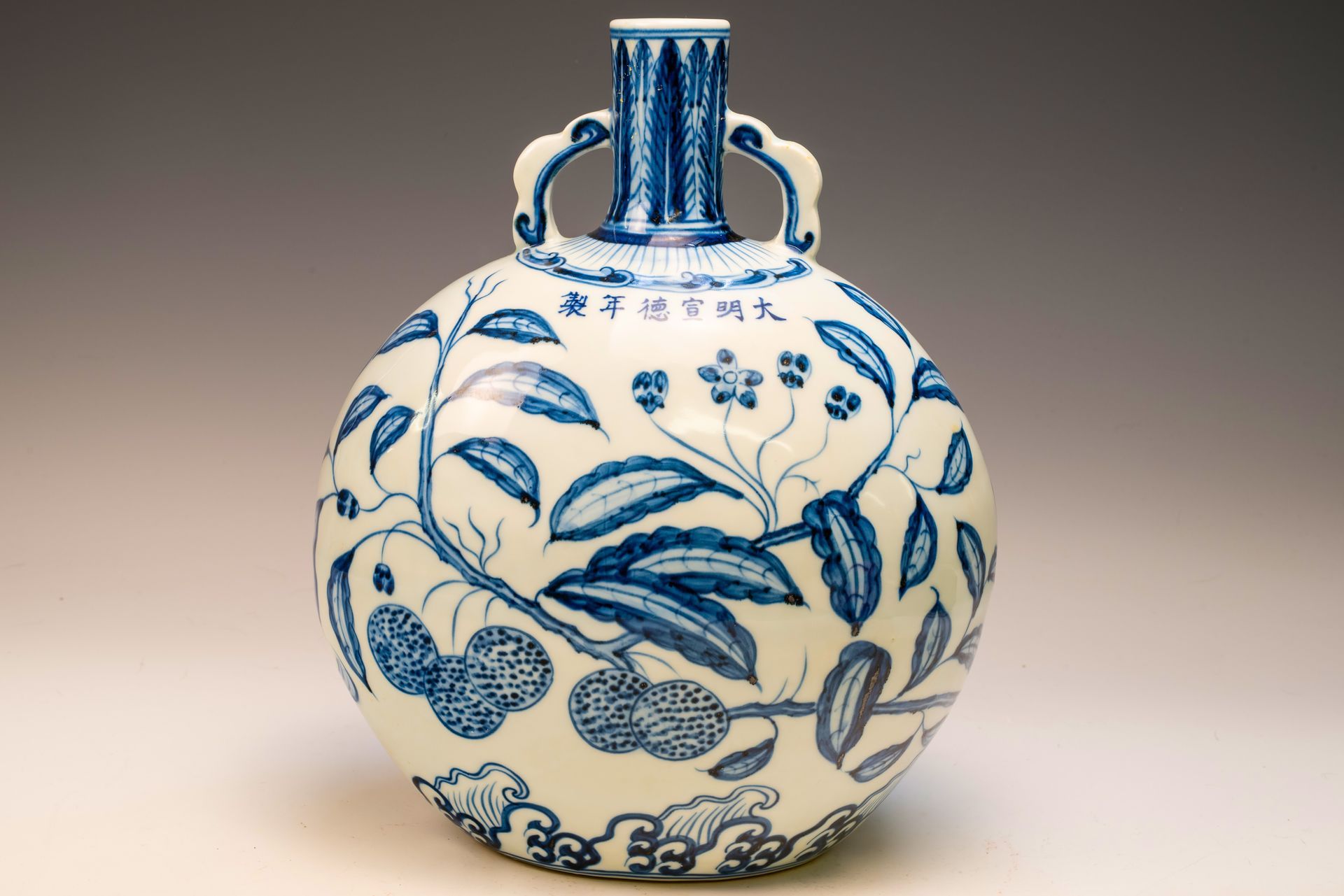 15世紀明代宣徳青白月瓶、刻印と年代入り、ライチの枝と葉で装飾