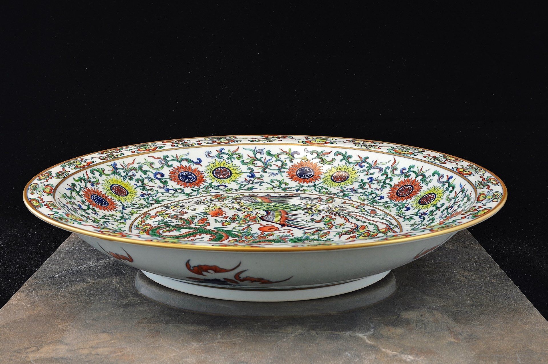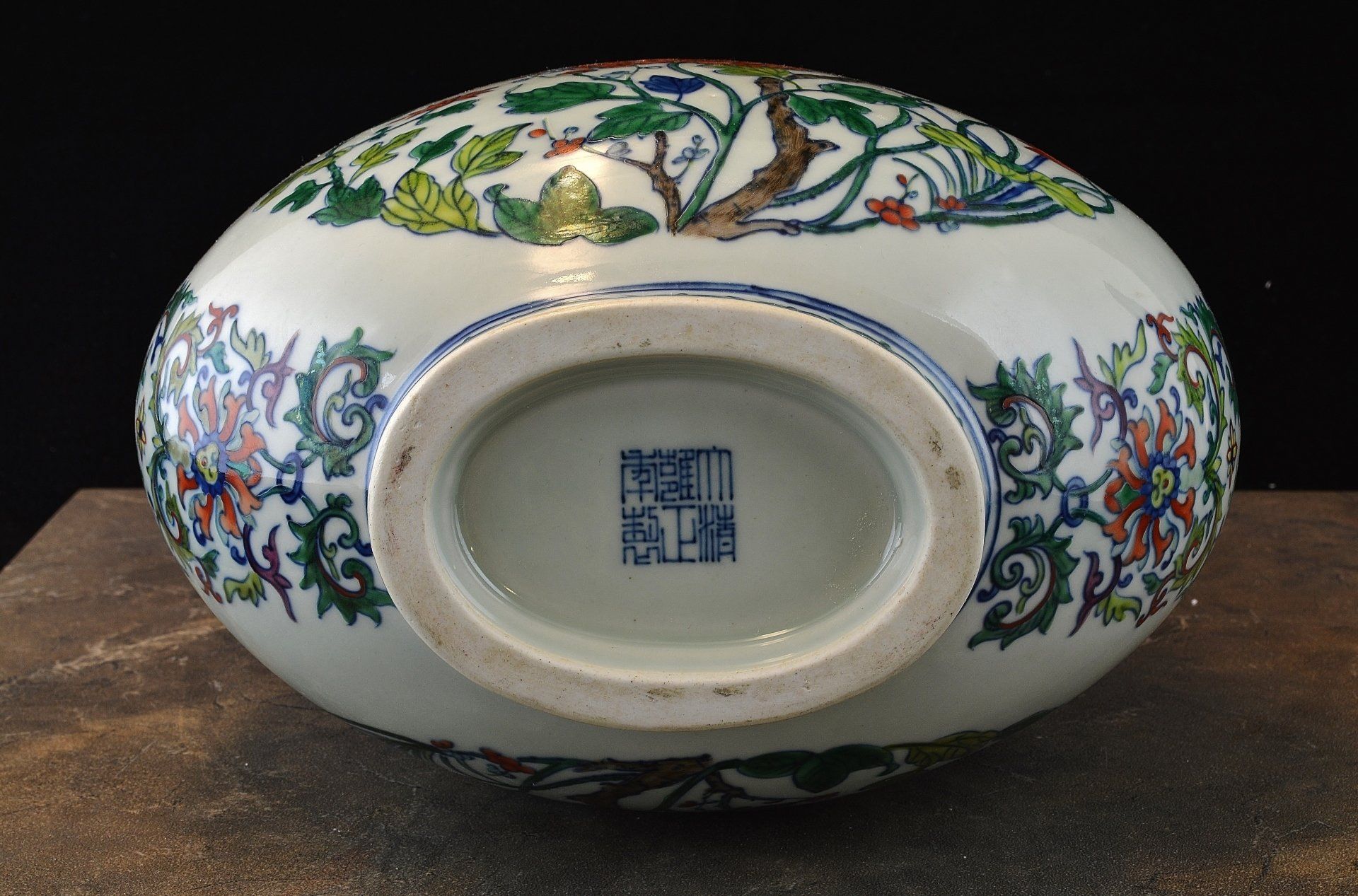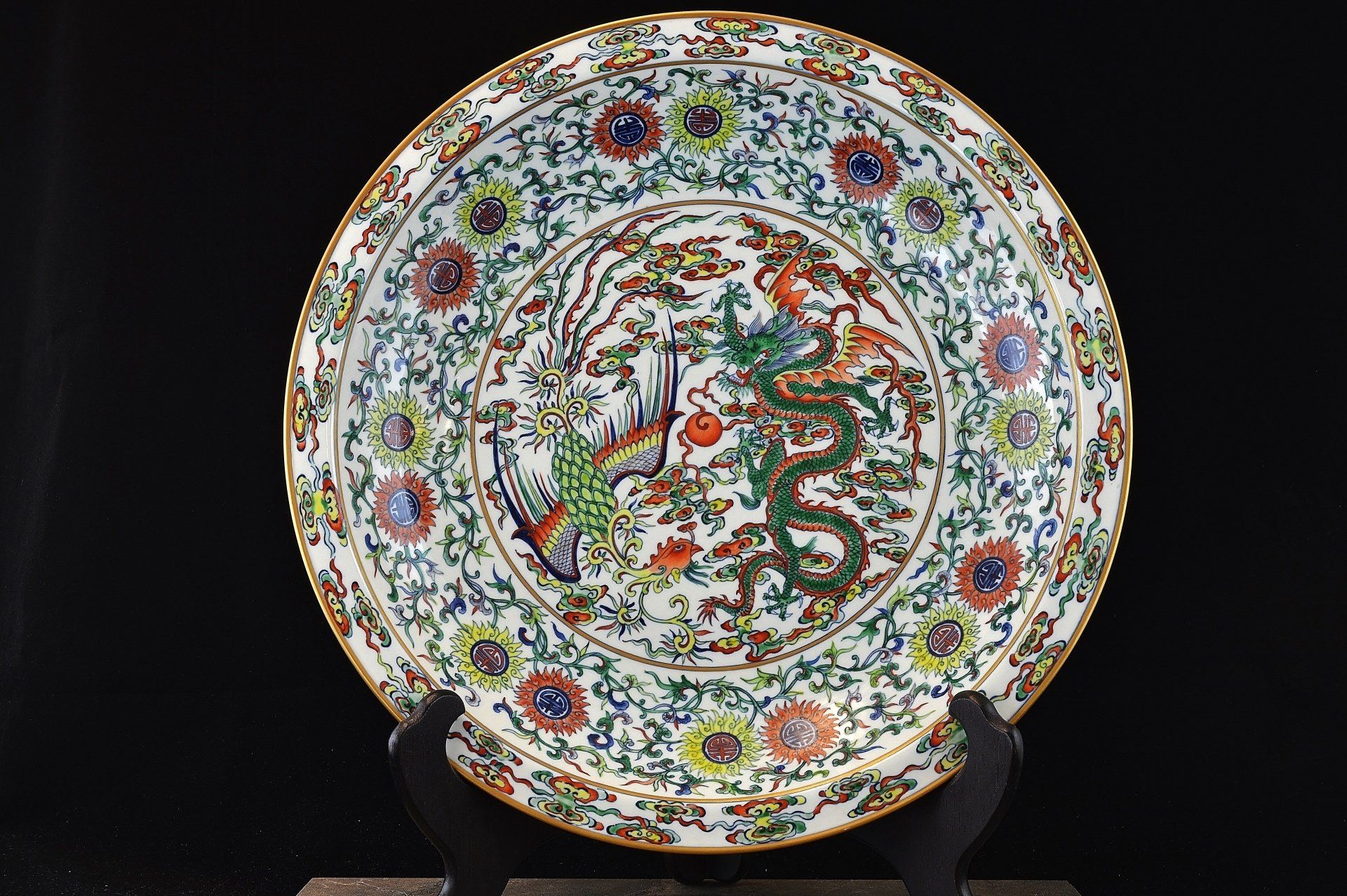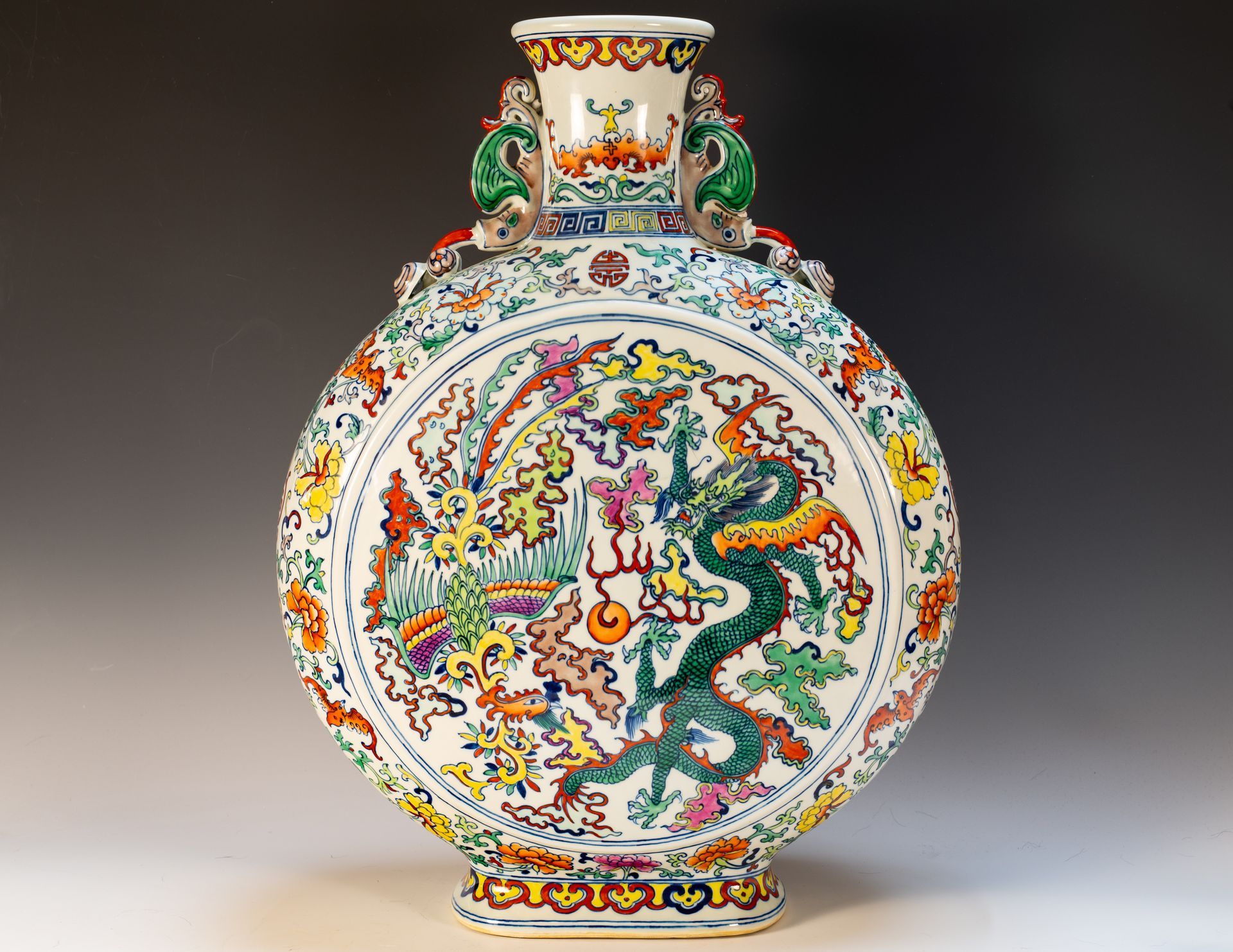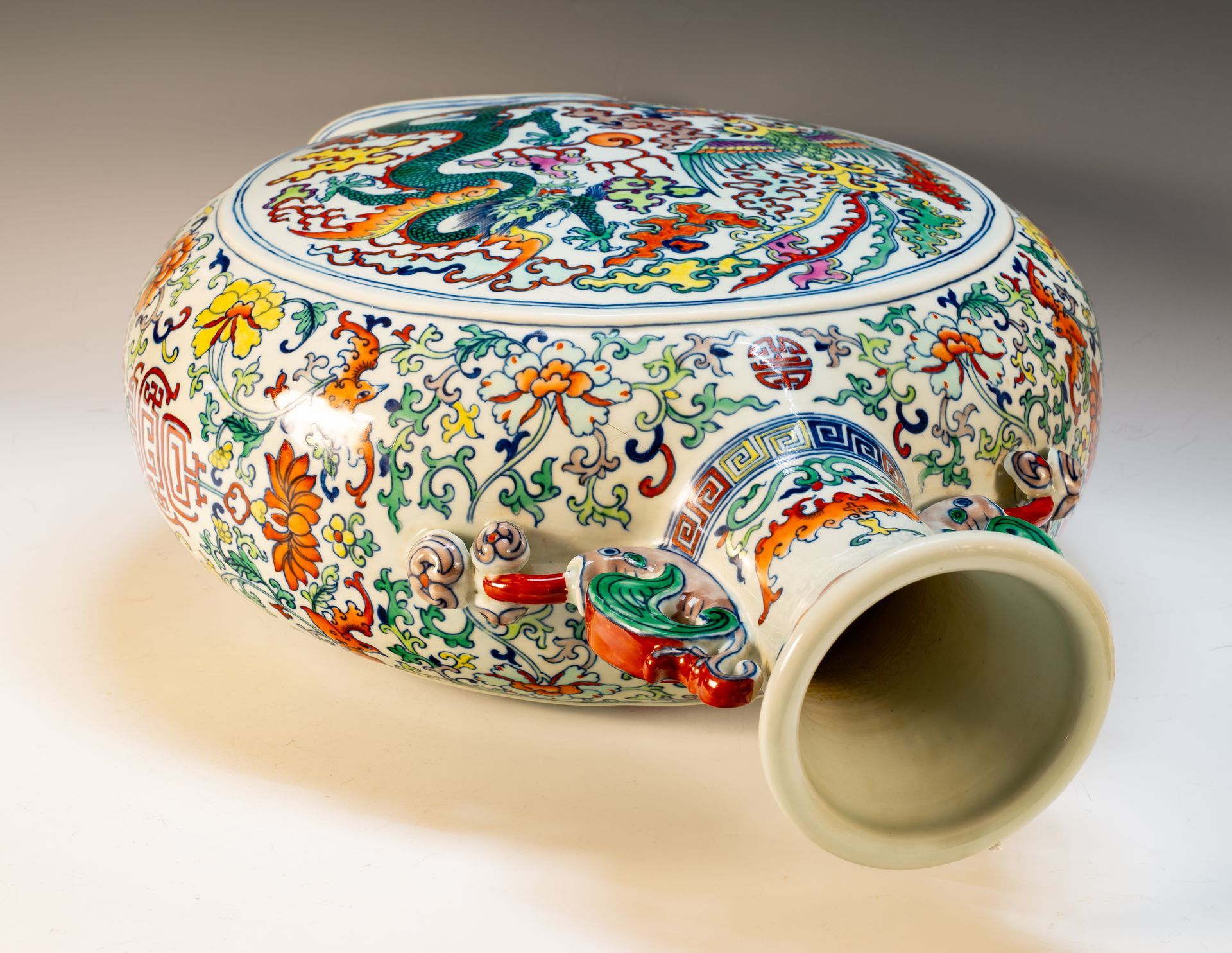 清朝雍正年間に作られた、非常に大きな斗彩月瓶。その刻印と精緻な意匠が特徴で、雲紋の中に龍と鳳凰の模様が描かれています。「斗彩」とは「対照的な色彩」を意味し、雍正時代には非常に珍しかったエナメル技法であるファミーユ・ローズのパレットが用いられていることに由来しています。この瓶は、トビウオの柄が優雅にデザインされ、表面にはコウモリ、渦巻く牡丹、花の要素が飾られています。底部には雍正の六字の璽が釉下彩で刻まれています。また、素地の剥落が歴史的意義と真正性を物語っています。瓶の高さは約22 3/4インチです。ppjrs