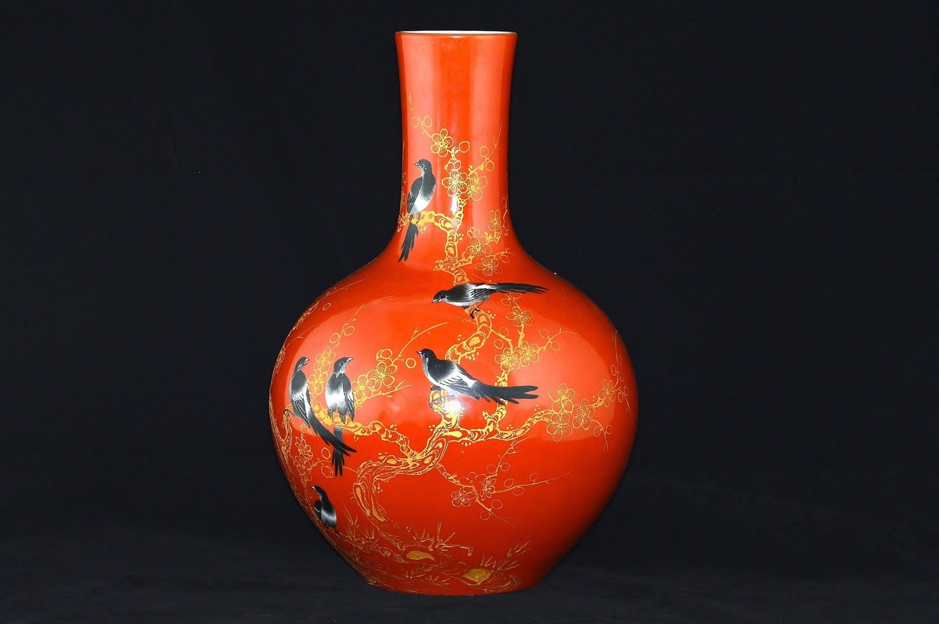 清朝乾隆帝印・時代赤地鳥文装飾卵形花瓶