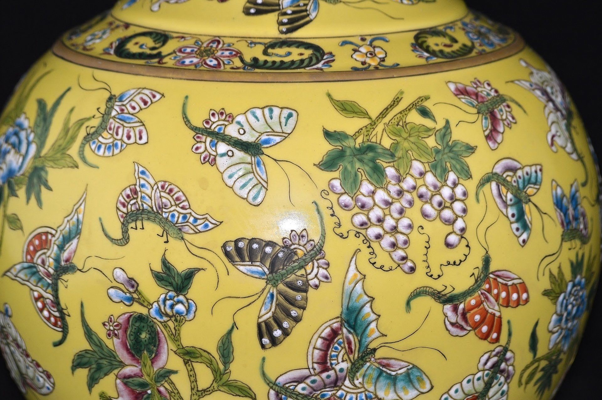 清朝時代の乾隆帝の印章と時代を示す黄地球形花瓶。100匹の蝶/蛾が刻まれている。