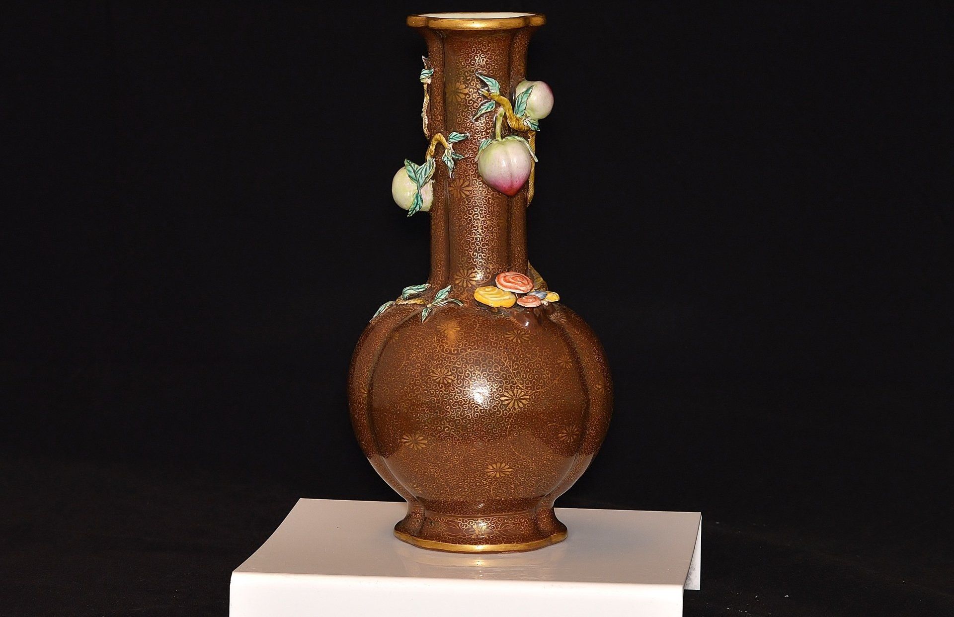 清朝雍正時代の皇室花瓶:梨形にザクロの木をモチーフにしたファランサイエナメルで制作され、二重の四角で囲まれた四字の毫智印が目立つ