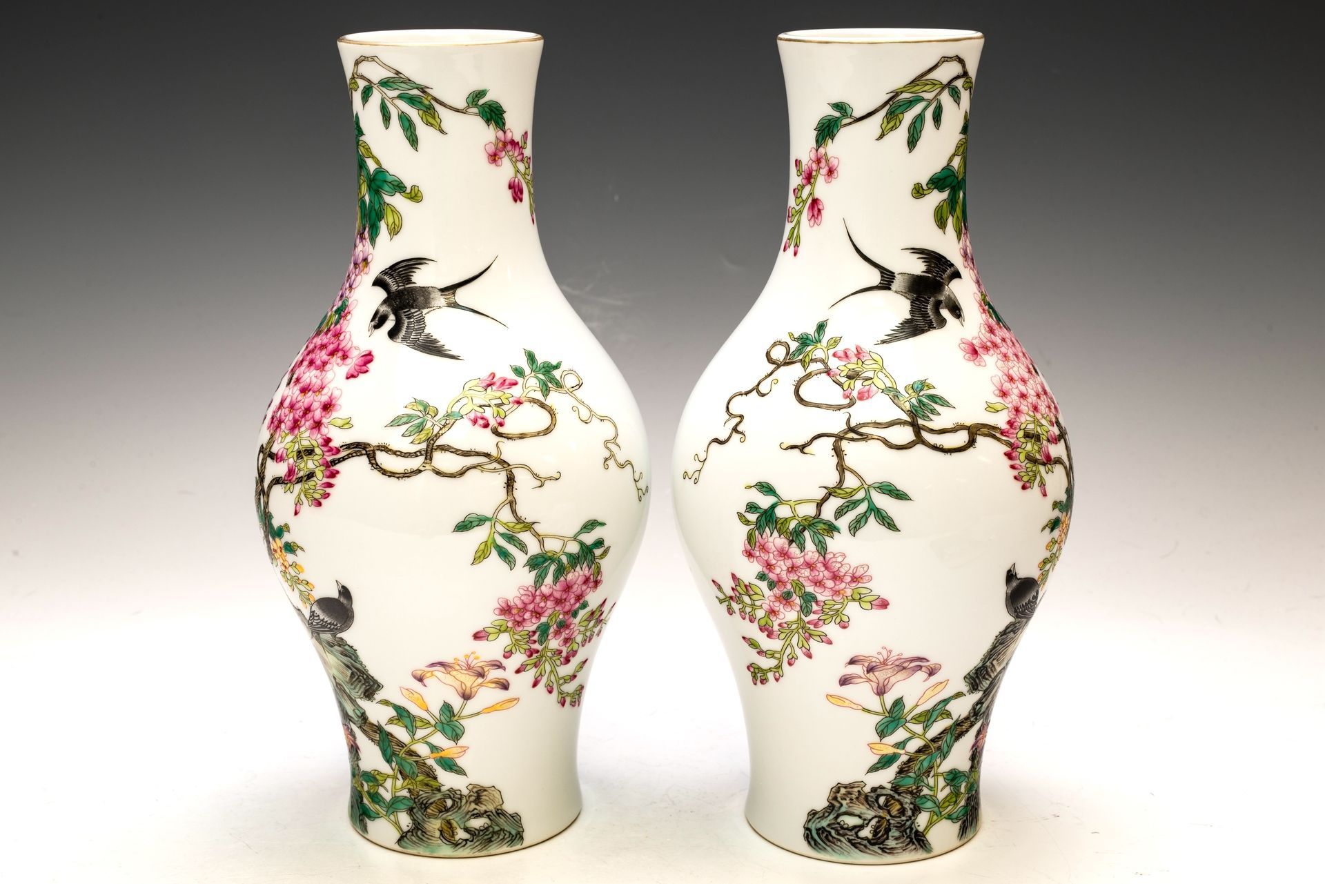 これらの精巧な法浪彩琺瑯花瓶は、その極めて薄い磁器の胴部で知られ、雍正帝の時代、具体的には1723年から1735年にかけて北京の紫禁城で製作されました。これらの花瓶は法浪彩琺瑯で精巧な意匠が施されており、史料によれば皇帝が制作を厳しく監督していたことが示されています。これらの制作に要した芸術的技巧と精密さは明白であり、花瓶を観察すれば、傑出した中国陶磁器作品の明確な特徴が明らかになります。将来のコレクターは、葉、花、枝の詳細な描写を注意深く観察することをお勧めします。綿密に観察すると、これらの花瓶にバランスと深みを与えている絶妙な色のグラデーションと陰影が明らかになります。コレクターは、凡庸な作品と卓越した傑作を見分ける必要があります。清代の陶磁器を比較分析すると、多くの作品が熟練度の低い芸術家によって制作され、細部とバランスが不十分な平坦な外観になっていることが明らかになります。色彩と陰影といった要素に細心の注意を払うことは、陶芸品の品質を見極める上で不可欠です。これらの花瓶の繊細な質感は、枝、梅の花、鳥のモチーフをあしらった装飾によってさらに際立っています。雍正時代の法浪彩の色彩は、はっきりと見て取れます。素焼きの剥がれは、経年による痕跡です。さらに、裏面には詩文と3つの印章が刻まれています。台座には、北京の装飾職人の特質である、青いエナメルで二重の四角の中に雍正四字が刻まれています。注目すべきは、この一対の花瓶が全く同じではないことです。これは雍正時代の作品の特徴です。これらの花瓶に描かれた鳥は、比類のない芸術性を示しており、羽根は一本の毛筆で千本を超える極小の筆致で精緻に描かれており、その細部は拡大して初めて鑑賞できます。写真をよく見ると、鳥の体幅がわずか1/2インチであることを考えると、精緻な筆致が際立ちます。この芸術家の卓越した技巧と緻密な表現は、まさに模範的です。これらの花瓶の品質は驚異的です。オークションカタログ、参考文献、美術館の所蔵品などを調べ、雍正法浪彩花瓶の中でも優れた作品が記録されているかどうかを確認すれば、その真価を検証することができます。花瓶の高さは約8 3/8インチです。