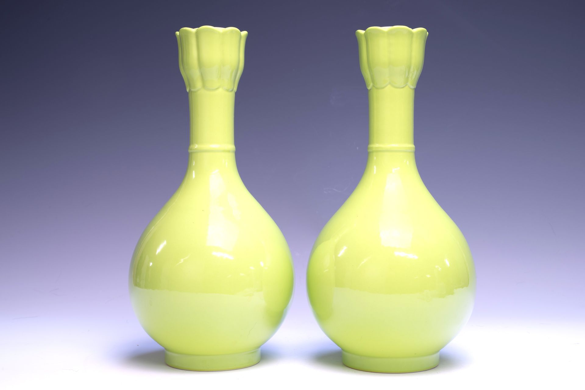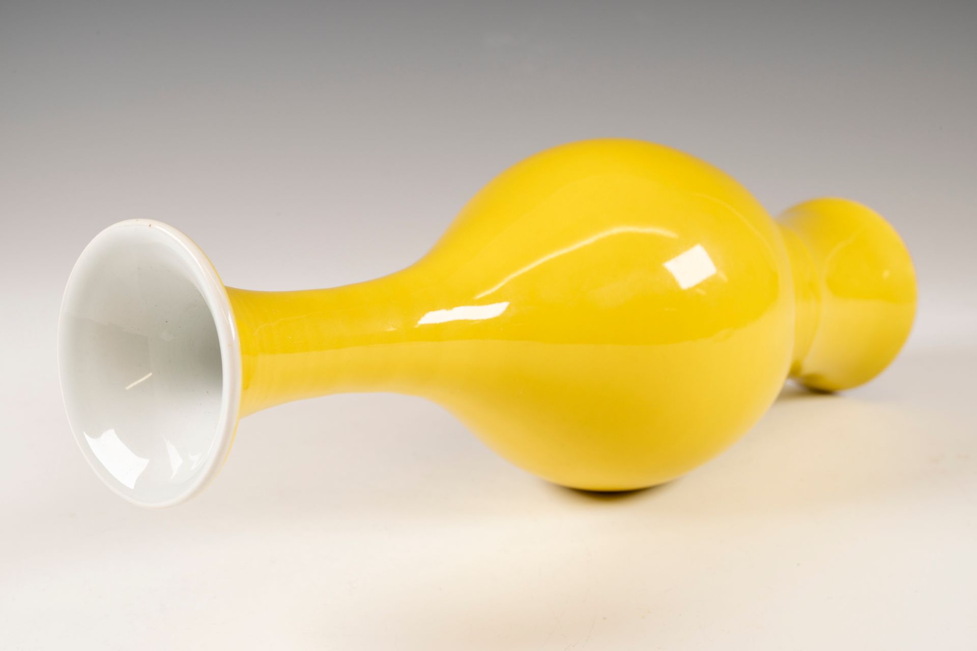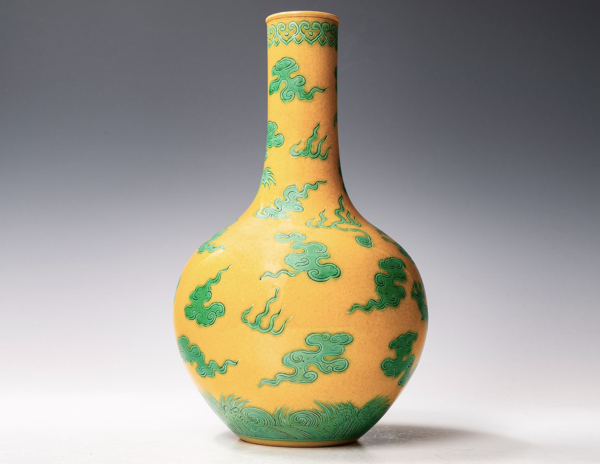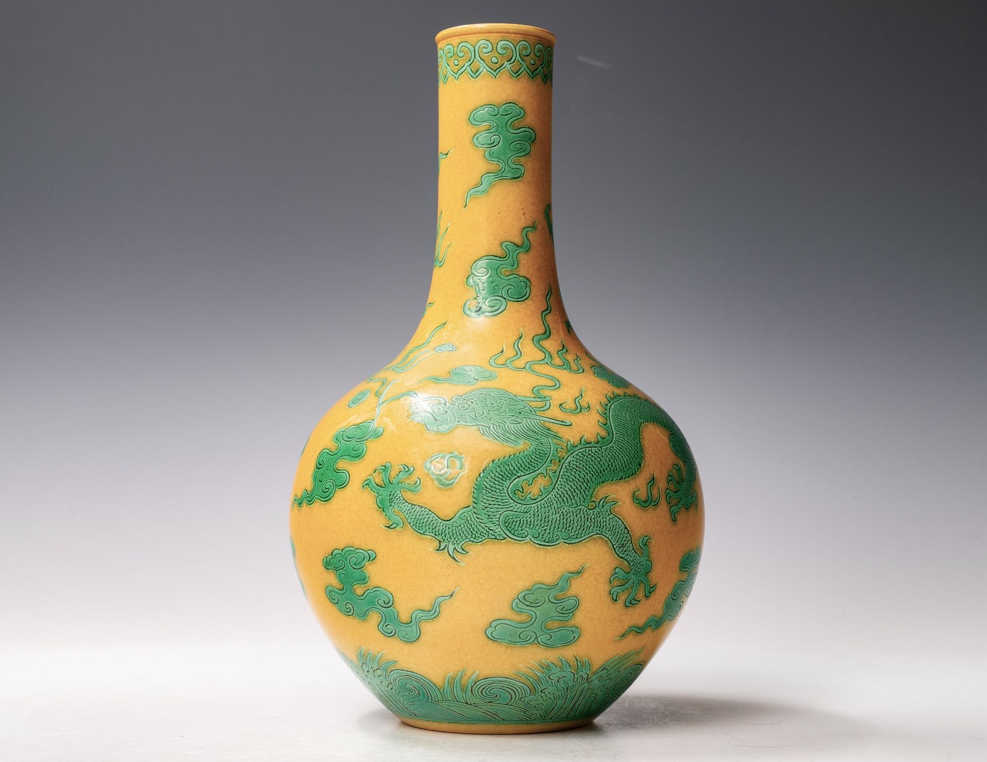 清朝時代、嘉慶帝の印と時代の梅瓶、黄地に緑釉の五龍彫り