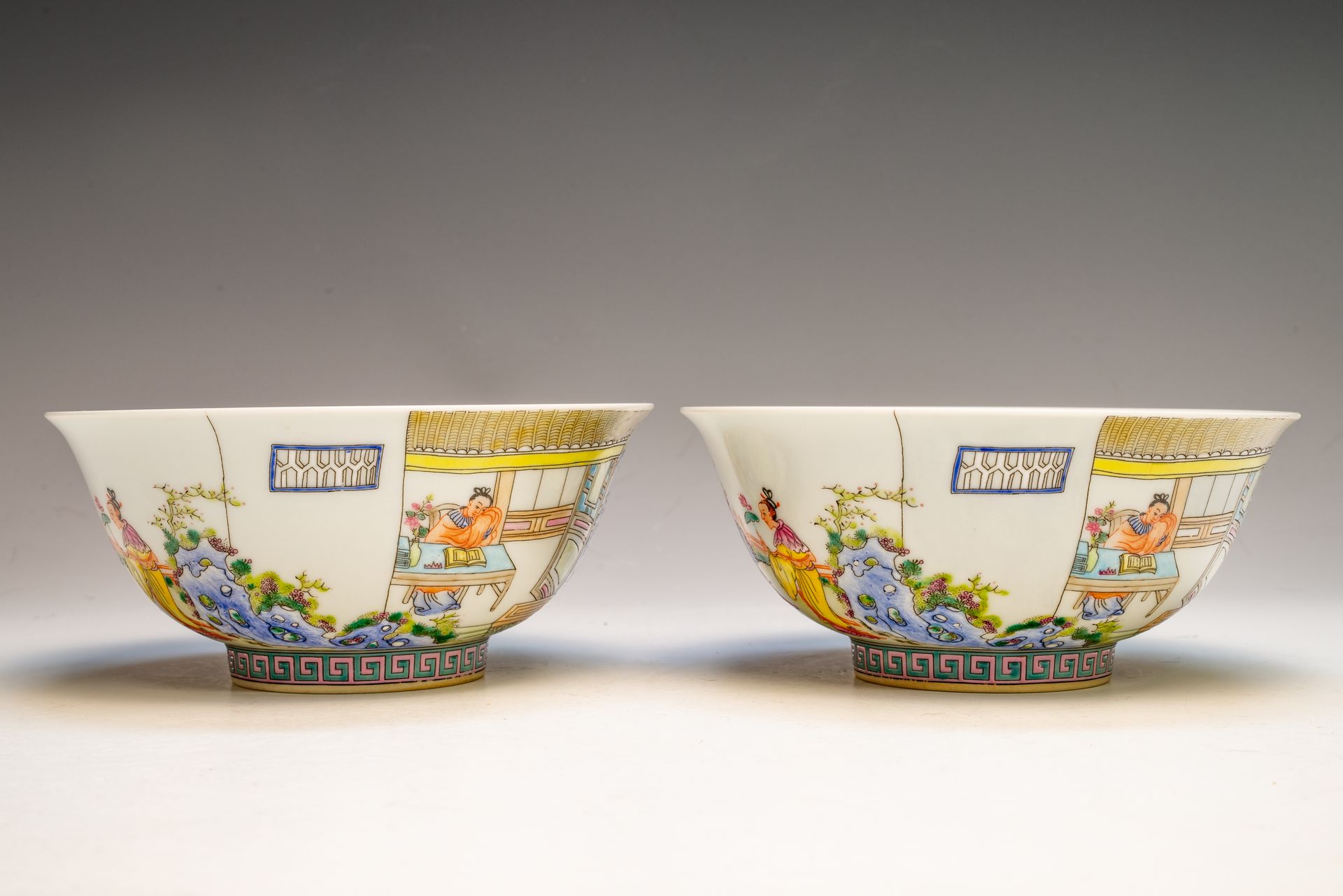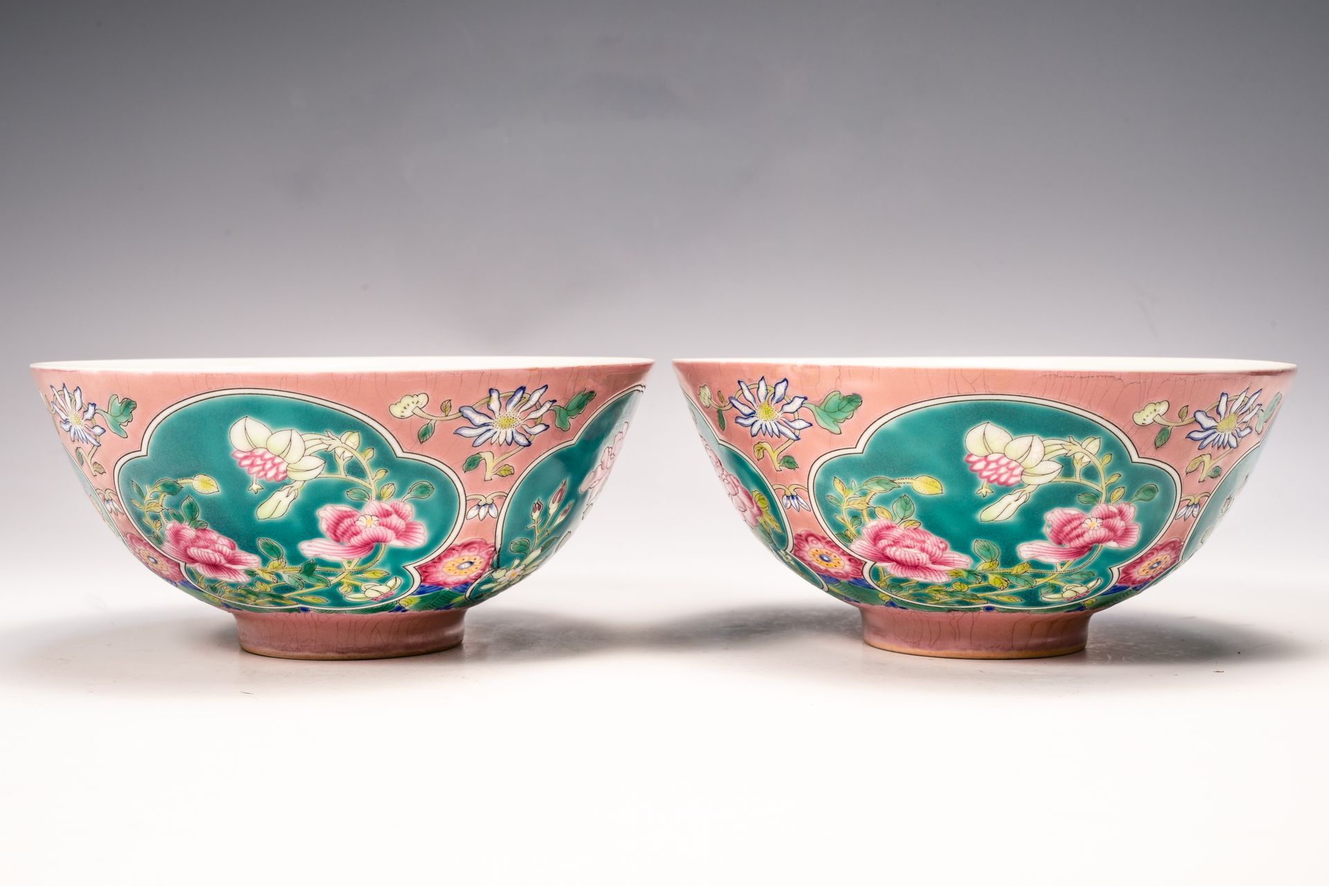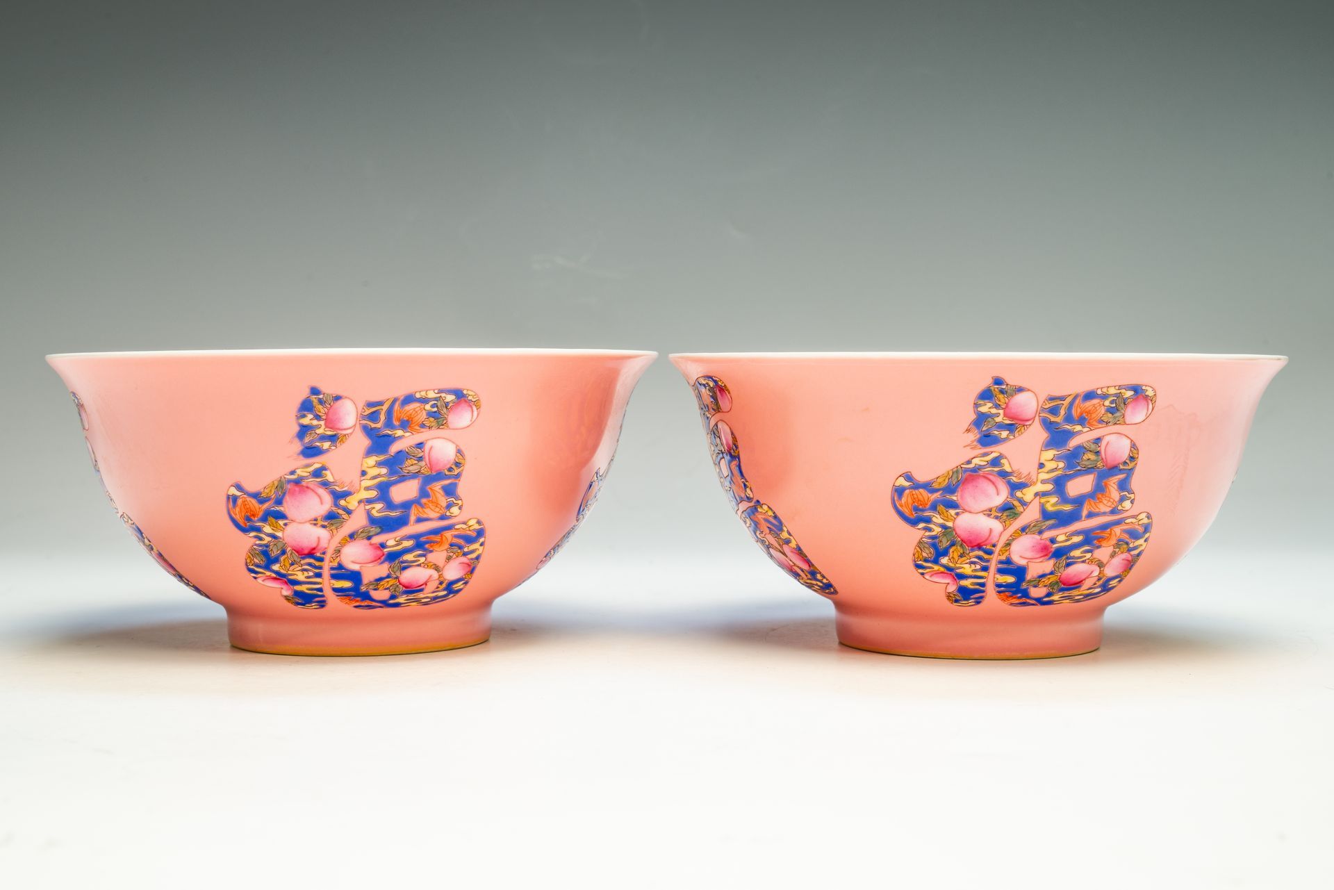 清代康熙帝のピンク色の地に法浪彩のエナメルを施した椀一対。二重の正方形の中に黒色の四字毫字と句読点が刻まれている。