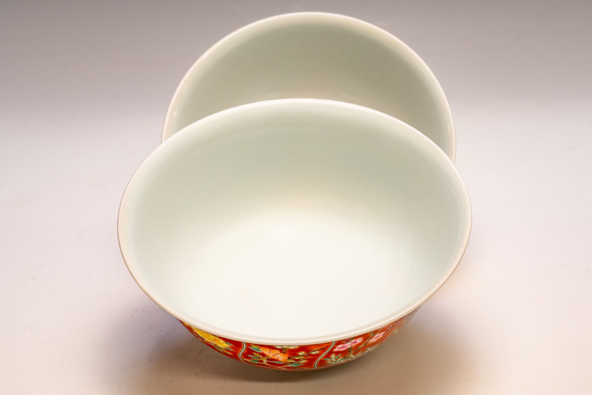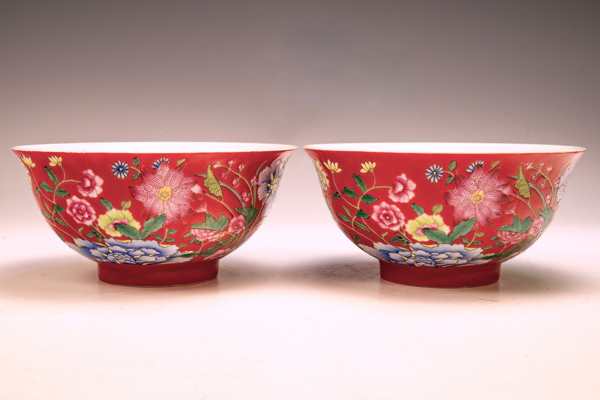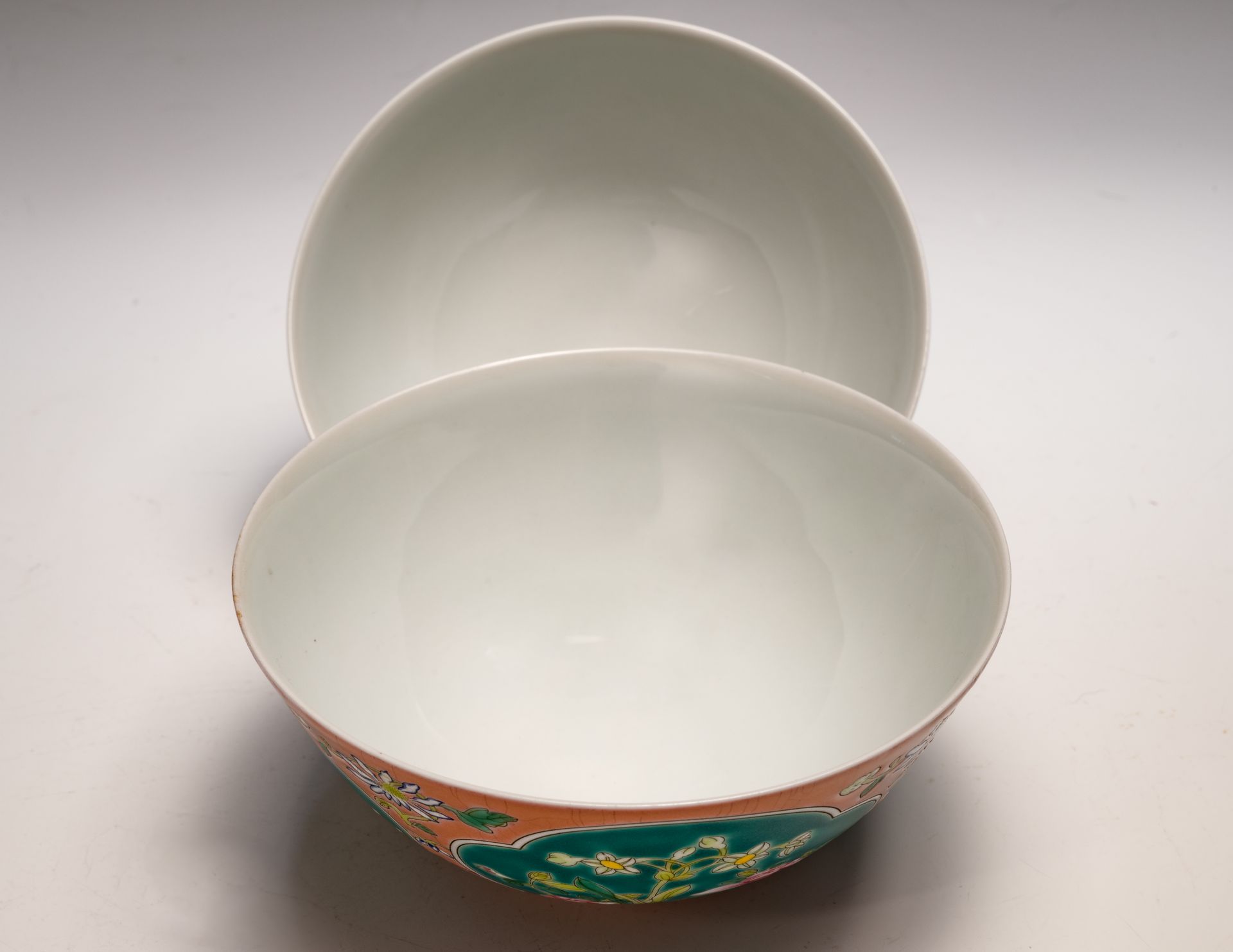 清朝康熙帝時代の花文装飾鉢一対。法浪彩のエナメルと、当時の深紅の玉之印と二重方陣銘文が特徴。