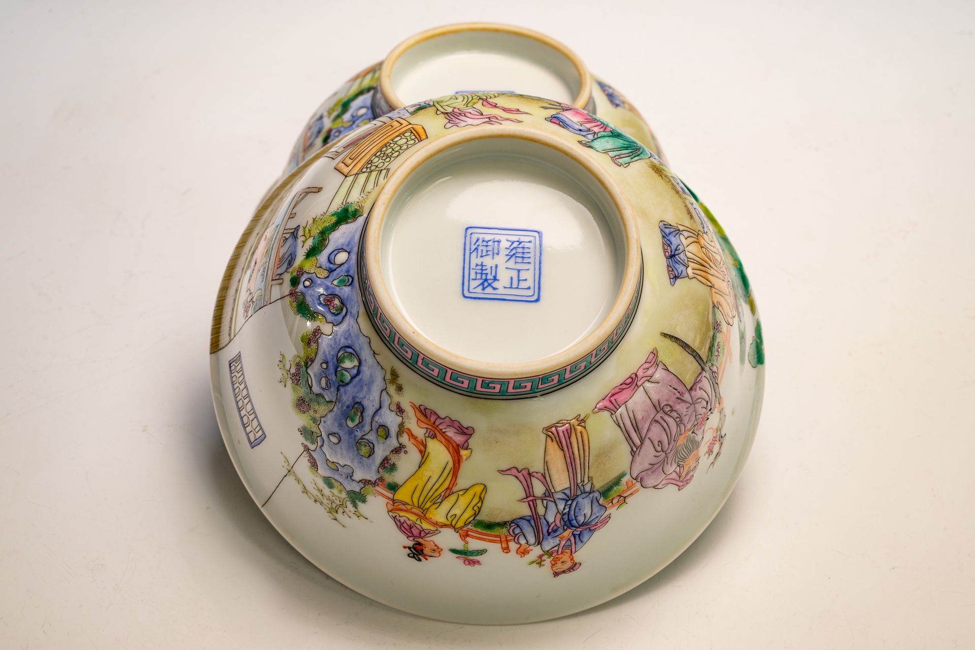 清朝時代の雍正時代を描いたこの傑作雍正物語椀は、その時代特有の特徴と精緻な装飾が見事に融合しています。精巧なフォルムで作られたこれらの椀は、鮮やかな色彩と精緻なディテールで知られる琺瑯(ファランサイ)の色彩パレットを用いています。それぞれの椀には中国の伝統的な物語が描かれ、精巧に描かれた人物像は琺瑯の芸術性を体現しています。椀の裏面には、二重の正方形の中に青い琺瑯で「雍正玉之」の四字が刻まれており、品質と真正さの証となっています。これらの作品を特徴づける、細部までこだわったディテール、色彩バランス、そして陰影にも注目すべきです。素地には年代を示す剥がれが見られますが、琺瑯には琺瑯特有のひび割れがほとんど見られません。色彩の配色自体も驚くほど美しいままです。雍正椀の直径は約6 1/4インチです。. ppjrs