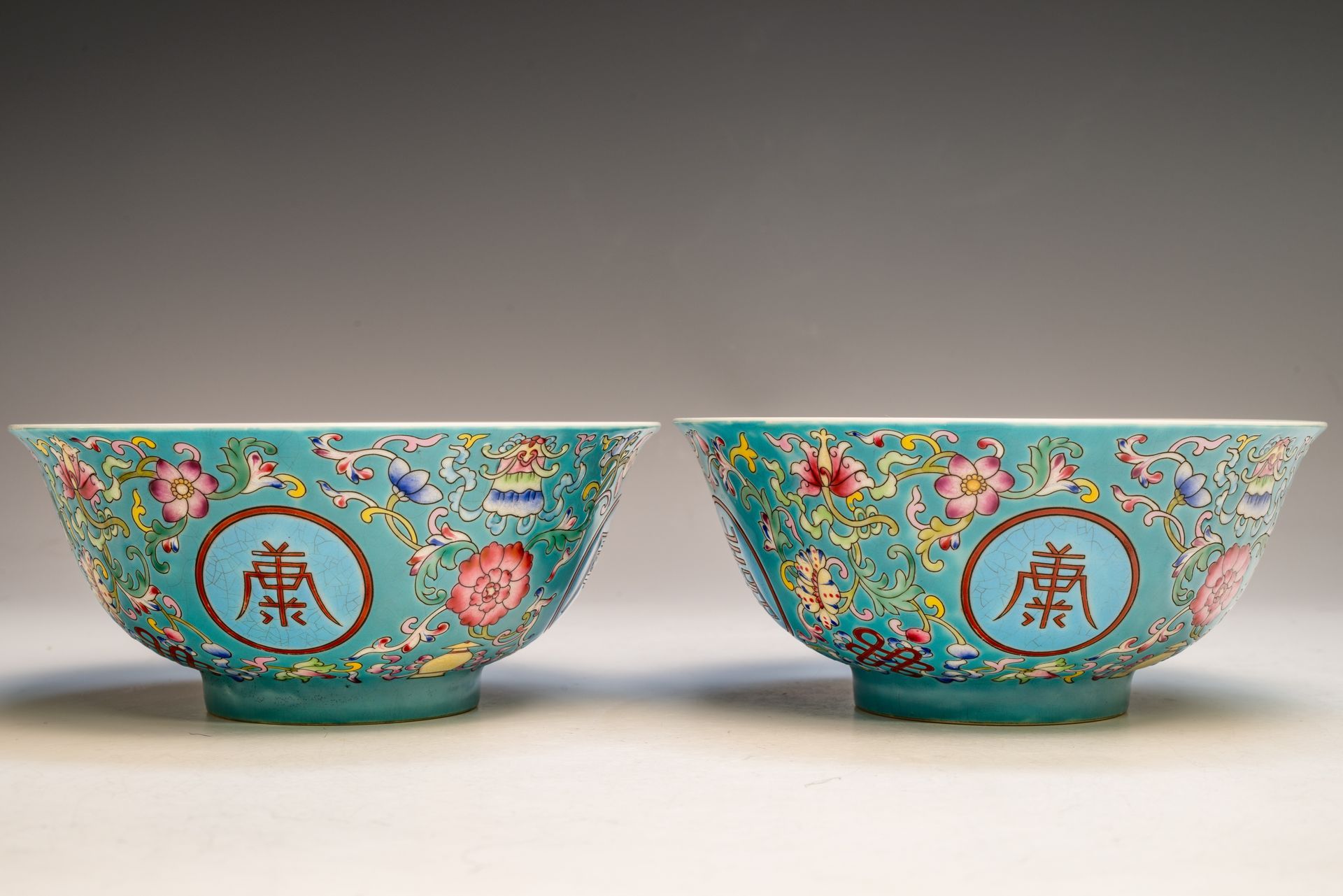 清代康熙帝時代の牡丹と花の文様で飾られた一対の皇室用椀。法浪彩のエナメルと、当時の二重方陣銘のある青玉之印が特徴。