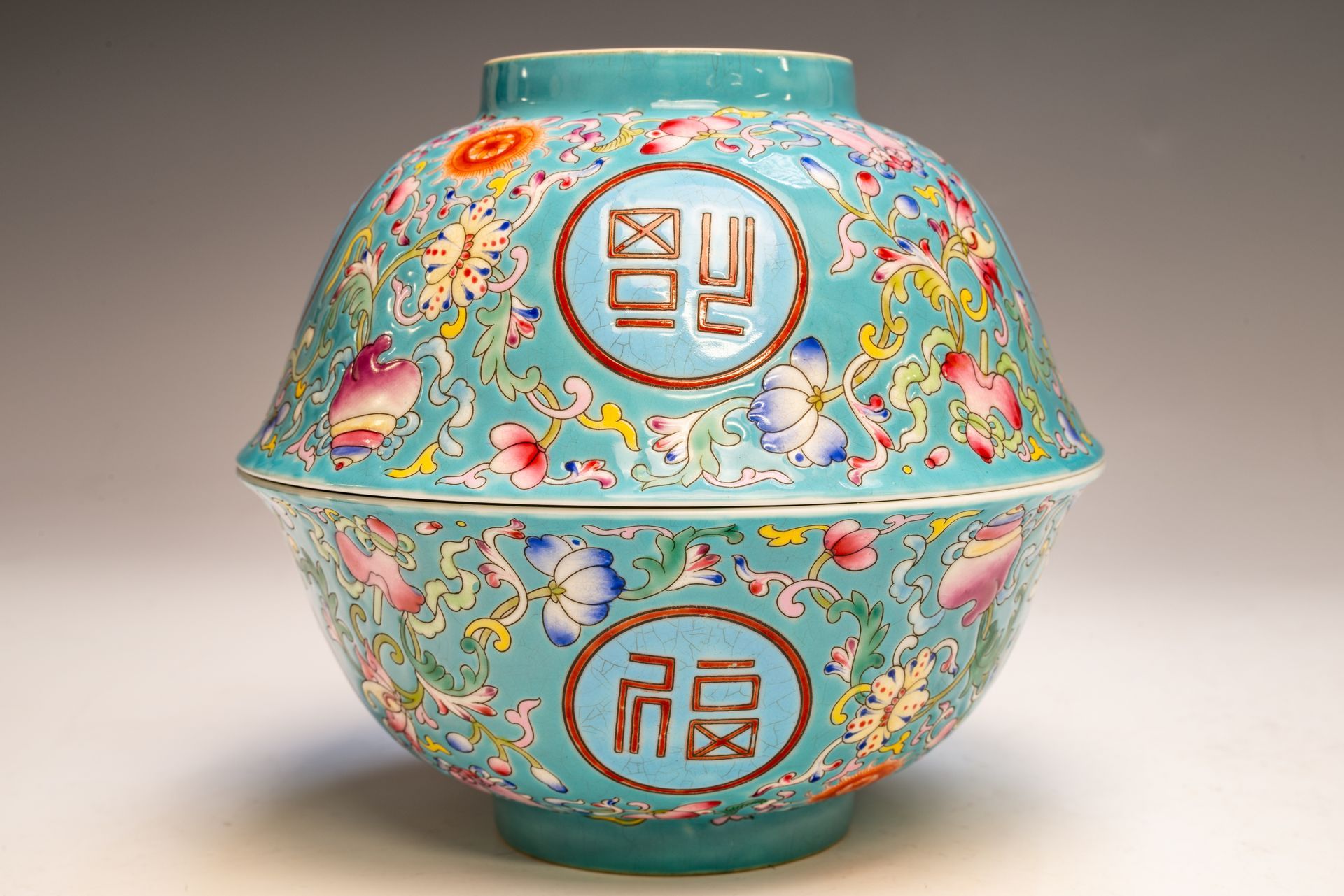 清朝皇帝時代の康熙帝の鉢2個。法浪彩と青四字毫字が二重方形に刻まれている。