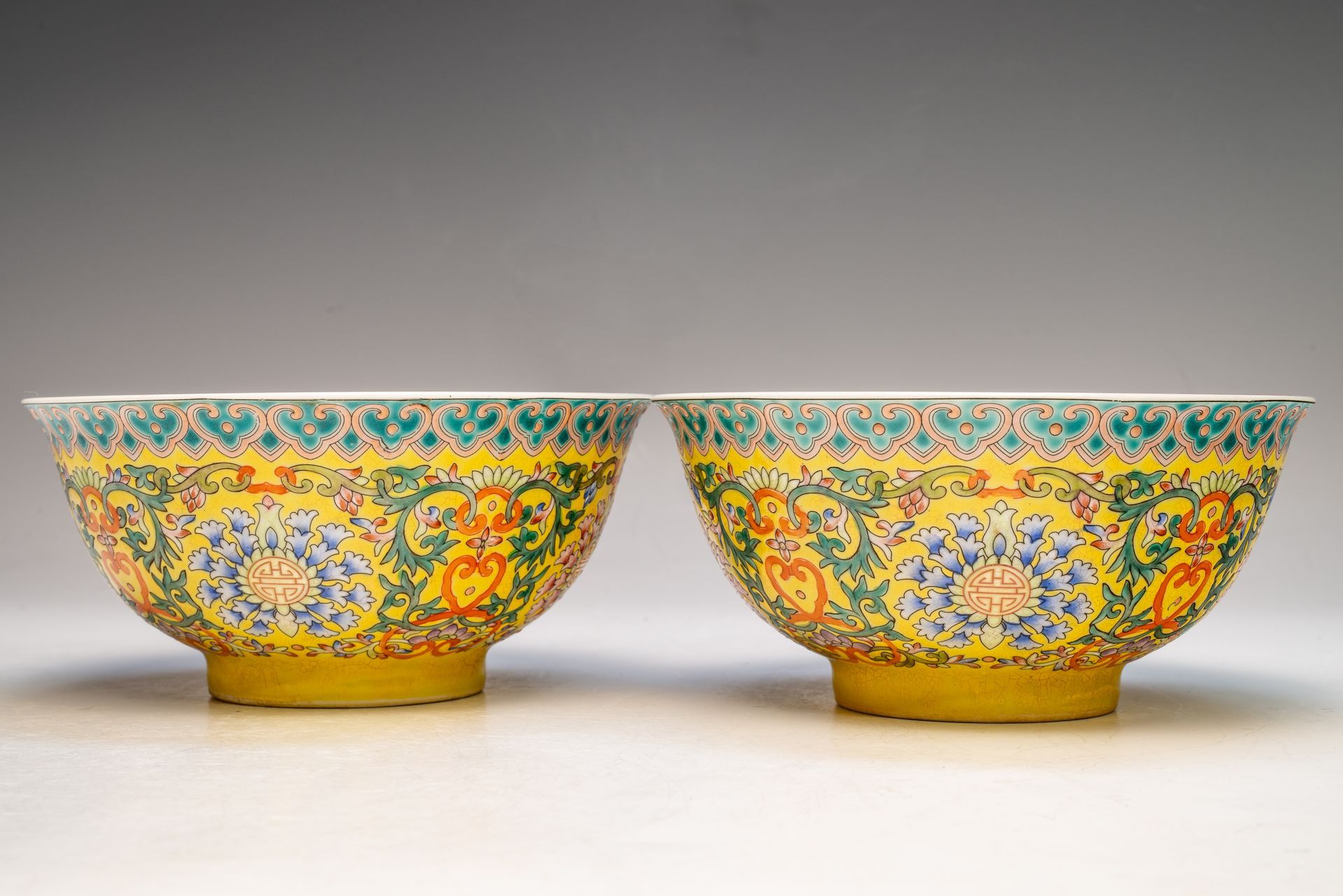 清朝康熙帝の黄地法浪彩釉鉢一対。二重の正方形の中に濃いピンク色の四字の毓之印が描かれている。康熙帝の時代。