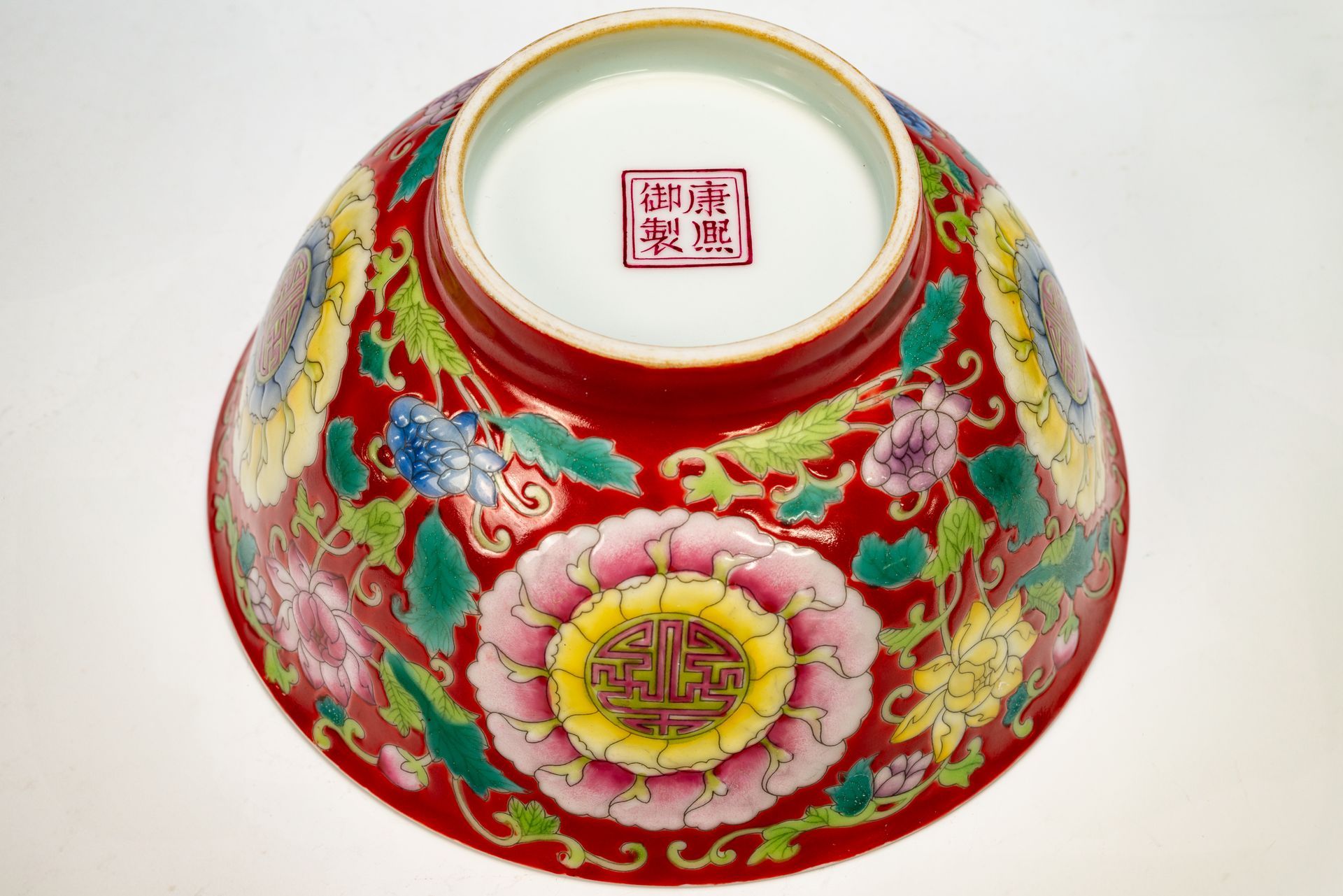 清朝康熙帝の蓮花椀。ルビーレッドの地とファランサイのエナメルで装飾され、二重の正方形の中に黒瑪瑙の四字毫字と時代が刻まれている。