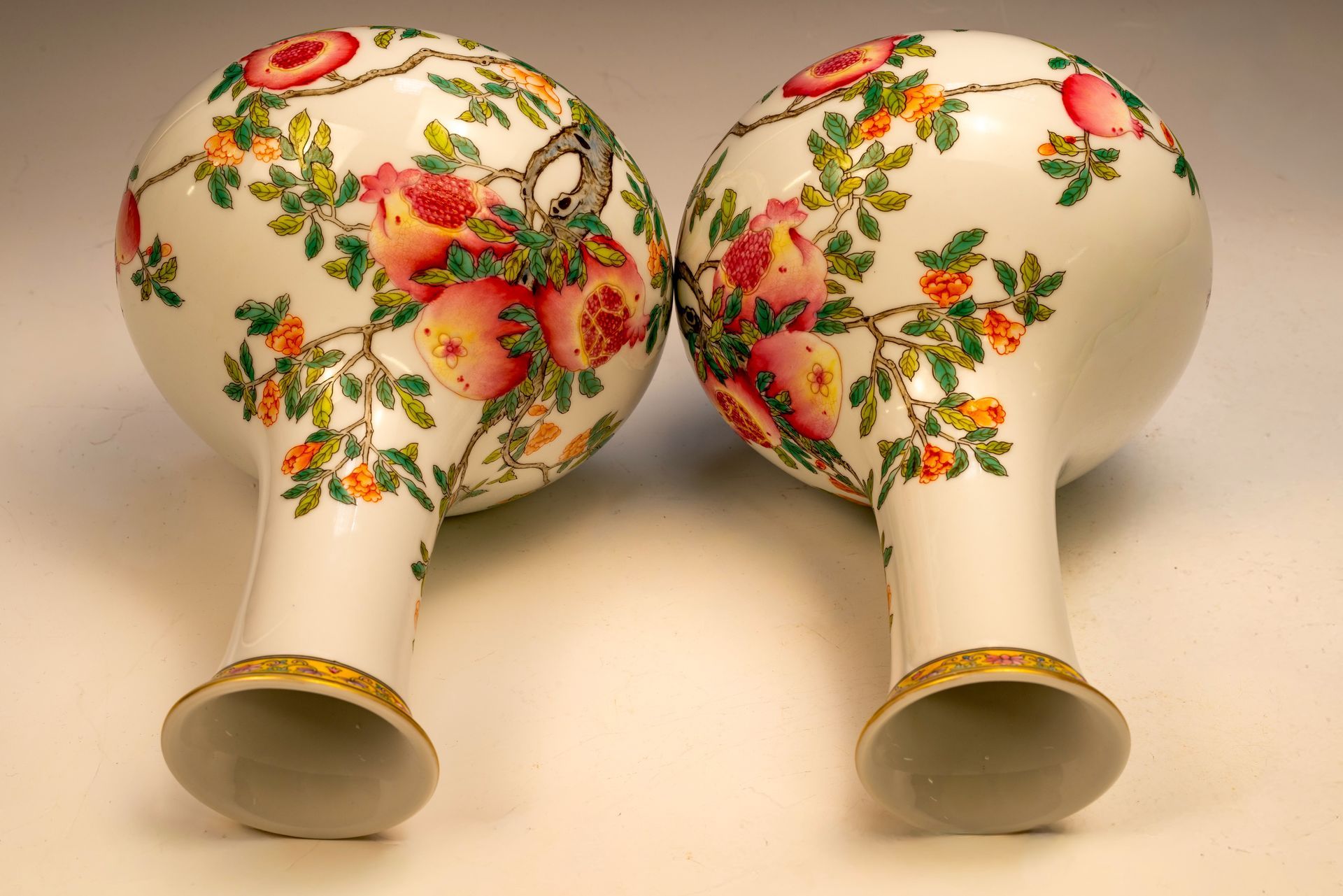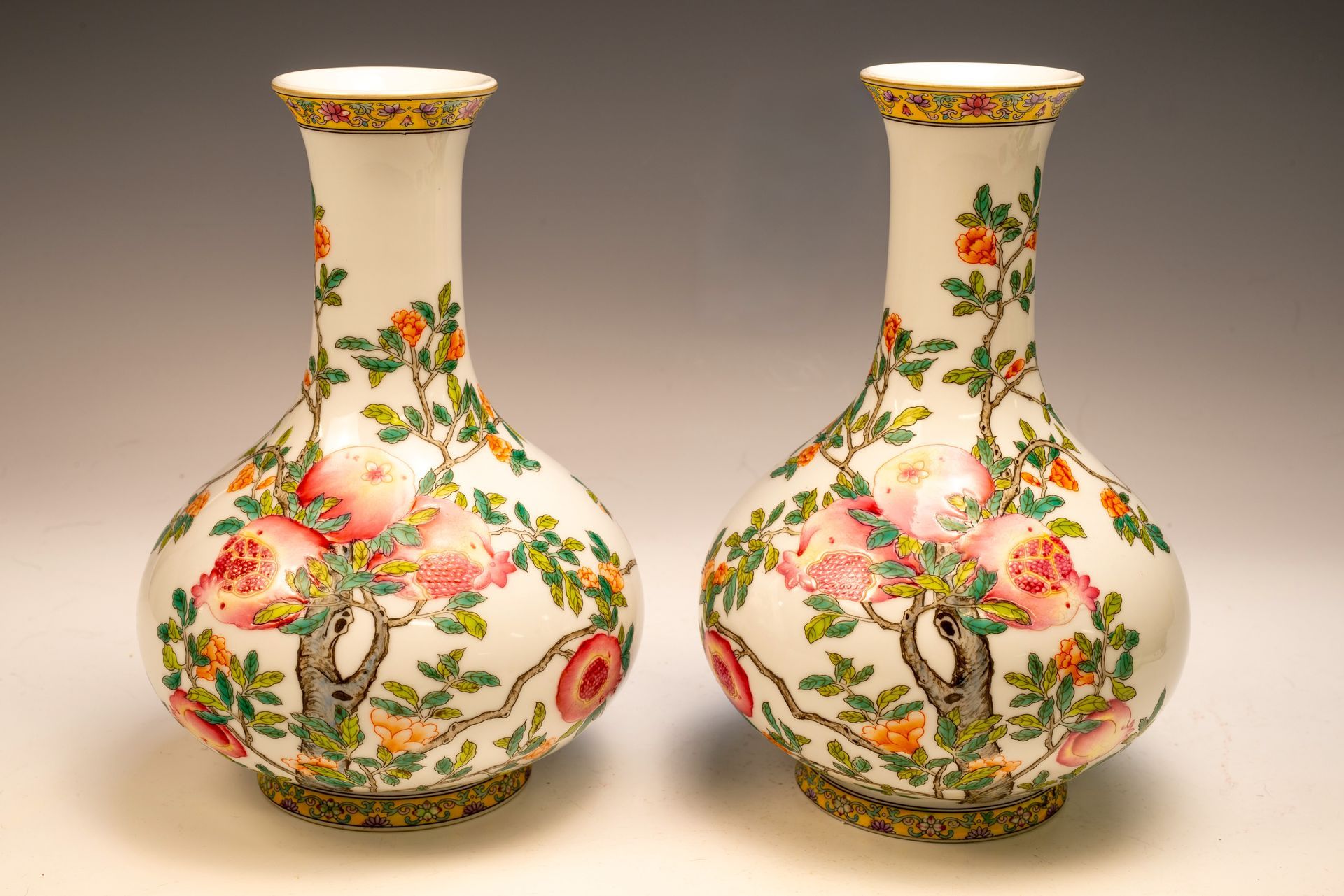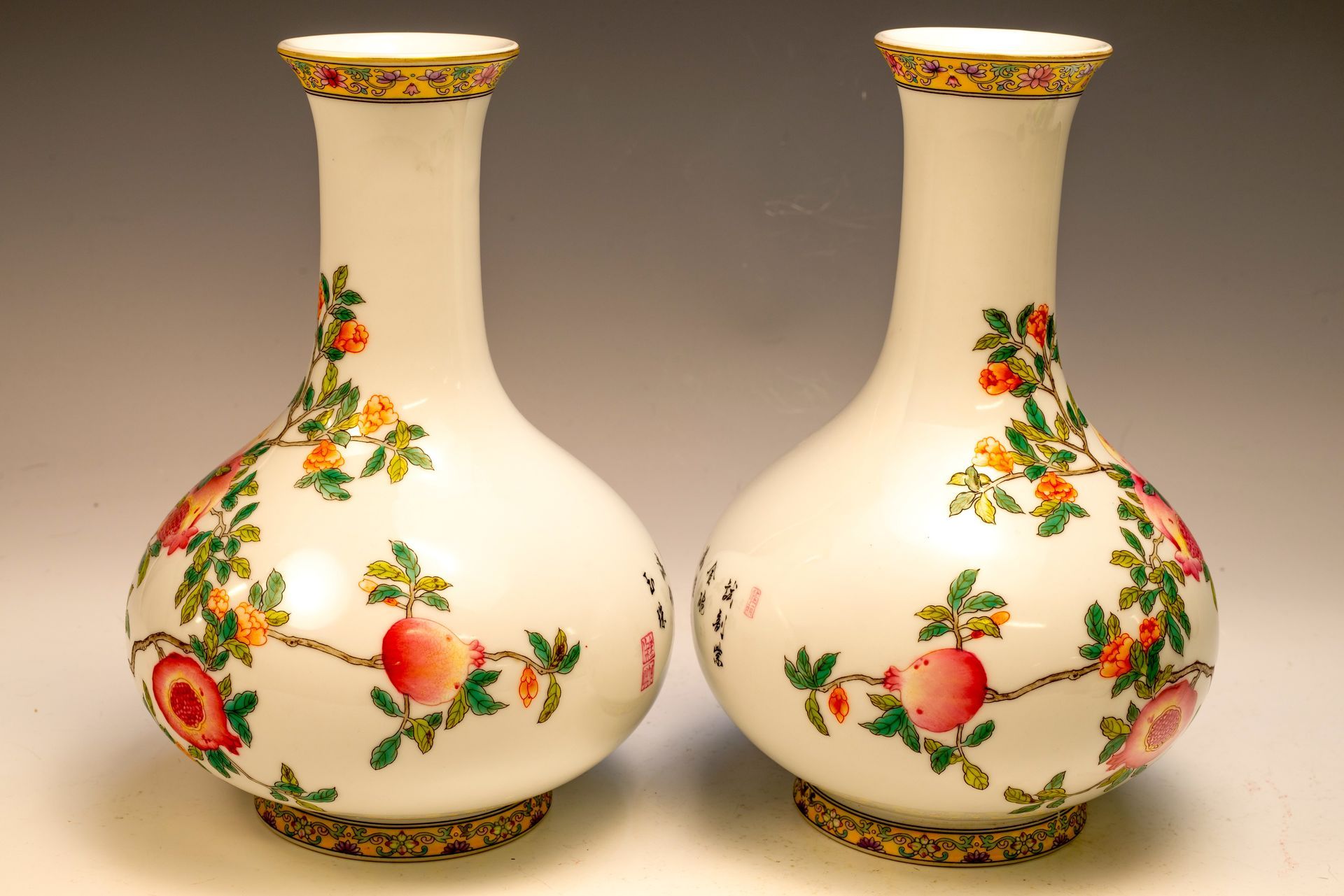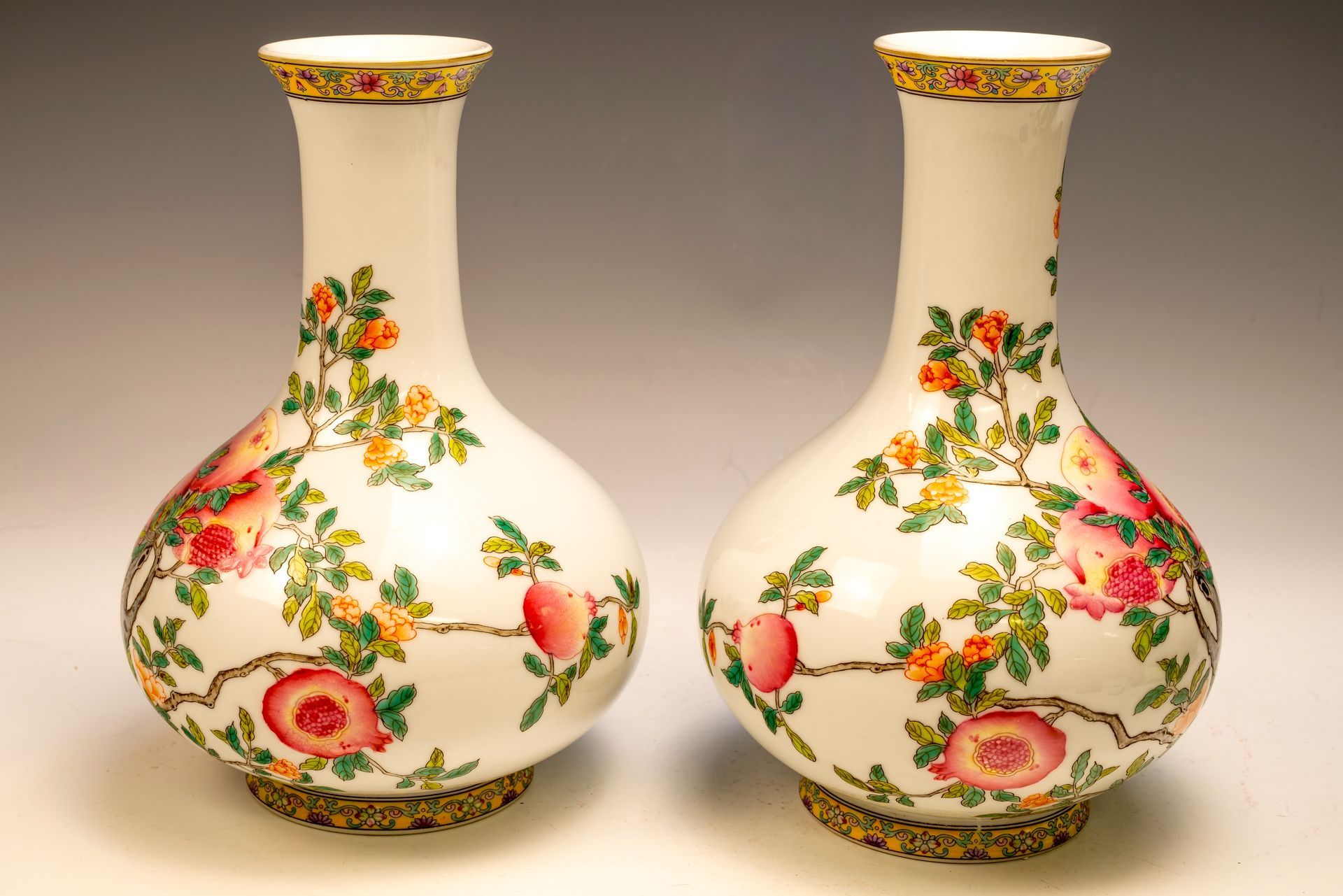 清朝時代の雍正柘榴梨形花瓶の傑作ペアは、どちらも当時の銘文が刻まれており、当時の風格を忠実に再現しています。精巧なフォルムに仕上げられたこれらの梨形花瓶は、鮮やかな色合いと精緻なディテールが特徴的なファランサイ(芙蓉菜)の彩色パレットを用いています。それぞれの花瓶には、枝、花、葉、実をつけたザクロの木が描かれています。これらの梨形花瓶は、ファランサイ(芙蓉菜)特有の芸術性を体現しています。それぞれの花瓶の底には、二重の正方形の中に青いエナメルで「雍正玉之」の四文字が刻まれており、品質と真正さの証となっています。これらの作品を特徴づける、細部までこだわったディテール、色彩バランス、そして陰影にご注目ください。素地には多少の剥がれが見られ、これは年代の証です。また、ファランサイによく見られる琺瑯のひび割れも見られます。色彩自体は驚くほど美しく保たれています。雍正窯の花瓶は、高さ約8.5インチです。. ppjrs