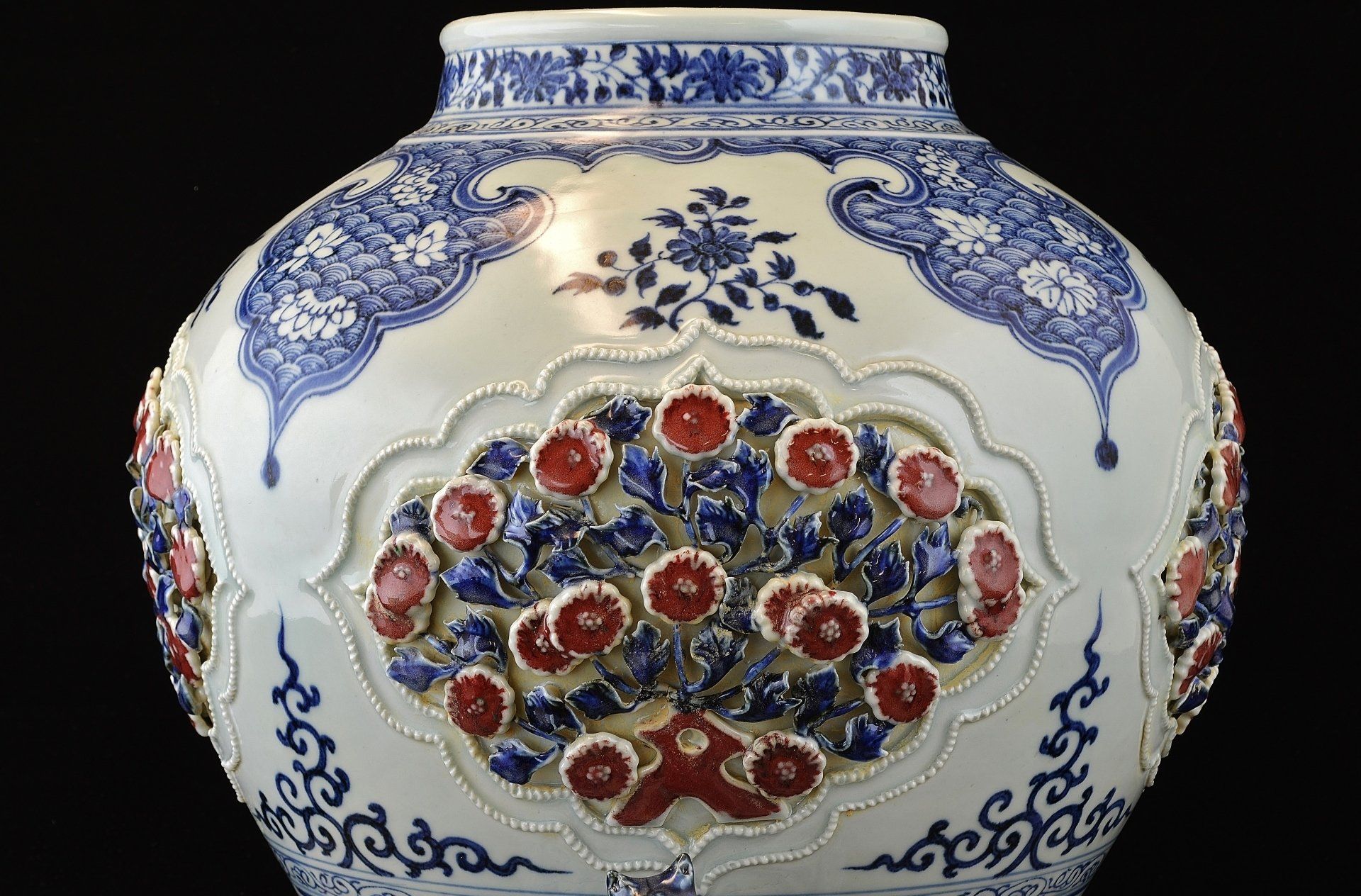 元代の青、白、赤の壺:花と葉の模様が施された4つのパネルを備えた一対の壺のうちの1つ
