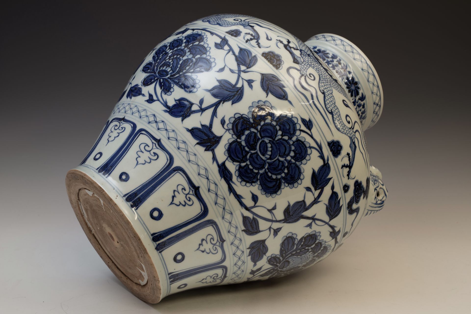 元代七段に龍と怪物のような把手が描かれた青白磁壺。この類まれな壺は、当時の洗練された絵画様式を特徴づけています。輸入されたサマリブルーコバルトを用いて作られたこの素材は、独特の黒みがかった色合いを呈しています。特に、釉薬の盛り上がりと堆積効果により、中国産のコバルト特有の茶色ではなく、黒い斑点や銀色の反射が見られます。輸入コバルトは500年以上入手不可能であったため、この特徴は壺の起源を示す重要な証拠となります。この壺は、元代の多くの壺に見られる典型的な特徴である二つの部分から構成されています。素地の剥がれの跡も、この壺が相当古いものであることを物語っています。壺の高さは約17 3/8インチです。ppjrs