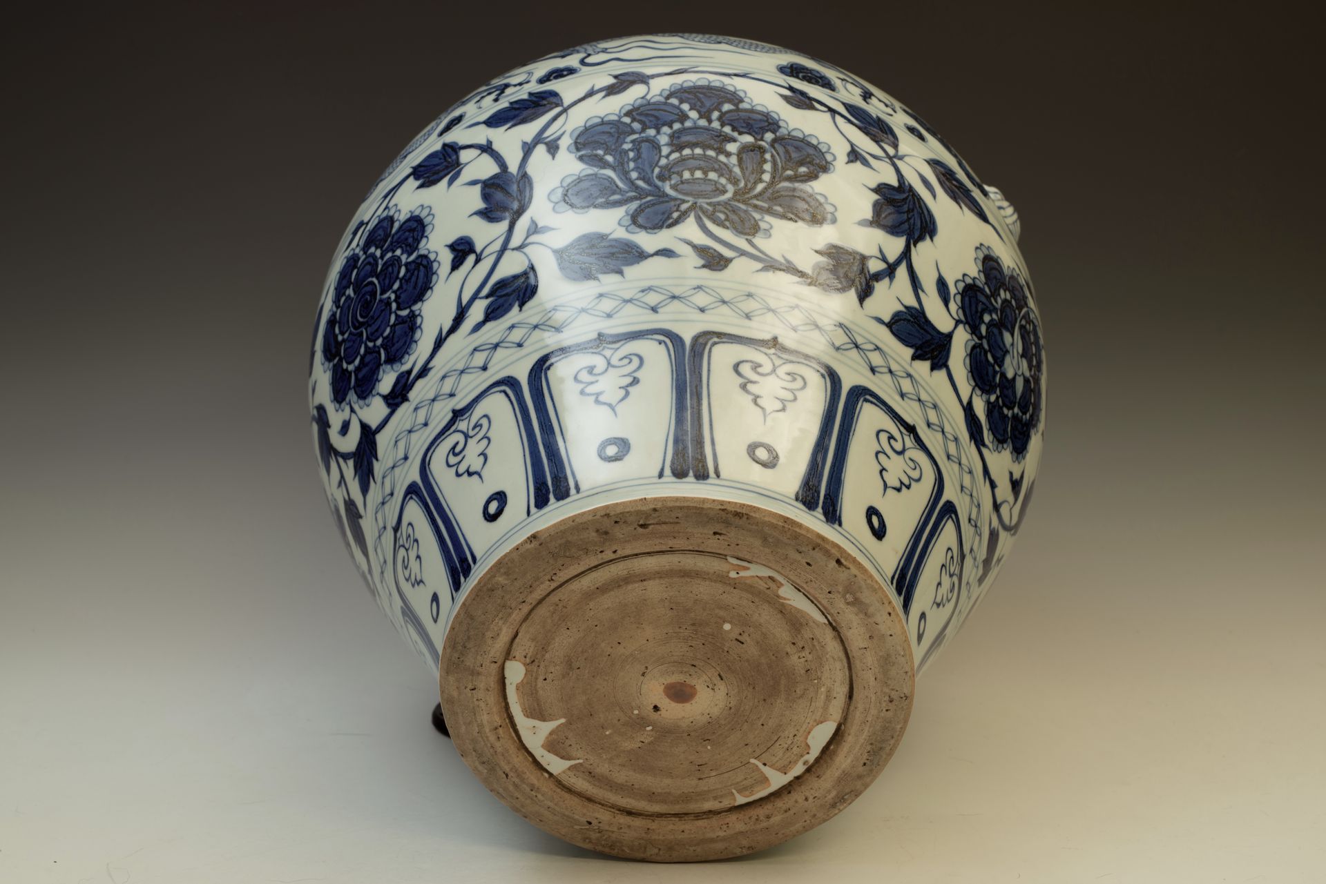 元朝時代の青白紅壺は、花や葉のモチーフが精巧に施され、特徴的な猫の頭頂部が特徴的です。この作品は2つの壺のうちの1つです。輸入されたサマリブルーコバルトで作られており、独特の黒っぽい色合いをしています。釉薬の表面に見られる堆積効果は、中国産コバルトの特徴である茶色ではなく、黒い斑点や銀色の光沢を示しています。この特徴は、この輸入コバルトが500年以上も入手不可能であったことの証です。さらに、素地の剥落が見られることからも、その年代がかなり古いことがわかります。壺の高さは約16 3/4インチです。ppjrs