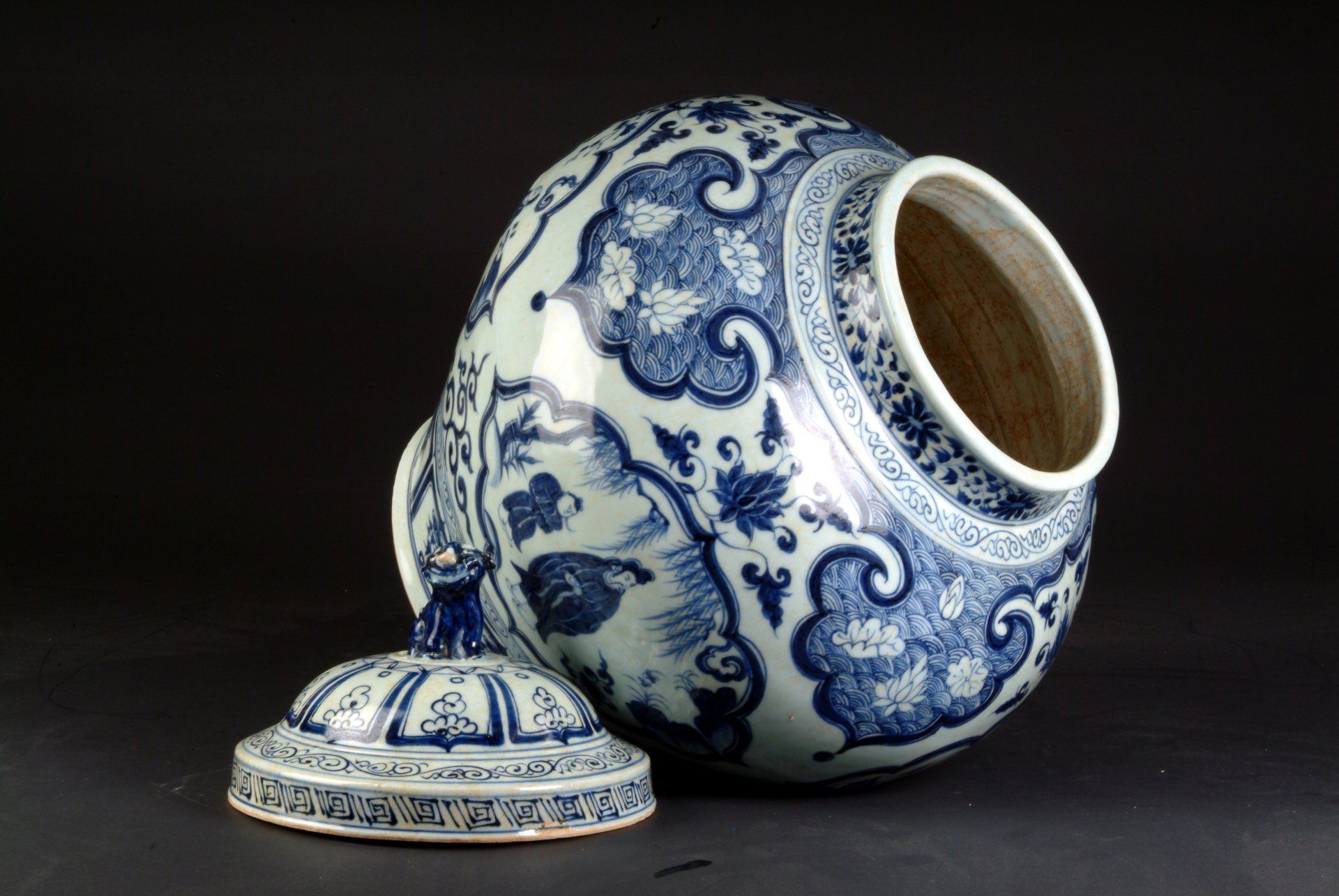 非常に大きな青と白の孔雀と牡丹のフラスコ